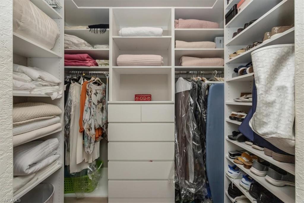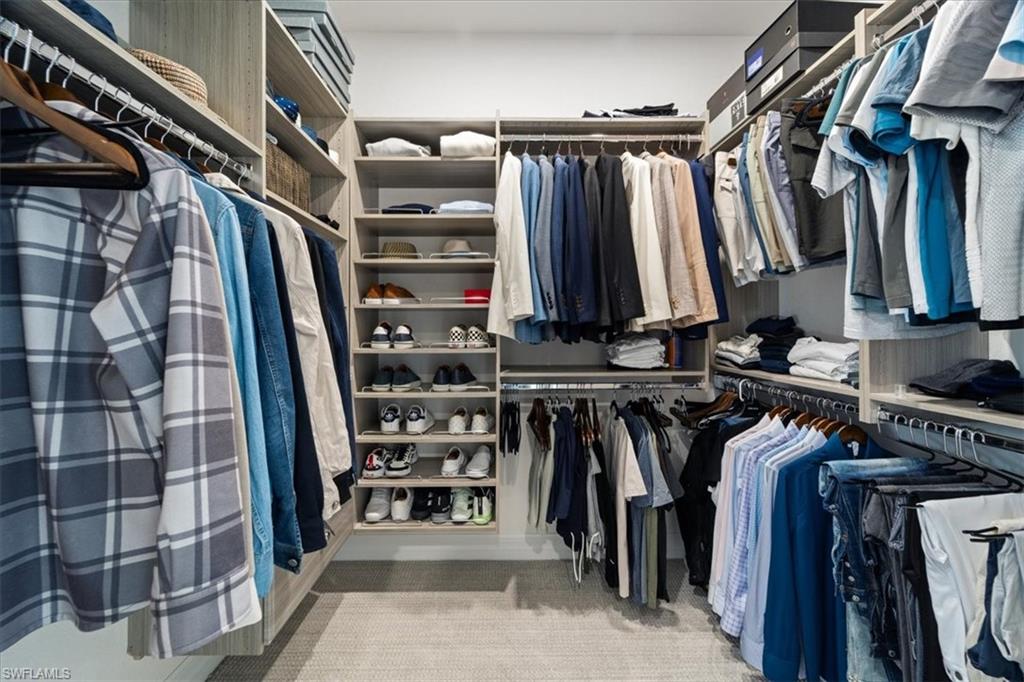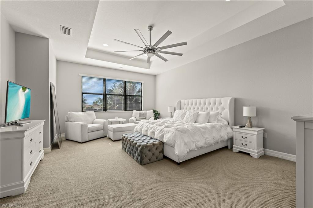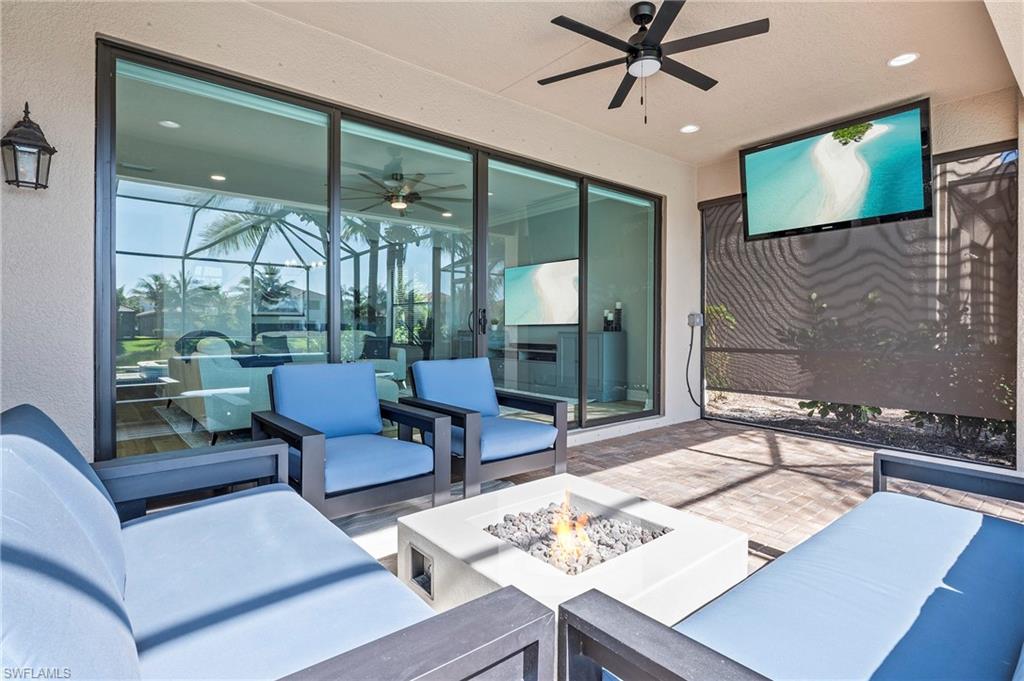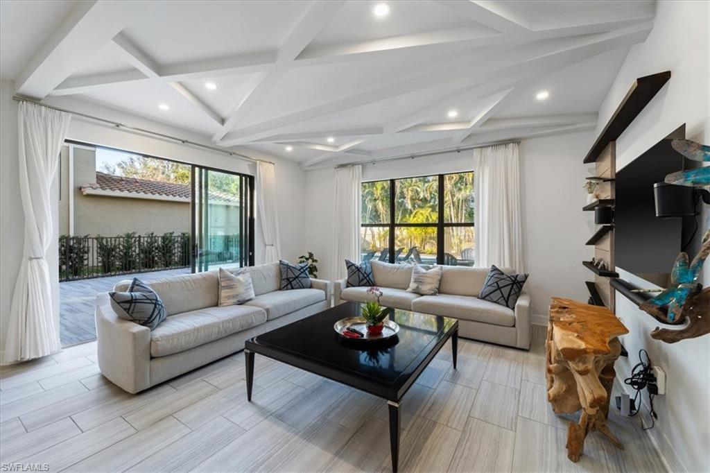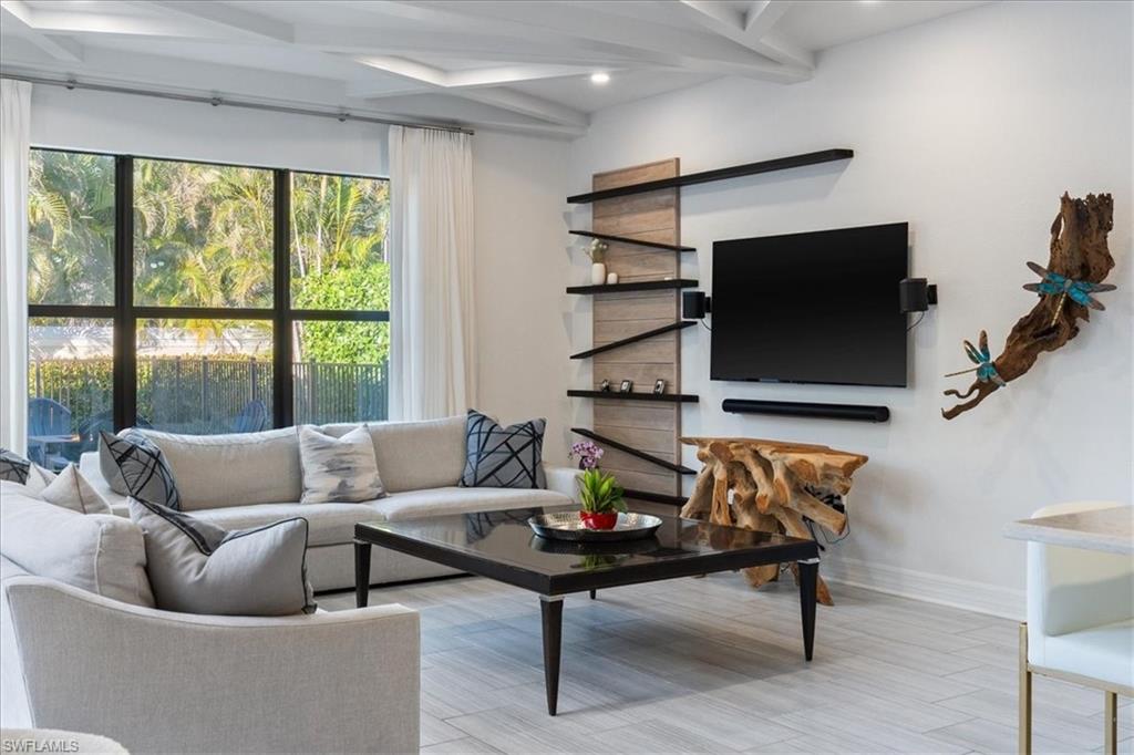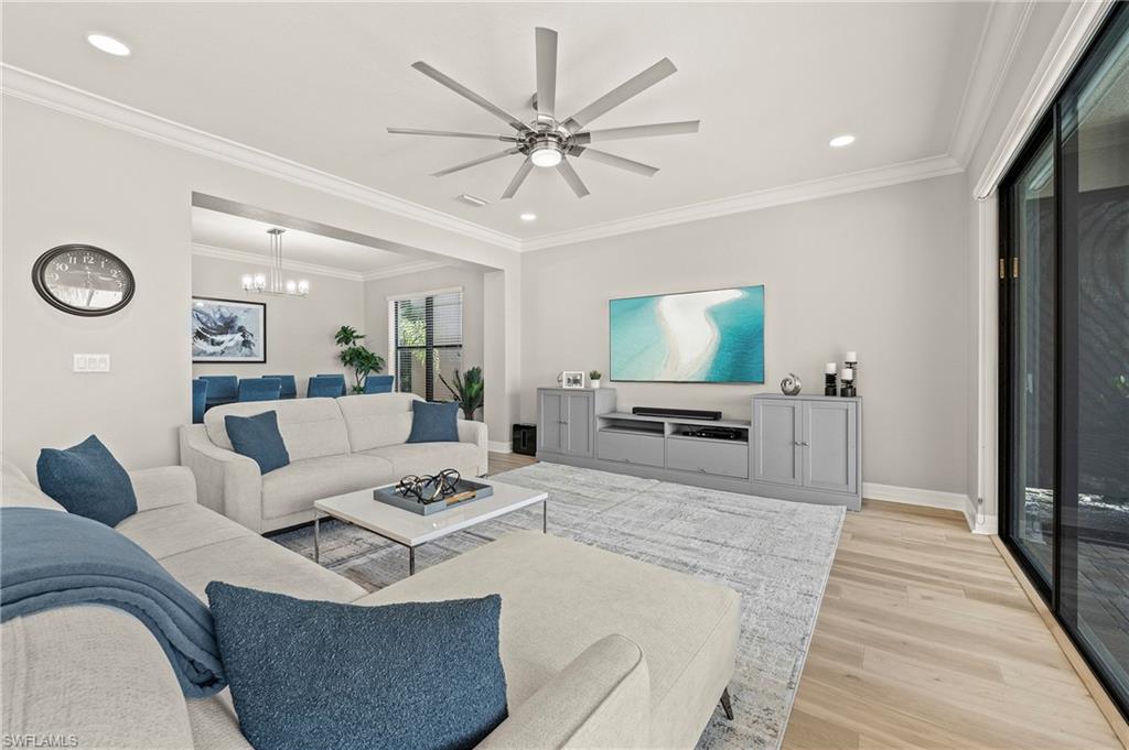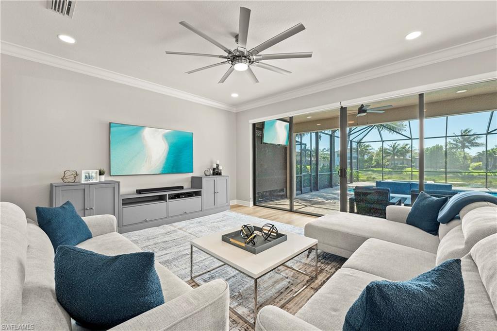 Professionally curated by Design West with over $300,000 in upgrades, this home showcases quality and style with custom coffered ceilings, elegant lighting, and premium finishes throughout. The open-concept layout blends everyday comfort with an entertainer’s flair featuring a custom media wall, and a built-in bar with wine cooler. There is meticulous attention to detail in the wall coverings, blinds and draperies which highlight the natural light and space. The kitchen offers quartz countertops, high-end appliances, and custom cabinetry with built-in pantry, and roll out drawers for smart, stylish storage. Every detail speaks to high end craftsmanship, from extensive woodwork around windows, doors, and mirrors, deep baseboards, crown molding, and intricate custom ceiling woodwork that elevate the entire space. All closets have been custom built as well. The owner’s suite is a true retreat with its custom ceiling and wall treatments. There are two fully built-out closets and a spacious spa-inspired bathroom that invites relaxation. Each guest suite enjoys its own private bath and wing for privacy. Throughout the home, custom window treatments—including silhouette shades and elegant drapery add warmth and privacy. All the bedrooms have remote powered blackout blinds. Step outside to a serene oasis with lush landscaping, a saltwater pool with a tranquil fountain, and a spacious covered lanai—perfect for year-round dining and entertaining. A whole house generator with 500 gallon propane tank, impact-rated windows and StormSmart hurricane screens provide peace of mind, while the epoxy-coated garage floor with built-in storage completes this one-of-a-kind offering. Marbella Isles offers world-class amenities and is conveniently located in the heart of Naples, in a great school district, just minutes from beaches, shopping, and downtown. Amenities include active pickleball & tennis programs, bocce courts, a resort-style pool, separate pool & play area for kids, world-class clubhouse with a fitness center, half-court basketball, & kitchen and games rooms. The community is meticulously maintained, has a solid HOA board and strong cash reserves.
