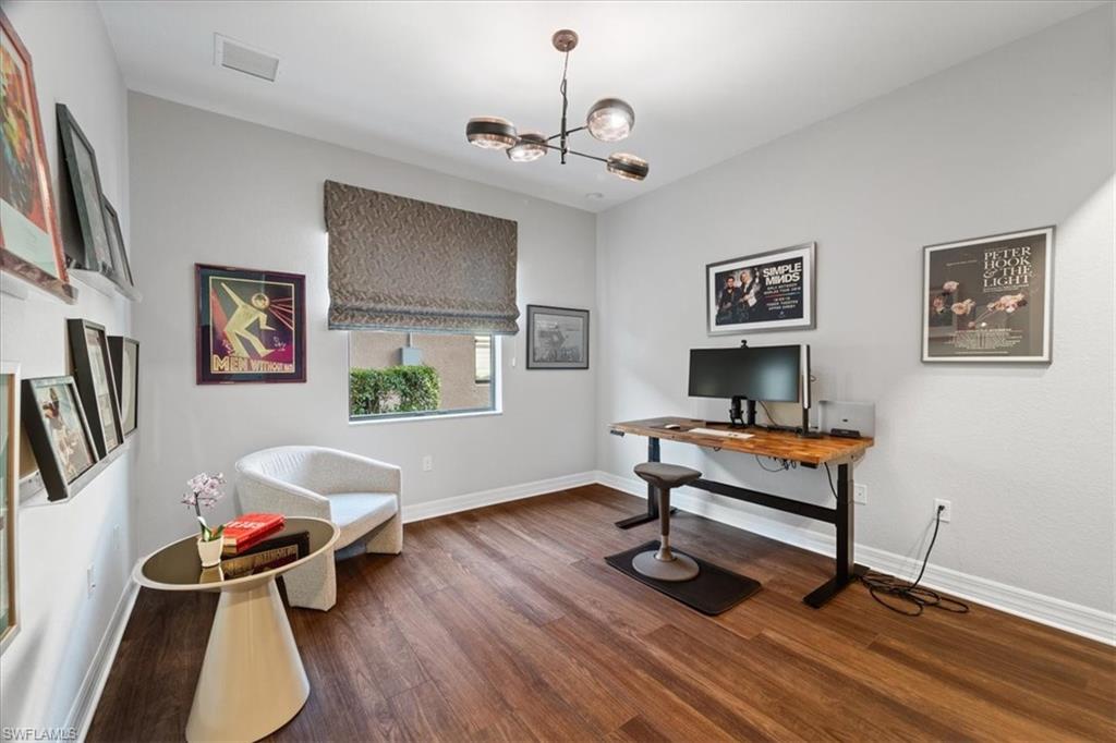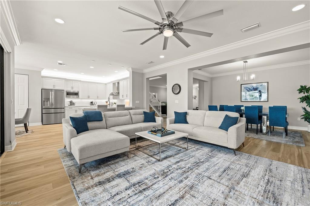 Amazing Value! Price just reduced! Welcome to this stunning 5-bedroom, 4-bathroom plus den home located in the luxurious gated enclave of Marbella Isles. Thoughtfully designed with both comfort and elegance in mind, this spacious two-story home boasts an open floorplan, wide-plank wood flooring, and crown molding throughout the first floor, creating a warm and inviting atmosphere. A bedroom and full bathroom are conveniently located on the first floor, providing flexibility for modern living. The heart of the home is the beautifully appointed kitchen, featuring custom white cabinetry, granite countertops, stainless steel appliances, and ample storage for all your culinary needs. Upstairs, a versatile flex space offers endless possibilities - it’s perfect as a game room, library, or home office. The primary suite is a true retreat, complete with a tray ceiling, walk-in closet with custom built-ins, and a luxurious ensuite bath featuring dual sinks, a large corner soaking tub, and an oversized glass-enclosed shower. Sliding glass doors from the main living area open to a serene caged lanai, where a sparkling saltwater pool and integrated spa are surrounded by mature landscaping for ultimate privacy - ideal for relaxing or entertaining. Marbella Isles is known for its exceptional amenities, including a clubhouse with a full-sized indoor basketball court, game rooms, fitness center, and community spaces for social gatherings. Outdoors, residents enjoy tennis courts, pickleball, and a resort-style pool with a water play area. Ideally located in the heart of Naples, this home offers easy access to world-class dining, shopping, golf courses, entertainment, and the white-sand beaches. This is Florida living at its finest.