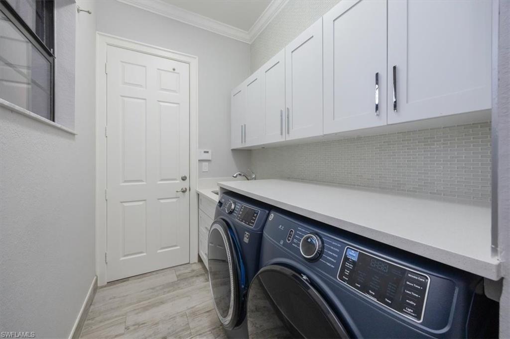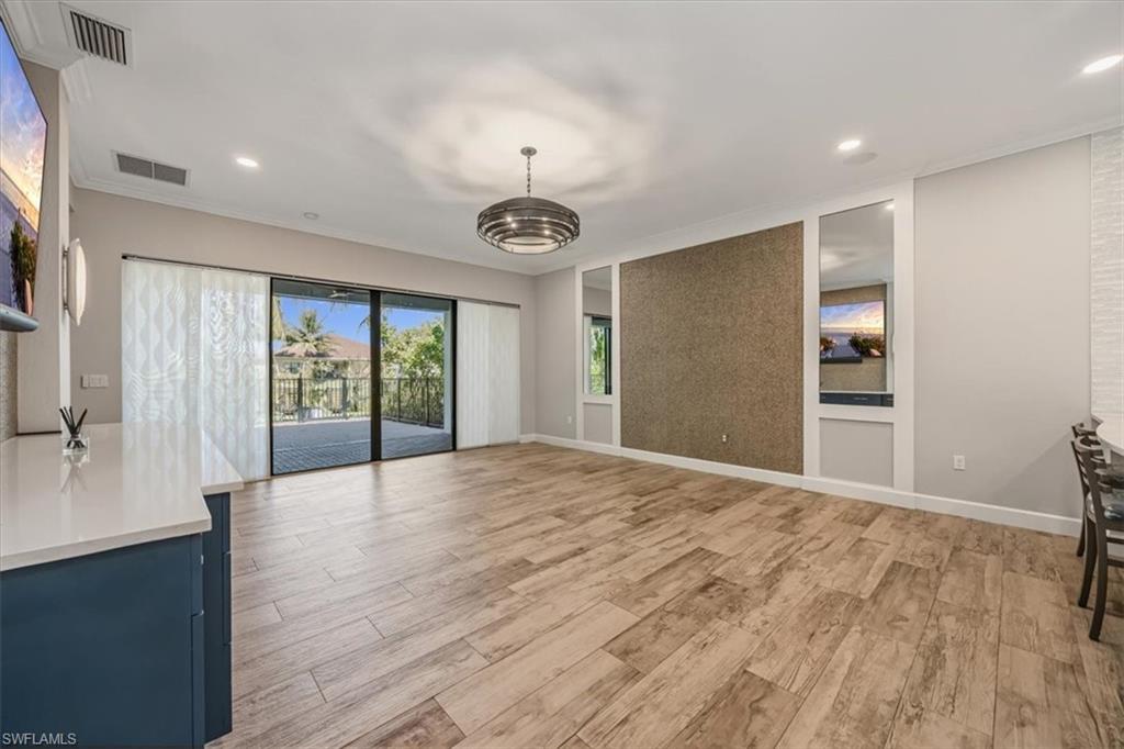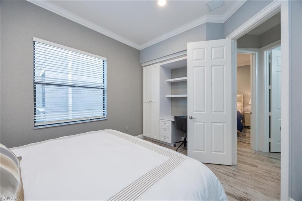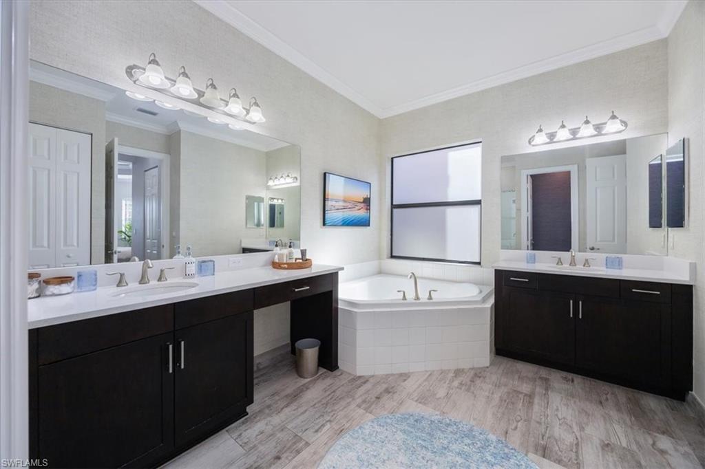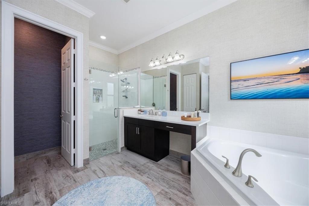 Amazing Value! Price just reduced! Welcome to this stunning 5-bedroom, 4-bathroom plus den home located in the luxurious gated enclave of Marbella Isles. Thoughtfully designed with both comfort and elegance in mind, this spacious two-story home boasts an open floorplan, wide-plank wood flooring, and crown molding throughout the first floor, creating a warm and inviting atmosphere. A bedroom and full bathroom are conveniently located on the first floor, providing flexibility for modern living. The heart of the home is the beautifully appointed kitchen, featuring custom white cabinetry, granite countertops, stainless steel appliances, and ample storage for all your culinary needs. Upstairs, a versatile flex space offers endless possibilities - it’s perfect as a game room, library, or home office. The primary suite is a true retreat, complete with a tray ceiling, walk-in closet with custom built-ins, and a luxurious ensuite bath featuring dual sinks, a large corner soaking tub, and an oversized glass-enclosed shower. Sliding glass doors from the main living area open to a serene caged lanai, where a sparkling saltwater pool and integrated spa are surrounded by mature landscaping for ultimate privacy - ideal for relaxing or entertaining. Marbella Isles is known for its exceptional amenities, including a clubhouse with a full-sized indoor basketball court, game rooms, fitness center, and community spaces for social gatherings. Outdoors, residents enjoy tennis courts, pickleball, and a resort-style pool with a water play area. Ideally located in the heart of Naples, this home offers easy access to world-class dining, shopping, golf courses, entertainment, and the white-sand beaches. This is Florida living at its finest.