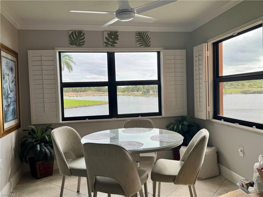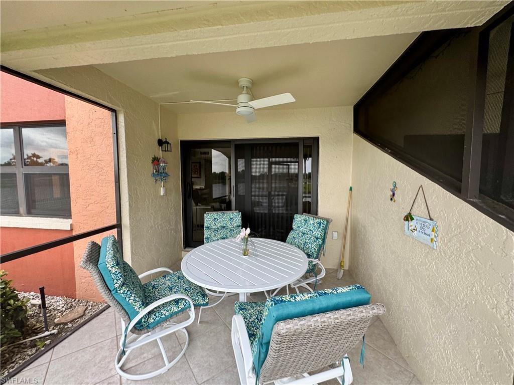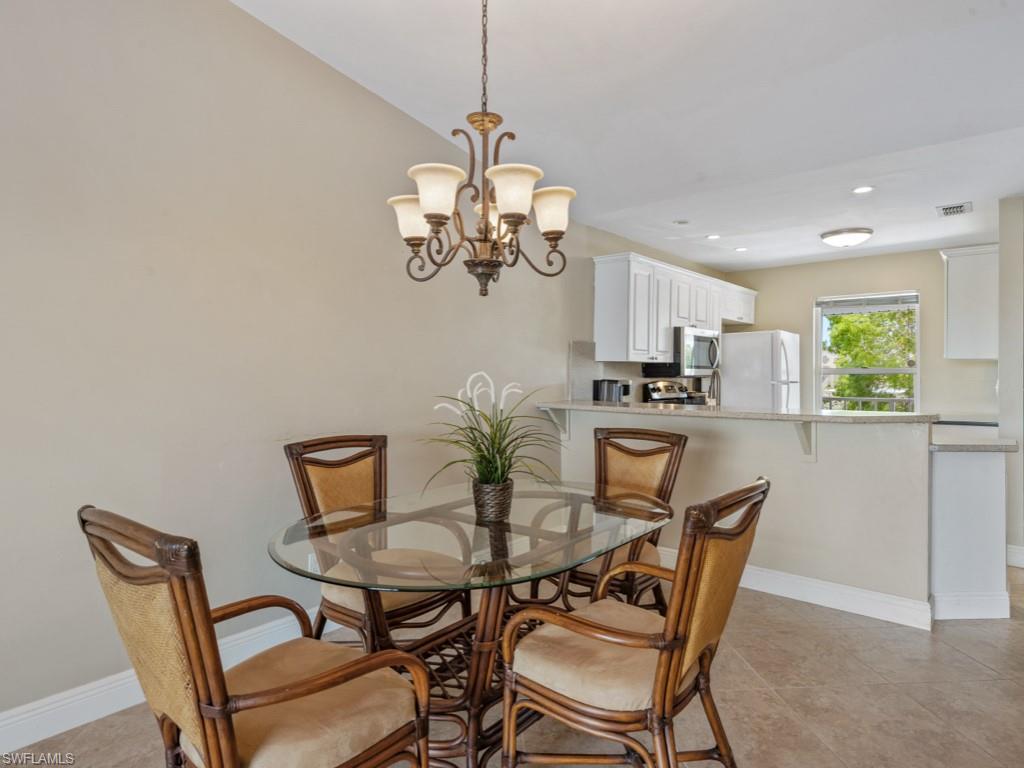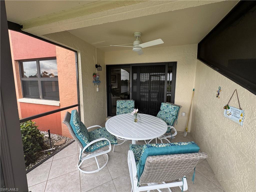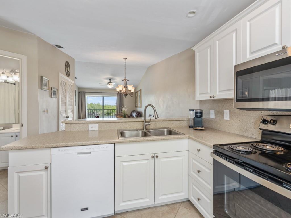 Welcome to one of the finest views in Tropic Schooner. This beautifully updated first-floor condo offers exceptional privacy and a stunning panorama of the wide lake, peaceful water feature, and the golf course beyond. The screened-in lanai is perfectly positioned for daily wildlife viewing, and the living room’s patio sliders create effortless indoor–outdoor living. Inside, the home features tile flooring throughout and a remodeled, modern kitchen in 2025 with quartz countertops, pull-out cabinets, a spacious breakfast bar, and an open layout that flows seamlessly into the dining and living areas. The dining room is framed by two large windows showcasing the lake, filling the space with natural light. The floor plan includes two comfortable bedrooms, two full updated baths, and convenient in-unit laundry. AC 2021, H2O Heater 2023. Lighting, doors & ceiling fans 2024. Impact glass adds durability and peace of mind. Parking is conveniently located, and the community pool is only steps away—close enough for easy enjoyment while remaining quiet and private. Tropic Schooner provides a well-rounded lifestyle with two pools, pickleball and tennis courts, bocce, shuffleboard, a clubhouse, and a car-wash station. All of this is ideally situated just 3 miles from Marco Island and 12 miles from Downtown Naples/5th Ave. This is a wonderful opportunity to enjoy Southwest Florida living in a well-maintained, amenity-rich community—all at a valued price.