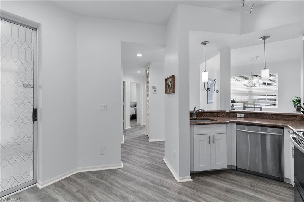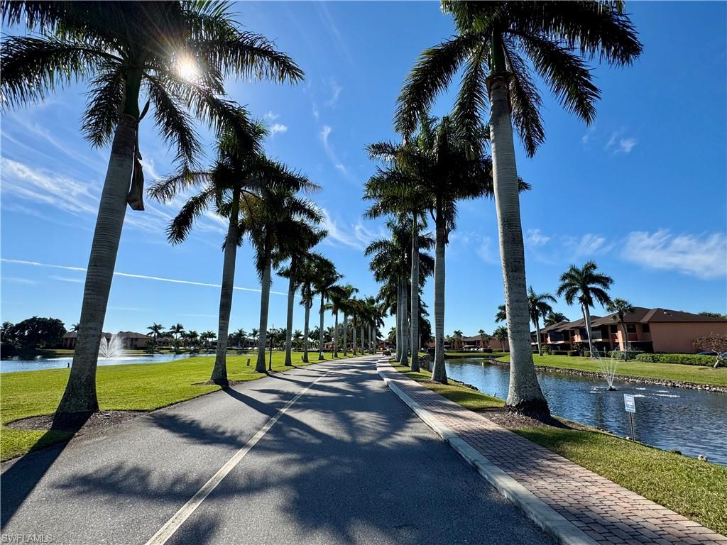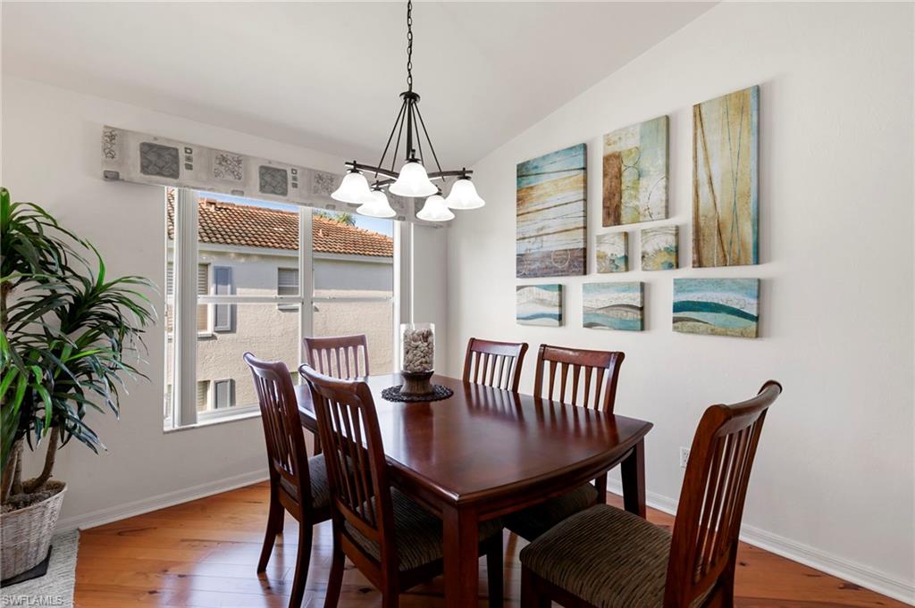 Where in Naples can you get this serene water views and outstanding location at this price point? One of the best locations in all of Mainsail - Second Floor End unit right next to the pool and at the widest water view. Interior features include vinyl wood look flooring and tile through out, open kitchen, coffee bar, vaulted ceilings, and updated bath. A favorite feature of this condo is the spacious lanai with all weather windows. Sunny side window is tinted and has roller shades. Washer and dryer are on the lanai along with extra storage. Hurricane windows. The Mainsail community offers 2 pools, tennis and pickle ball, and beautiful views.