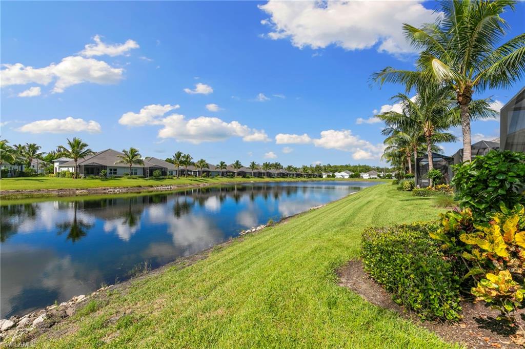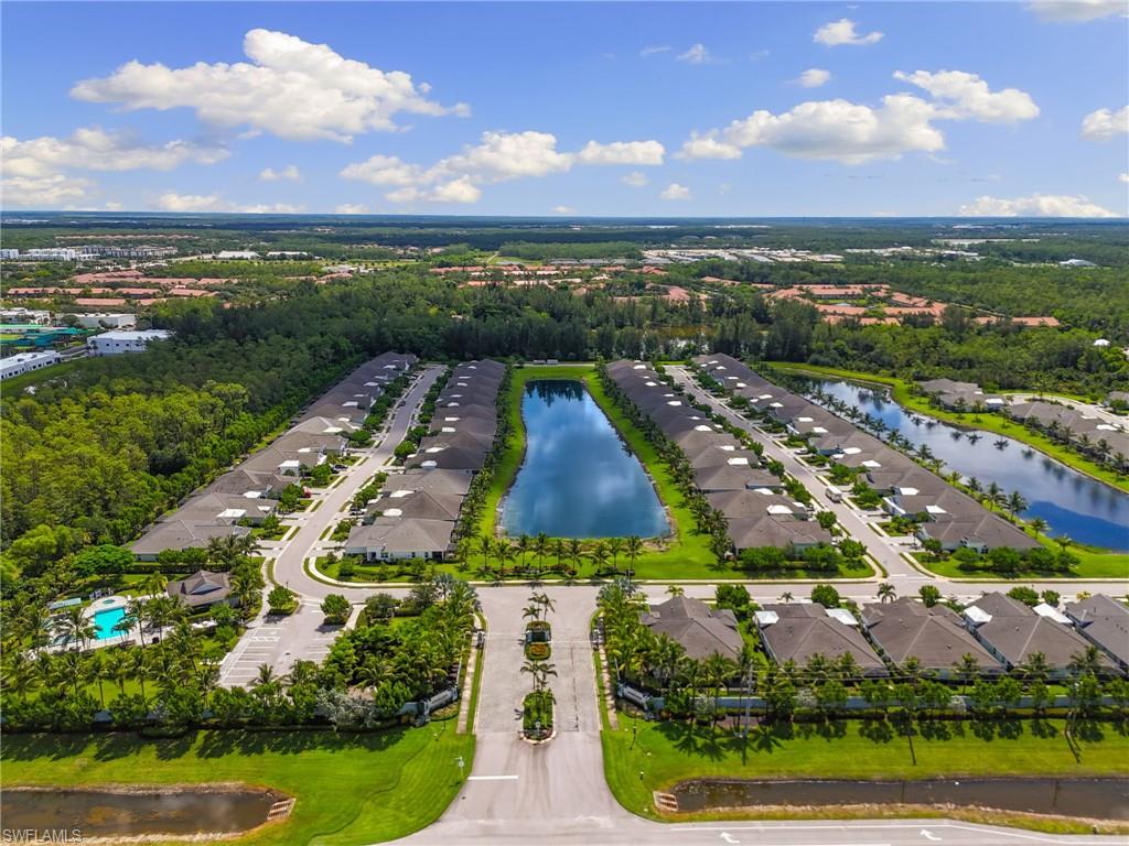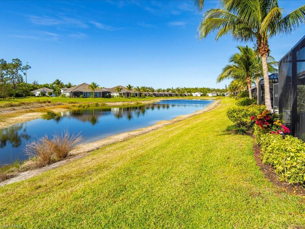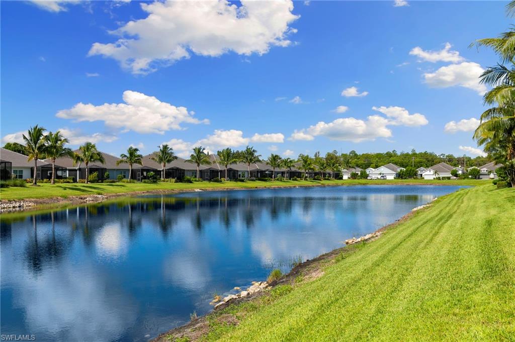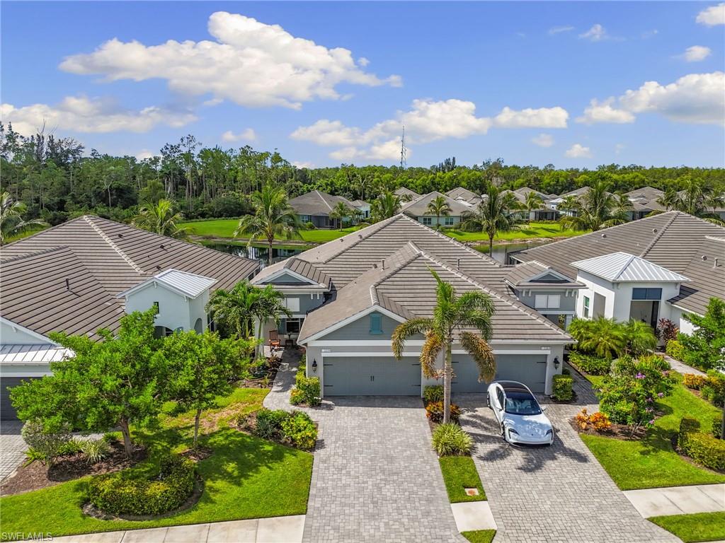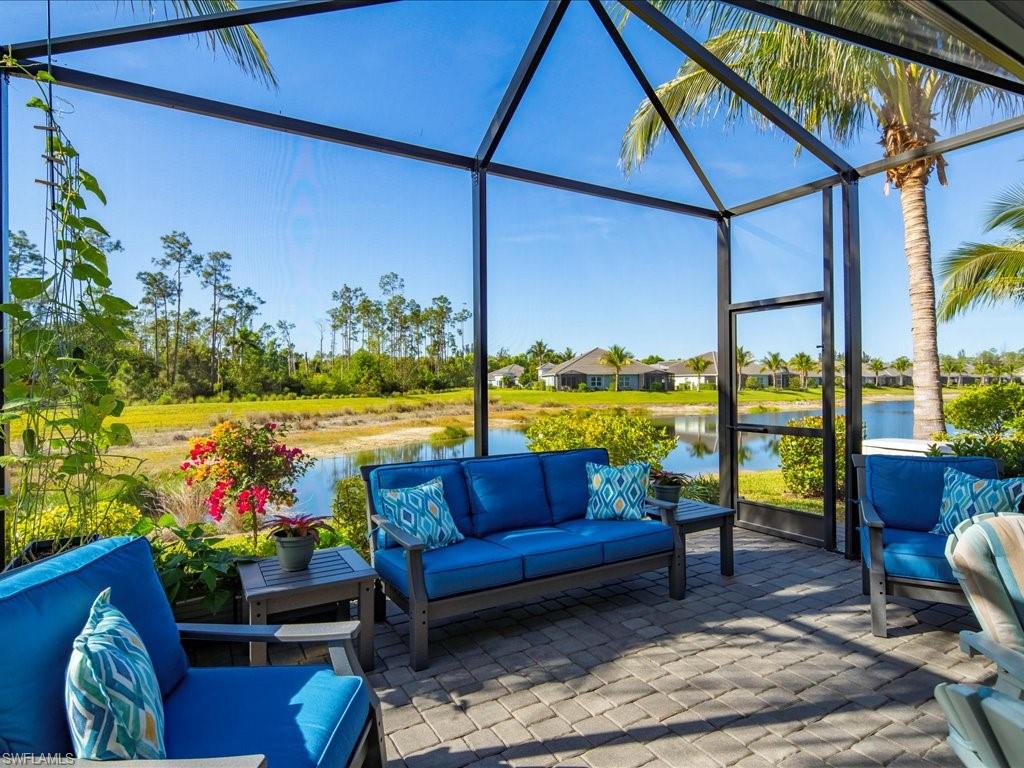 This one's a must see! Built in the later half of 2022 and rarely used corner lot. Contemporary colors and styling. Bright, spacious, 3 bedroom plus den, 2 bath, single level attached villa. Living area sliders open onto an extended screened lanai with leas scenic lake view. Front porch entry leads into a bright open floor plan with upgrades throughout including gourmet kitchen package, kitchen island, quartz countertops, 36" cabinets, stainless steel appliances, tile floors throughout, 8' doors, impact windows/doors, natural gas, shelved pantry, laundry room with shelving and cabinets and so much more. No CDD. Affordable HOA dues which include TV and internet, lawn care and irrigation. Situated in a FEMA X-zone means lower insurance costs and increased peace of mind. Enjoy the convenience of being only minutes from the heart of downtown Naples with all the amenities Naples living has to offer. Come relax in a peaceful gated community with pool and spa, clubhouse and even a dog park. Just take a look and you'll know you want to be here!