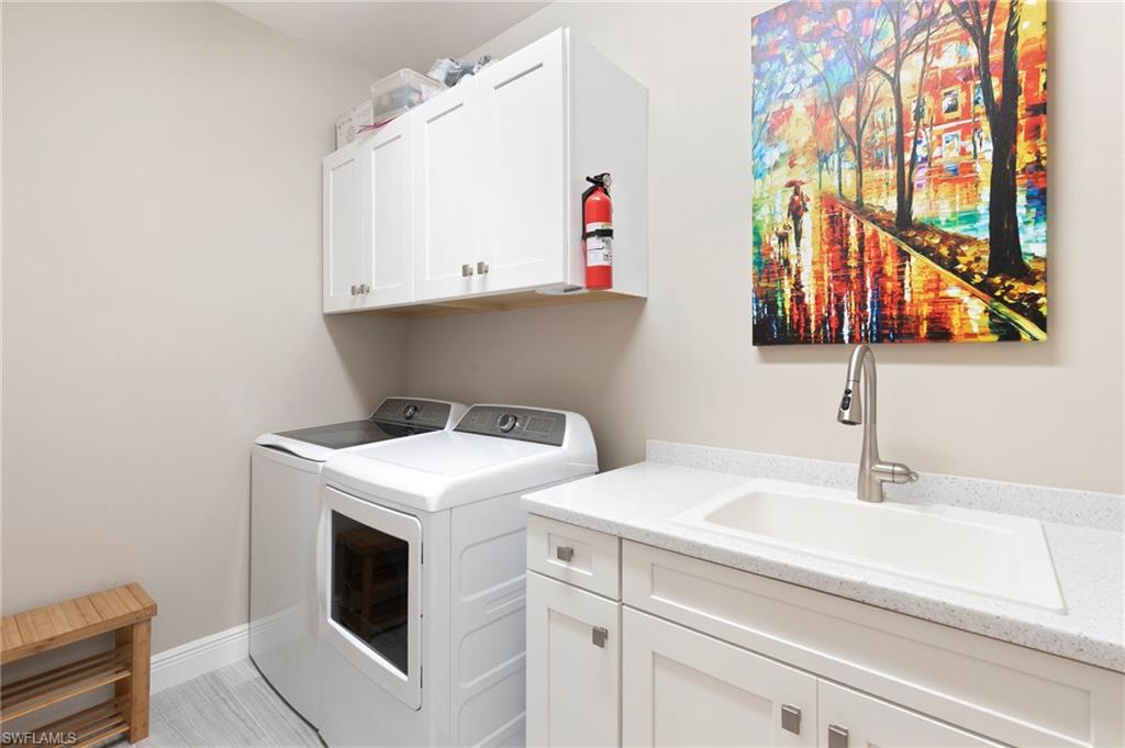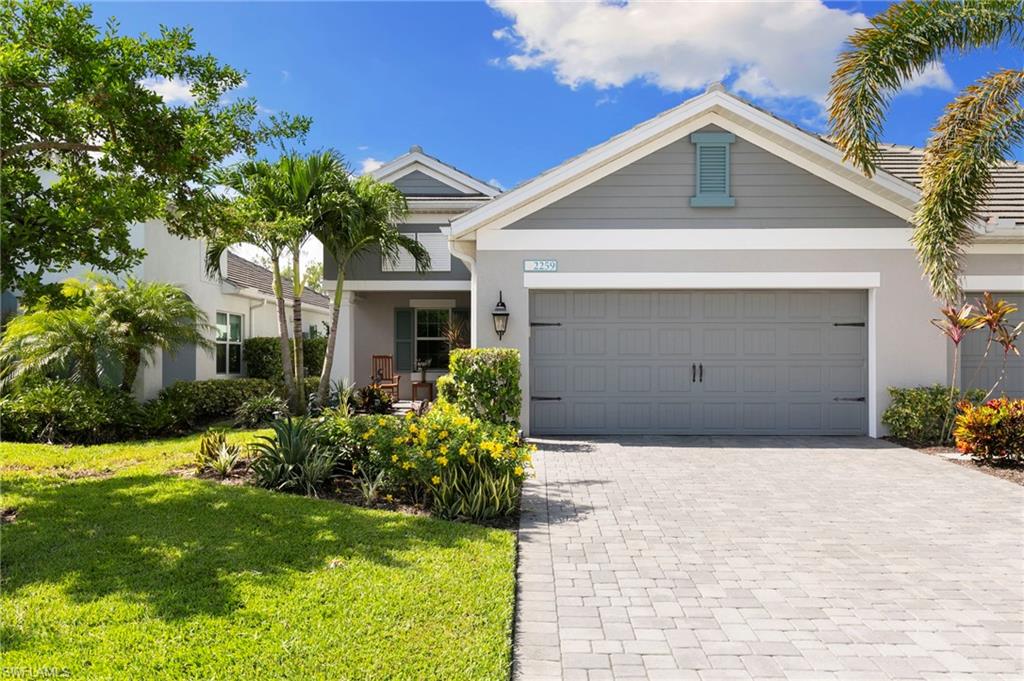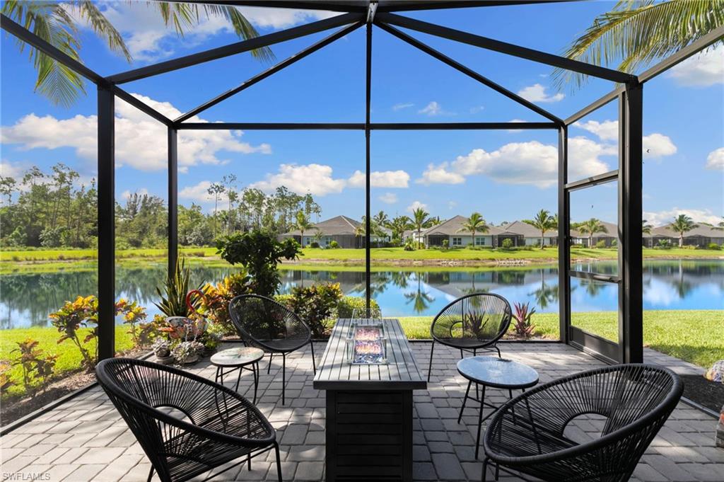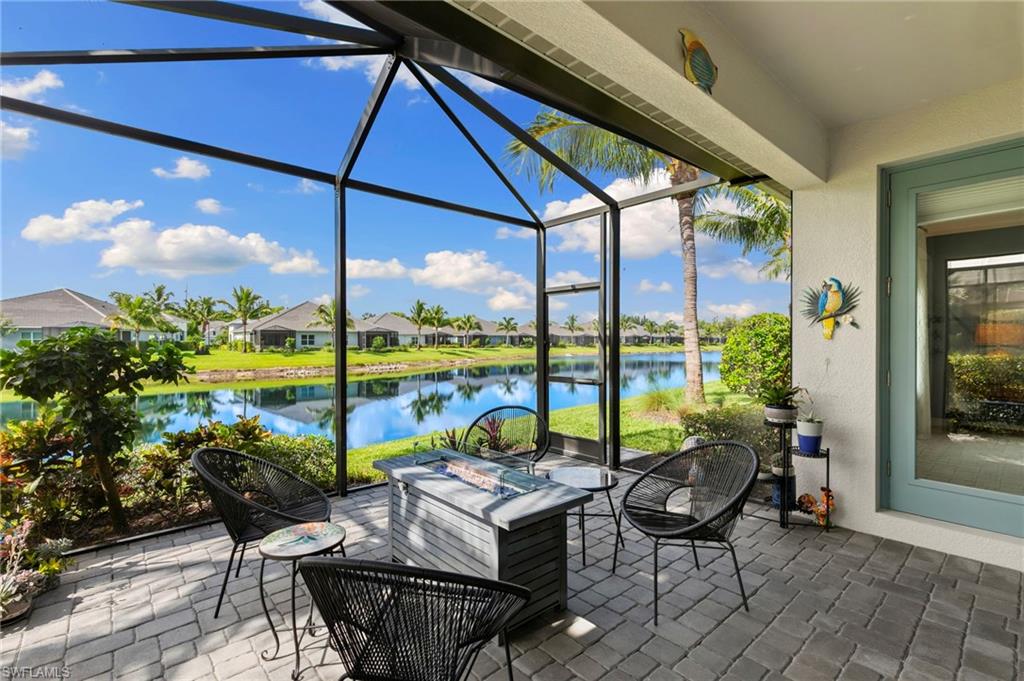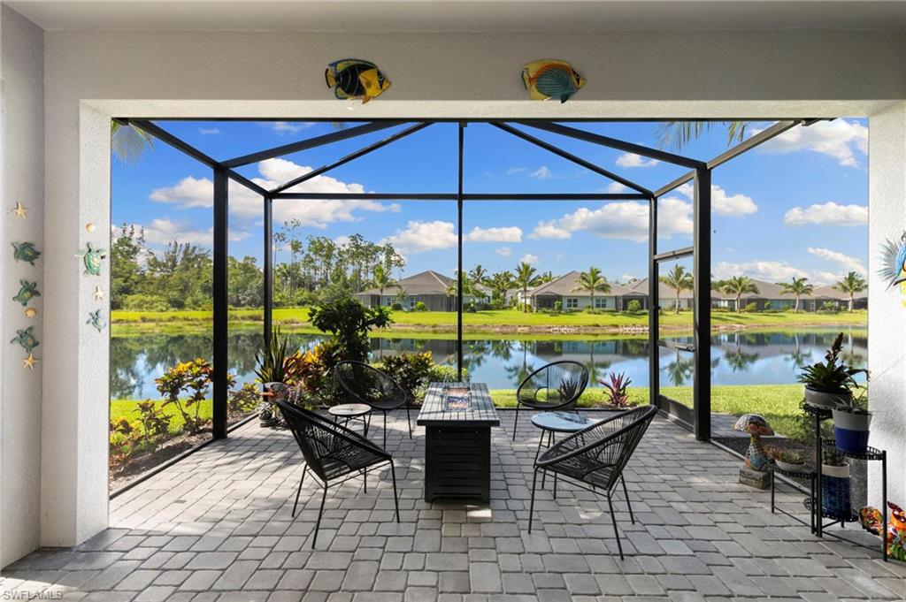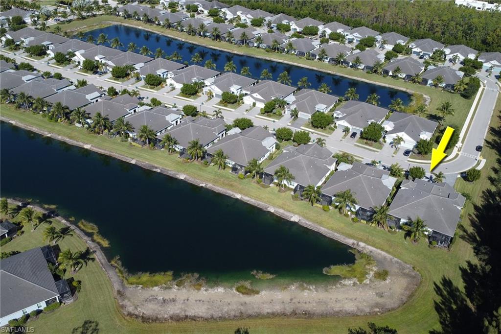 This one's a must see! Built in the later half of 2022 and rarely used corner lot. Contemporary colors and styling. Bright, spacious, 3 bedroom plus den, 2 bath, single level attached villa. Living area sliders open onto an extended screened lanai with leas scenic lake view. Front porch entry leads into a bright open floor plan with upgrades throughout including gourmet kitchen package, kitchen island, quartz countertops, 36" cabinets, stainless steel appliances, tile floors throughout, 8' doors, impact windows/doors, natural gas, shelved pantry, laundry room with shelving and cabinets and so much more. No CDD. Affordable HOA dues which include TV and internet, lawn care and irrigation. Situated in a FEMA X-zone means lower insurance costs and increased peace of mind. Enjoy the convenience of being only minutes from the heart of downtown Naples with all the amenities Naples living has to offer. Come relax in a peaceful gated community with pool and spa, clubhouse and even a dog park. Just take a look and you'll know you want to be here!
