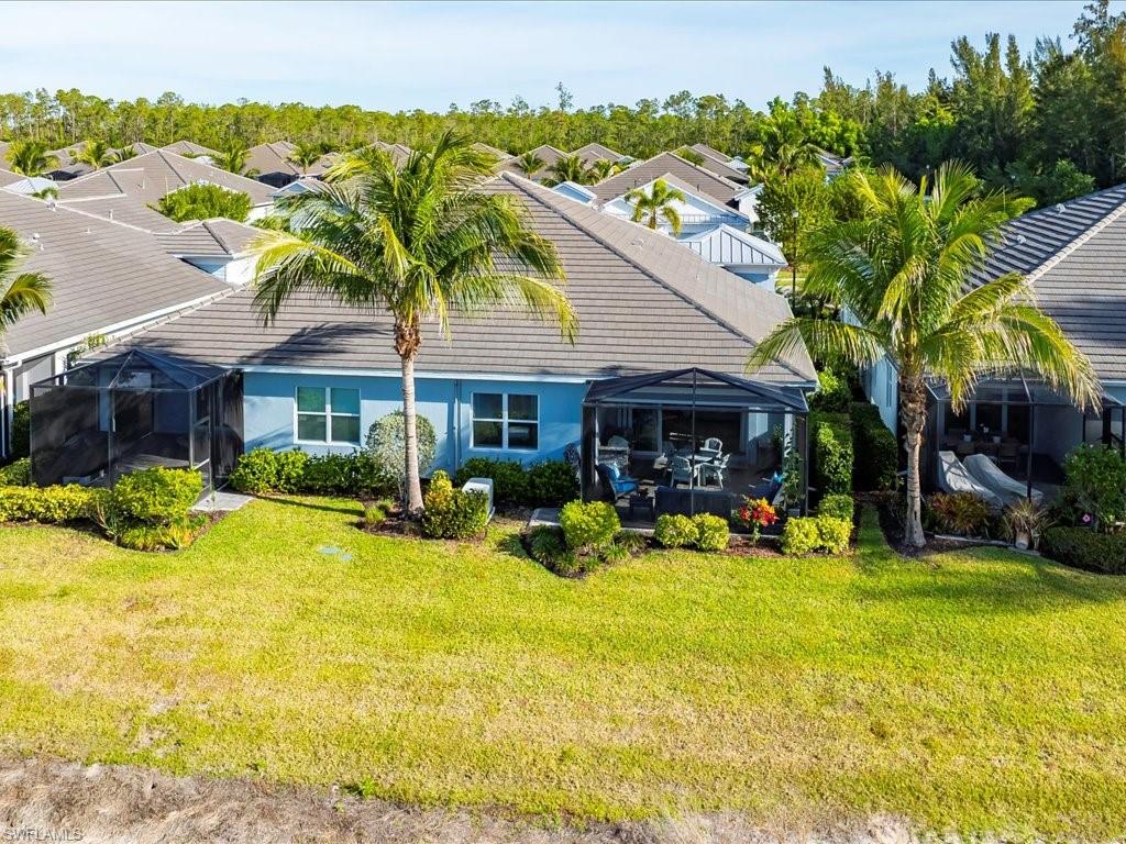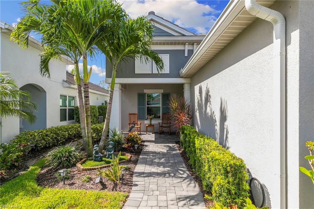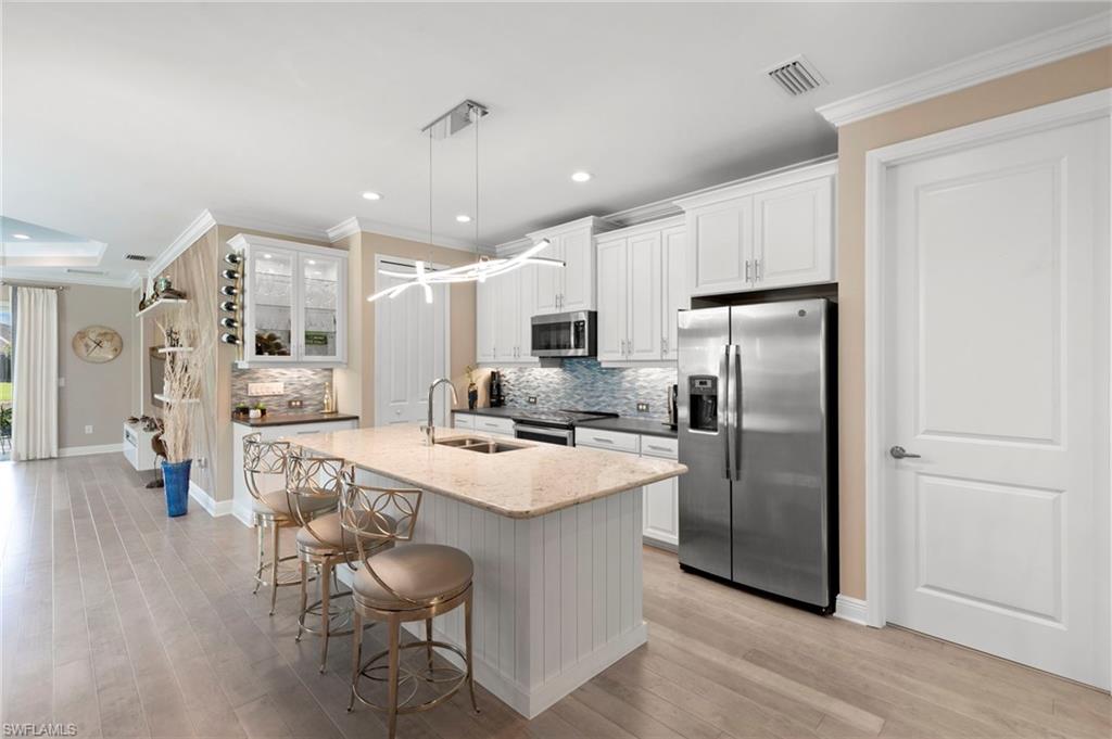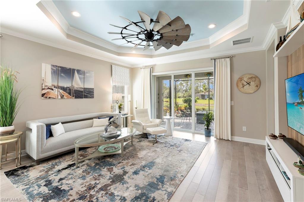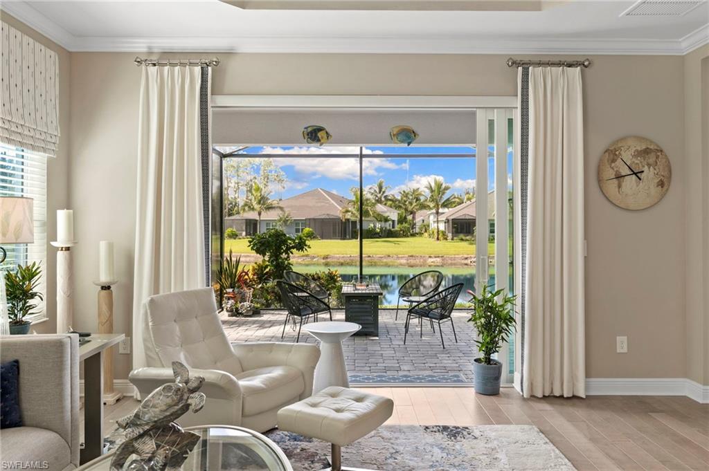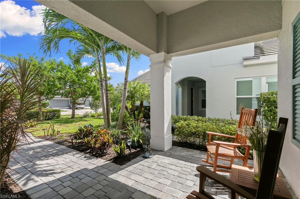 REDUCED $25,000!! This PET-FRIENDLY 3 bedroom plus den SINGLE-LEVEL villa offers a tranquil backyard setting. Situated in the X-zone, this 2019 home benefits from LOWER INSURANCE COSTS! A custom glass front door welcomes you into an open floor plan with tons of light, spanning over 1,800sf. The gourmet kitchen boasts an island, quartz countertops, a tile backsplash and a NATURAL GAS range all complimented by shiplap detailing around the island. Crown molding runs throughout the home, accentuating the high ceilings and 8' DOORS! The primary suite, featuring brand new carpet, offers a luxurious bath and spacious closet with custom shelving and upgraded hardware. Additional updates include IMPACT WINDOWS/DOORS throughout including POCKET SLIDERS opening to an EXTENDED lanai with an additional outdoor paver patio, as well as low voltage exterior lighting in the front and back. The home also includes a custom wall unit with a shiplap accent wall in the family room, wood shelving in the pantry, a laundry room with extra storage with wood shelving and upper cabinets and an epoxy-coated garage floor. Hardwired security cameras provide peace of mind, while privacy landscaping enhances the serene backyard setting. This peaceful, gated community is centrally located, only MINUTES from DOWNTOWN NAPLES, fabulous shopping, restaurants and pristine beaches! Neighborhood amenities include a beautiful clubhouse, pool and spa, fire pit and a dog park! LOW HOA FEES includes Hotwire fiber optic TV and internet (no Xfinity!) + lawn care and irrigation. NO CDD.