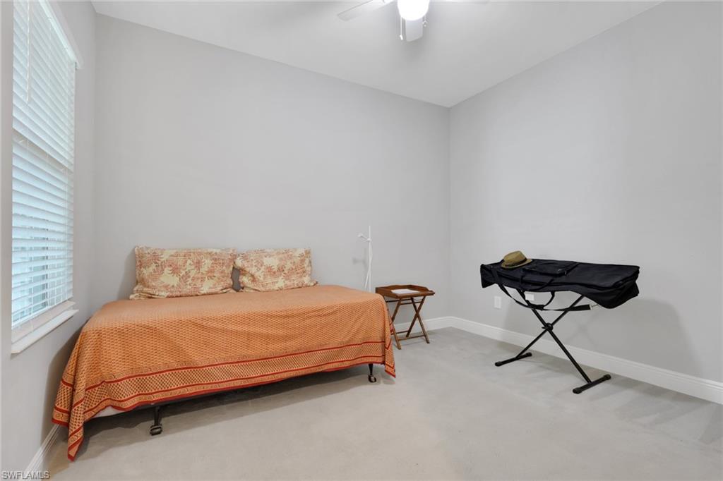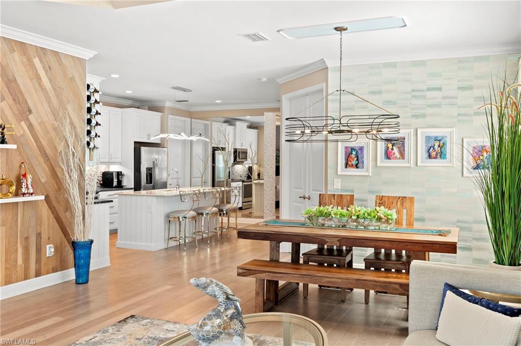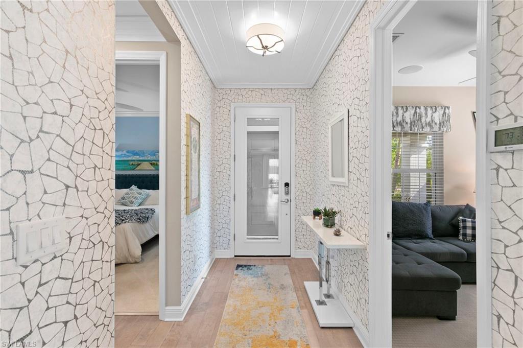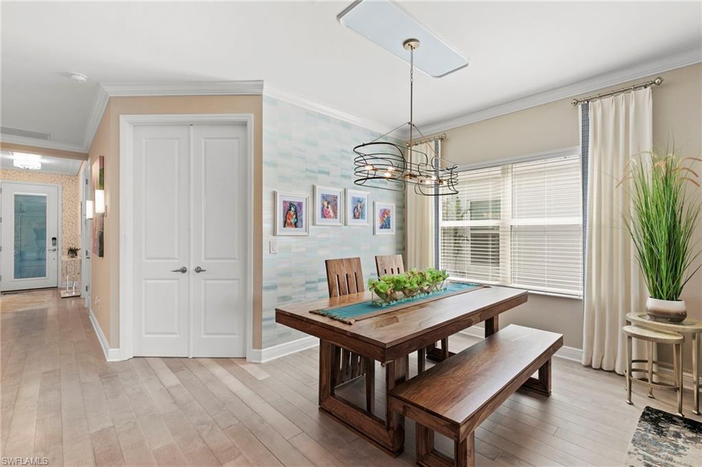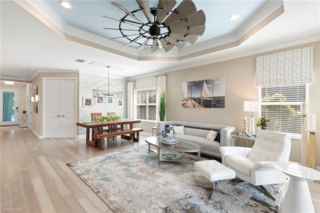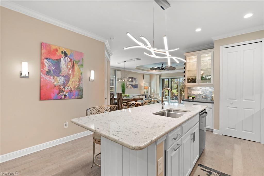 REDUCED $25,000!! This PET-FRIENDLY 3 bedroom plus den SINGLE-LEVEL villa offers a tranquil backyard setting. Situated in the X-zone, this 2019 home benefits from LOWER INSURANCE COSTS! A custom glass front door welcomes you into an open floor plan with tons of light, spanning over 1,800sf. The gourmet kitchen boasts an island, quartz countertops, a tile backsplash and a NATURAL GAS range all complimented by shiplap detailing around the island. Crown molding runs throughout the home, accentuating the high ceilings and 8' DOORS! The primary suite, featuring brand new carpet, offers a luxurious bath and spacious closet with custom shelving and upgraded hardware. Additional updates include IMPACT WINDOWS/DOORS throughout including POCKET SLIDERS opening to an EXTENDED lanai with an additional outdoor paver patio, as well as low voltage exterior lighting in the front and back. The home also includes a custom wall unit with a shiplap accent wall in the family room, wood shelving in the pantry, a laundry room with extra storage with wood shelving and upper cabinets and an epoxy-coated garage floor. Hardwired security cameras provide peace of mind, while privacy landscaping enhances the serene backyard setting. This peaceful, gated community is centrally located, only MINUTES from DOWNTOWN NAPLES, fabulous shopping, restaurants and pristine beaches! Neighborhood amenities include a beautiful clubhouse, pool and spa, fire pit and a dog park! LOW HOA FEES includes Hotwire fiber optic TV and internet (no Xfinity!) + lawn care and irrigation. NO CDD.