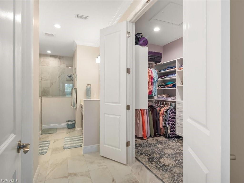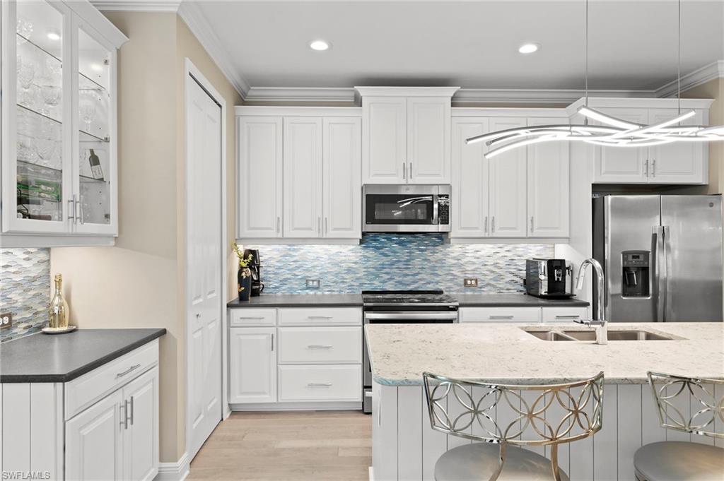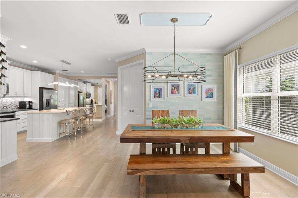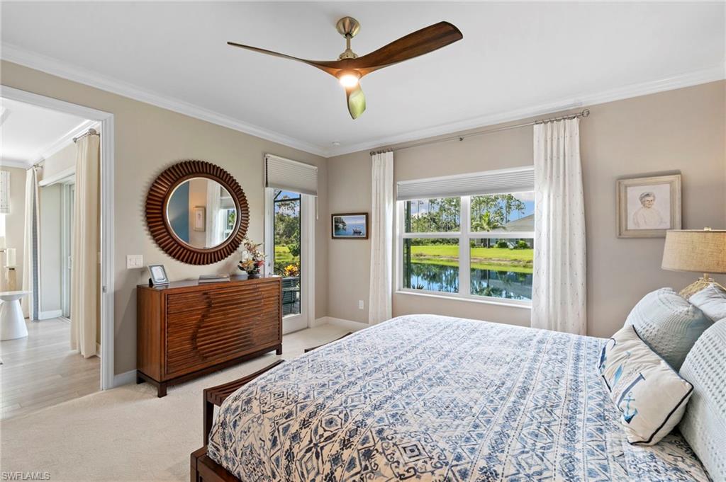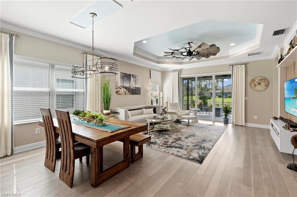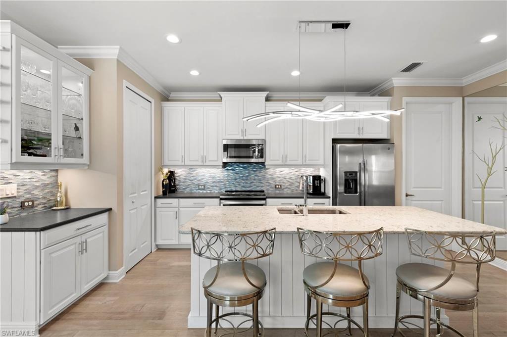 REDUCED $25,000!! This PET-FRIENDLY 3 bedroom plus den SINGLE-LEVEL villa offers a tranquil backyard setting. Situated in the X-zone, this 2019 home benefits from LOWER INSURANCE COSTS! A custom glass front door welcomes you into an open floor plan with tons of light, spanning over 1,800sf. The gourmet kitchen boasts an island, quartz countertops, a tile backsplash and a NATURAL GAS range all complimented by shiplap detailing around the island. Crown molding runs throughout the home, accentuating the high ceilings and 8' DOORS! The primary suite, featuring brand new carpet, offers a luxurious bath and spacious closet with custom shelving and upgraded hardware. Additional updates include IMPACT WINDOWS/DOORS throughout including POCKET SLIDERS opening to an EXTENDED lanai with an additional outdoor paver patio, as well as low voltage exterior lighting in the front and back. The home also includes a custom wall unit with a shiplap accent wall in the family room, wood shelving in the pantry, a laundry room with extra storage with wood shelving and upper cabinets and an epoxy-coated garage floor. Hardwired security cameras provide peace of mind, while privacy landscaping enhances the serene backyard setting. This peaceful, gated community is centrally located, only MINUTES from DOWNTOWN NAPLES, fabulous shopping, restaurants and pristine beaches! Neighborhood amenities include a beautiful clubhouse, pool and spa, fire pit and a dog park! LOW HOA FEES includes Hotwire fiber optic TV and internet (no Xfinity!) + lawn care and irrigation. NO CDD.