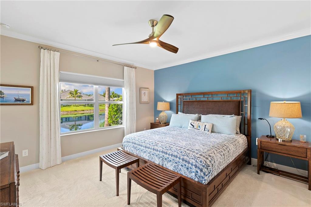 Located in Marquesa Isles, this two-bedroom plus den residence blends timeless design with modern upgrades. The foyer opens to 9-foot ceilings, 8-foot doors and 24-by-12-inch ceramic tile flooring in the main living areas. Glass French doors lead to an 11-by-12-foot den, suitable for a home office, reading space or guest accommodations. The open kitchen features an oversized quartz island, G.E. stainless steel appliances, designer tile backsplash, 42-inch cabinetry with crown molding and under-cabinet lighting. The 16-by-17-foot great room includes a coffered ceiling with crown molding and southern exposure lake views. The primary suite includes a walk-in closet, additional closet, and an en-suite bath with dual sinks and an oversized, designer-tiled shower. The screened lanai spans 14-by-10 feet with a 10-foot extension and sunshade, overlooking the lake. Additional features include impact pocket sliding doors, plush bedroom carpeting, custom window treatments, Smart Hub integration with Z-wave devices, Hotwire fiber-optic service, and an 18-by-20-foot garage with epoxy floor, insulated door and attic insulation. Marquesa Isles amenities include a clubhouse, resort-style pool and hot tub, dog park and landscaped grounds, all within a gated community close to Naples shopping, golf and beaches.