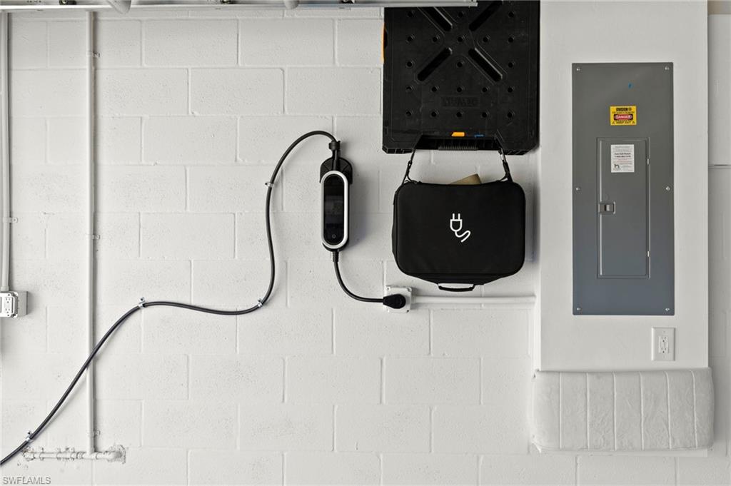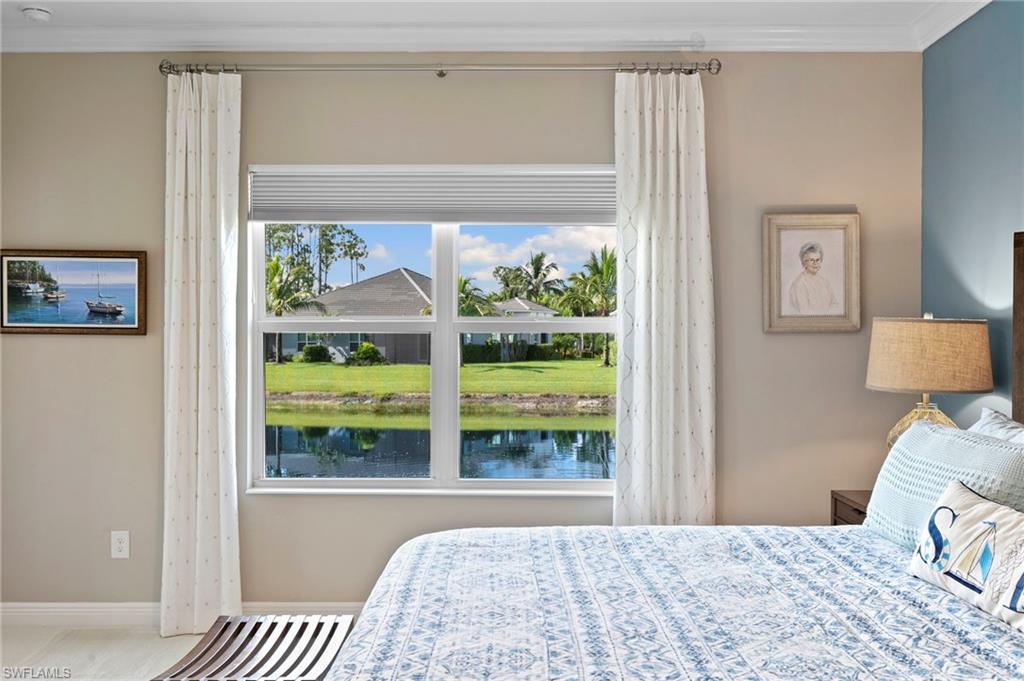 Built in 2020 and maintained in pristine condition, this coastal villa offers refined living in one of Central Naples desirable gated communities. With quality concrete block construction and impact-resistant windows throughout, this three-bedroom-plus-den residence is move-in ready and thoughtfully upgraded. The interior features tile and European French plank wood flooring with no carpet to maintain. A quartz island anchors the gourmet kitchen, complemented by a natural gas range, counter-depth stainless refrigerator, and clean soffit lines above cabinetry. A tray ceiling adds architectural interest to the great room, where 8-foot stacking sliders invite natural light and open to a screened lanai with peaceful water views. The primary suite includes dual vanities, a spacious walk-in shower, an electric bidet, and custom closet cabinetry. Functional upgrades include designer lighting from Wilson Lighting, a SimpliSafe security system and an epoxy-finished garage with pull-down attic access. Low HOA dues cover high-speed fiber optic internet and cable. No community development district or flood insurance required. Enjoy access to a community pool, clubhouse and dog park, all just minutes from Gulf beaches and dining in Old Naples.