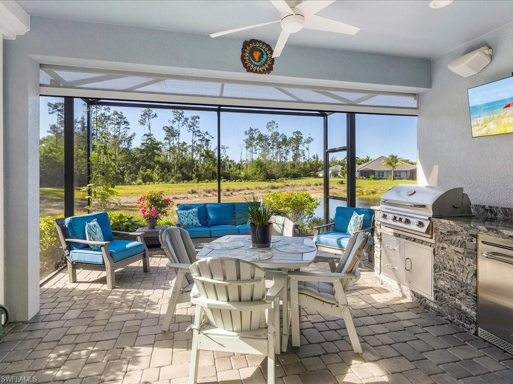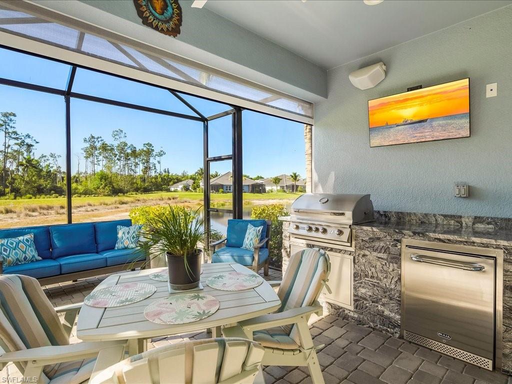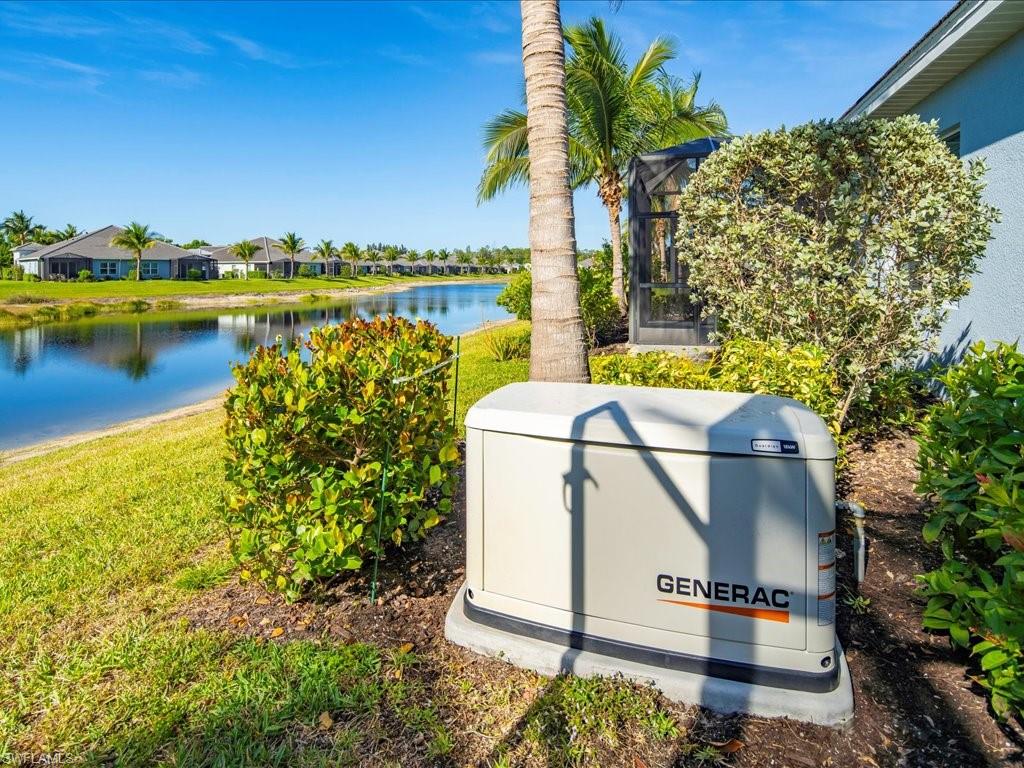 This delightful 3-bedroom plus den villa is located in the X flood zone and features low HOA fees and low insurance costs. The home offers numerous exceptional upgrades, including an 18KW Generac generator, Kinetico water purification system, impact windows and doors, and a Storm Smart lanai screen system for added protection and comfort. Enjoy year-round outdoor living with a custom outdoor kitchen, featuring a Bull BBQ Elite Grill, built-in refrigerator. Inside, a 2.5-ton Trane A/C unit ensures efficiency and comfort, while additional interior enhancements include crown molding, laundry room cabinetry, and an upgraded exhaust system in the owner’s bath suite. The primary suite also showcases a custom-built closet system, and the home is equipped with a Guardian security alarm system (Wi-Fi enabled for remote access) with motion detection. Take in breathtaking lake and preserve views from your lanai and enjoy the peaceful lifestyle offered in Marquesa Isles of Naples, a beautiful gated community located just 5 miles from Fifth Avenue South and Third Street South. Begin enjoying the Naples lifestyle today!