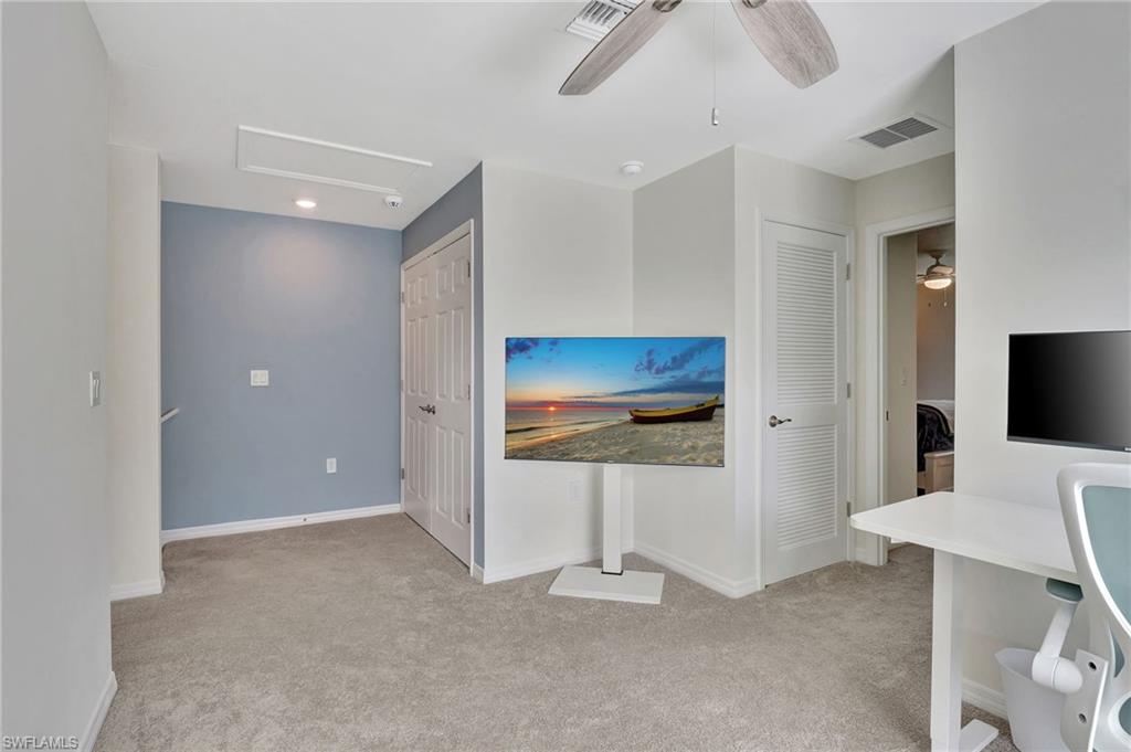 Welcome to this beautifully maintained and thoughtfully updated 2022 end-unit townhome in Meadowood, ideally located off Collier Blvd—just minutes from shopping, dining, entertainment, and Naples' stunning beaches. Offering 3 spacious bedrooms plus a versatile den/office, this home combines newer construction with exceptional value. Step inside to fresh interior paint and new carpet upstairs. The open-concept kitchen features stainless steel appliances, quartz countertops, stylish pendant lighting, farmhouse sink and new faucets, while every room includes ceiling fans for added comfort. A mini split system in the garage and an ultraviolet air scrubber on the AC enhance air quality and efficiency. Even the lawn has been replaced for a fresh curb appeal. Upstairs, the split-bedroom layout offers privacy, with guest bedrooms connected by a Jack and Jill bath. The den/office provides flexible space for work or play. Enjoy resort-style amenities including a pool, fitness center, clubhouse, basketball court, and playground—all within a gated, pet-friendly community with low monthly fees. This impeccable home is priced to sell—don't miss your chance!