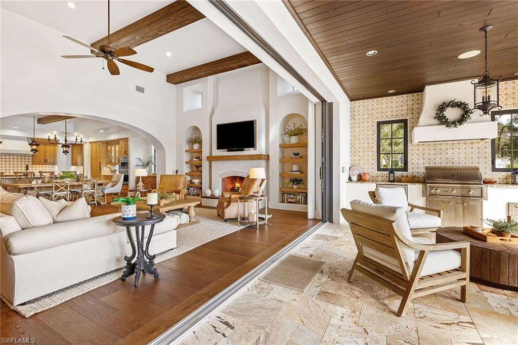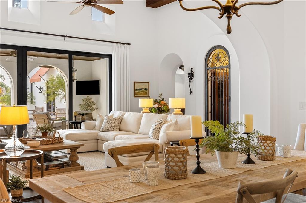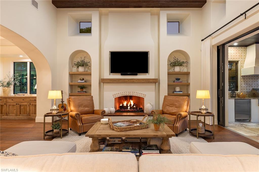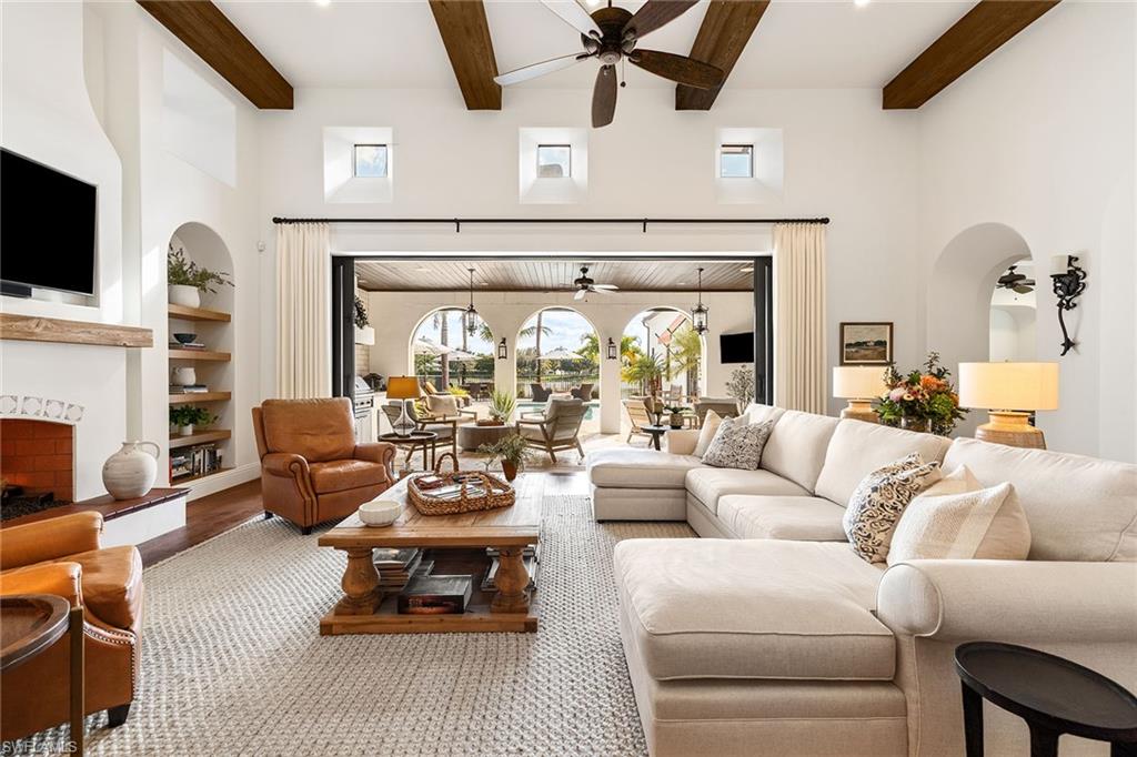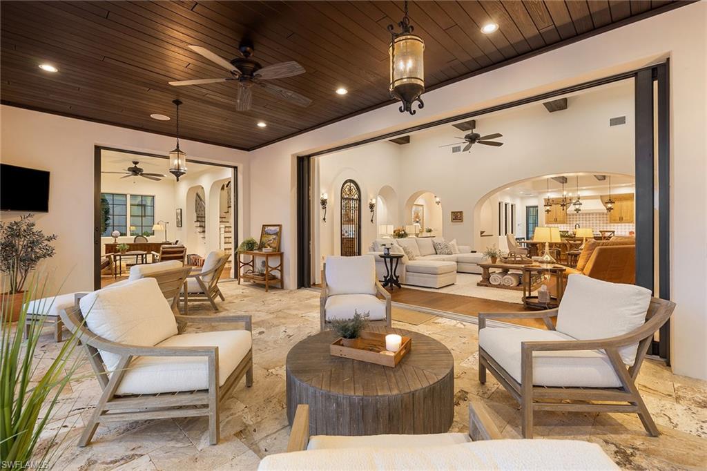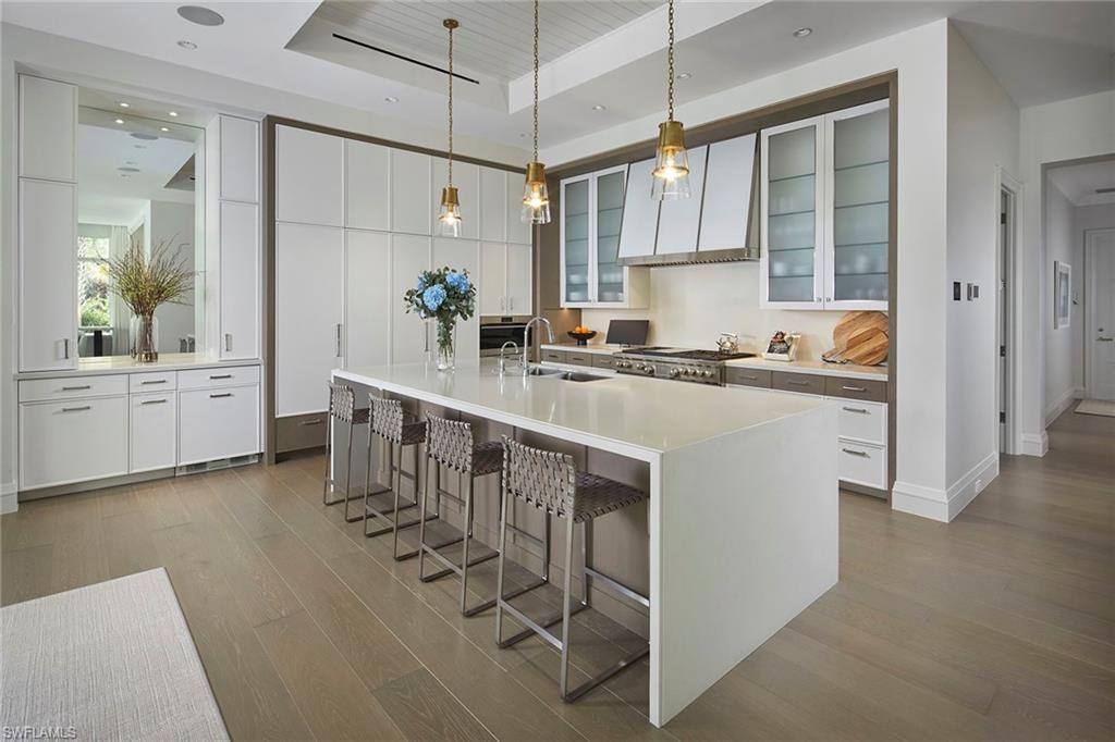 This authentic custom home, hand-crafted by BCB Homes in 2009, is on an extremely private .74-acre homesite within the prestigious Mediterra community. Offering over 6,600 square feet of luxurious living space, the residence features four bedrooms, four full baths, and one-half bath designed for elegance and comfort. The open-concept floor plan is ideal for entertaining family and friends, with a chef’s kitchen boasting top-of-the-line Viking and Sub-Zero appliances, a spacious center island, a well-appointed butler’s pantry ideal for catering and abundant custom cabinetry. The family room serves as the heart of the home and flows seamlessly into an impressive library adorned with vaulted wood-beam ceilings and a stone gas fireplace. The private owner’s suite is a serene retreat, highlighted by hand-scraped wood floors, an adjacent wood-paneled study, a white marble bath and dual custom closets. Outdoor living is equally impressive, featuring a large, covered lanai with a dining area, comfortable sitting space and a fully equipped outdoor kitchen. The outdoor oasis continues with a heated pool, raised spa and gas fire pit, ideal for year-round enjoyment. Additional features include a Lutron lighting system, a climate-controlled three-car garage, Andersen impact windows and doors, and a custom temperature-controlled wine cellar. Residents of Mediterra enjoy an unmatched lifestyle with access to two 18-hole Tom Fazio–designed golf courses, a full-service wellness and fitness center, and a newly refurbished Beach Club offering an elevated pool and Gulf-front dining on the white sands of Hickory Island. A world of luxury, privacy and craftsmanship awaits within this exquisite Mediterra estate.