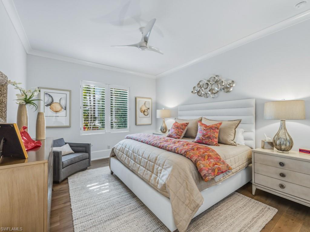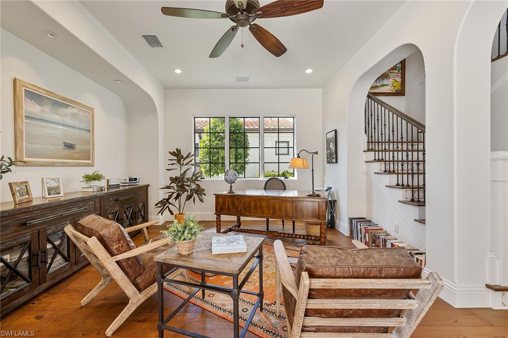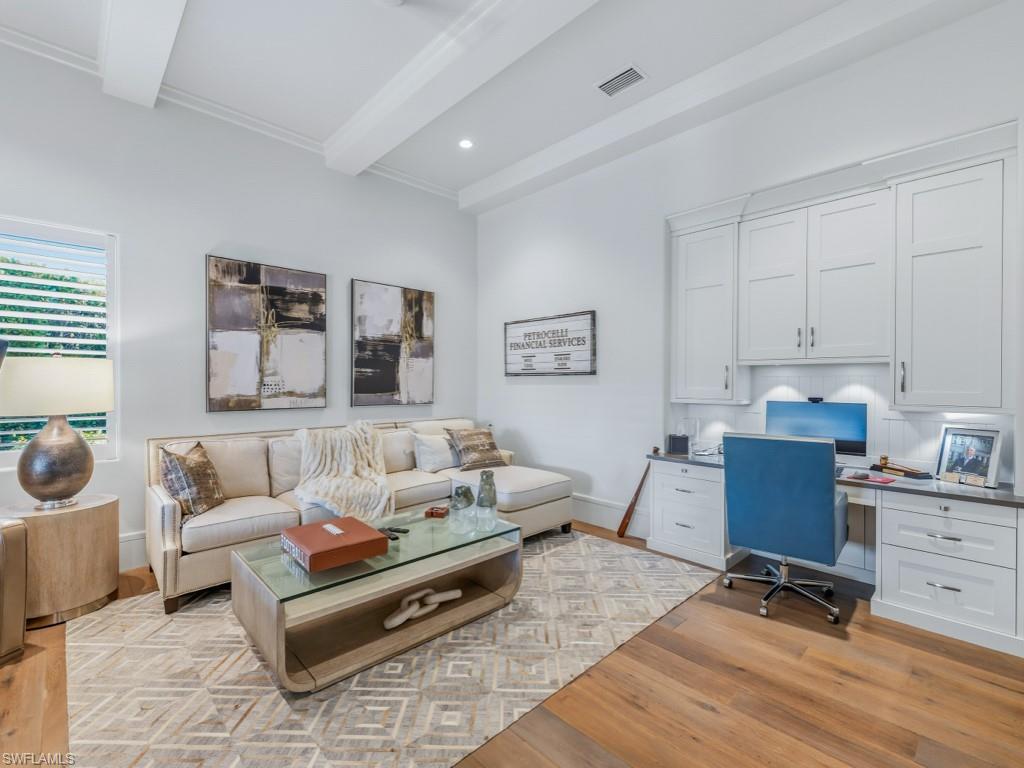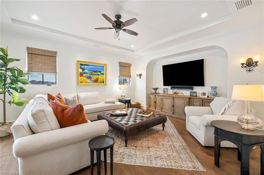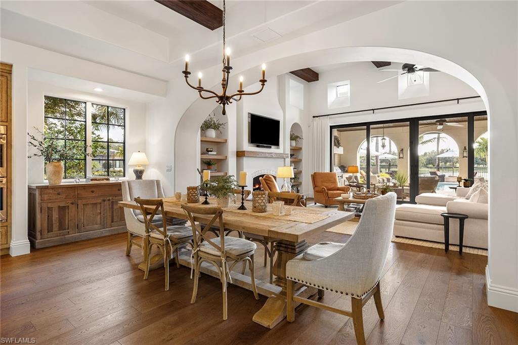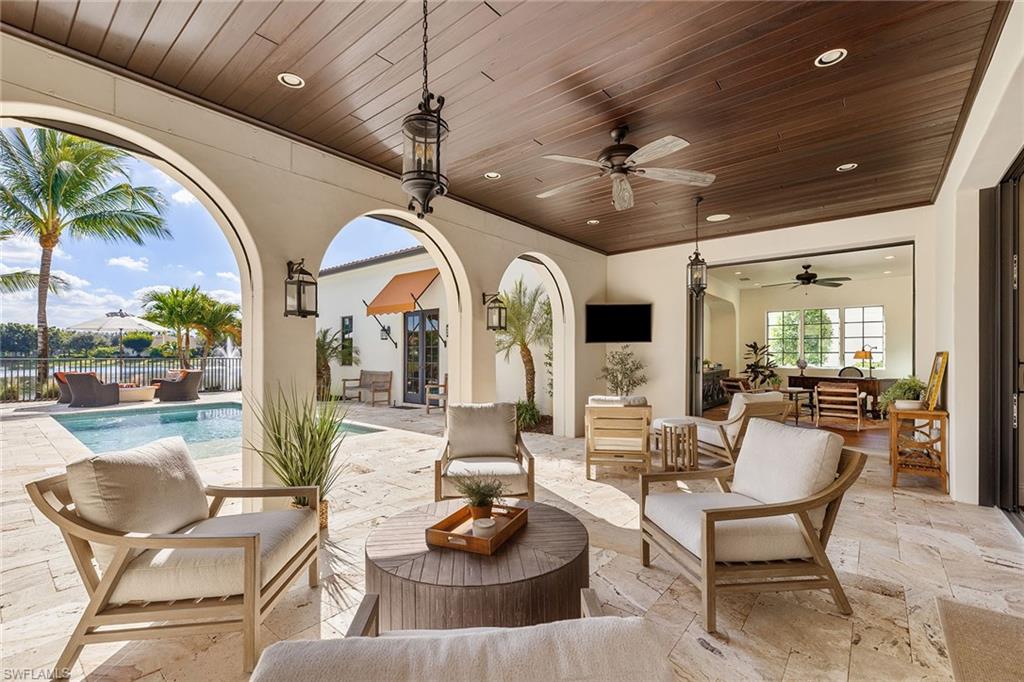 This authentic custom home, hand-crafted by BCB Homes in 2009, is on an extremely private .74-acre homesite within the prestigious Mediterra community. Offering over 6,600 square feet of luxurious living space, the residence features four bedrooms, four full baths, and one-half bath designed for elegance and comfort. The open-concept floor plan is ideal for entertaining family and friends, with a chef’s kitchen boasting top-of-the-line Viking and Sub-Zero appliances, a spacious center island, a well-appointed butler’s pantry ideal for catering and abundant custom cabinetry. The family room serves as the heart of the home and flows seamlessly into an impressive library adorned with vaulted wood-beam ceilings and a stone gas fireplace. The private owner’s suite is a serene retreat, highlighted by hand-scraped wood floors, an adjacent wood-paneled study, a white marble bath and dual custom closets. Outdoor living is equally impressive, featuring a large, covered lanai with a dining area, comfortable sitting space and a fully equipped outdoor kitchen. The outdoor oasis continues with a heated pool, raised spa and gas fire pit, ideal for year-round enjoyment. Additional features include a Lutron lighting system, a climate-controlled three-car garage, Andersen impact windows and doors, and a custom temperature-controlled wine cellar. Residents of Mediterra enjoy an unmatched lifestyle with access to two 18-hole Tom Fazio–designed golf courses, a full-service wellness and fitness center, and a newly refurbished Beach Club offering an elevated pool and Gulf-front dining on the white sands of Hickory Island. A world of luxury, privacy and craftsmanship awaits within this exquisite Mediterra estate.