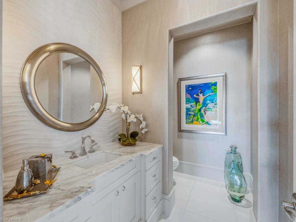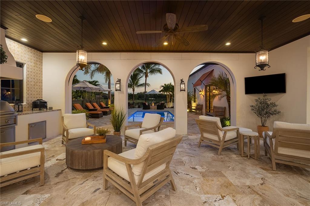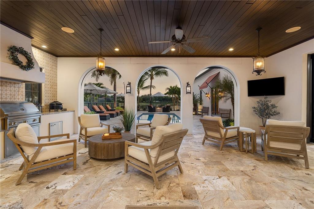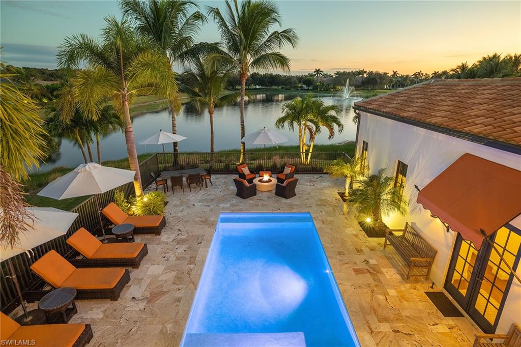 NO WAITING-GOLF CLUB MEMBERSHIP available immediately! Absolutely stunning home nestled on almost an acre on Tee 15 South! Enter the grand front door into the Grande Foyer anchored with a fireplace & curving stairs to the 2nd floor and with floor to ceiling windows/sliders and extending to beautiful lanai and the good morning sunrises beyond. New flooring throughout first floor, upgraded to LED lighting throughout, and upgraded light fixtures inside & out. This home is ideally designed for entertaining, from the formal & informal living spaces, the welcoming wet bar complete with wine refrigerators and gracious seating. The artisan designed kitchen is a chef delight with top tier appliances, warming tray, trash compactor, range hood, double oven/cook top, single wall oven, garbage disposals in both kitchen sinks, stainless steel sinks, touch facet on main kitchen sink indoor icemaker, new quartz countertop offering "miles" of prep space, a custom island, and 3 self-cleaning ovens. The Butler's Pantry is well equipped with additional dishwasher & sink, beverage fridges, 2 additional icemakers, loads of storage and additional countertop spaces. 2 reverse osmosis in kitchen & outdoor kitchen. The dining room has beautiful natural light. There is a sink and refrigerator in the upstairs entertainment center. Each of the generous bedrooms are en-suite and the primary suite is an oasis of relaxation with a seating area, spacious walk-in closets and leading to a spa inspired bath complete with oversized soaking tub, masterful shower & dual vanities. The lanai is opulent, with a soaring two story screen, cozy covered entertaining space, full outdoor kitchen, 2 TV’s on lanai, outdoor speakers for surround sound, new outdoor fans, all new grill parts for both fireplaces, all overlooking a sparkling pool with integrated spa, soft & hard scaping including a Koi Pond with waterfall! Updates include 4 A/Cs new in past 5 years, new roof in 2022, new pool heater & pump, 75 gallon hot water heater, whole house Lutron lighting system, whole house Creston control system, 30 zone whole house water shutoff, whole house water filter & softener, termite control around perimeter, indoor/outdoor security cameras, outdoor security lighting, added landscape & landscape lighting, storm screens, garage door spring replaced, garage cabinets, outdoor sink in garage, finished floor & lighting in garage and it is air conditioned! Mediterra offers world-class amenities, including two Tom Fazio-designed 18-hole championship golf courses, a Gulf-front beach club & restaurant, pickleball, tennis & bocce courts, an updated clubhouse, a soon-to-be expanded sports & lifestyle center and more.