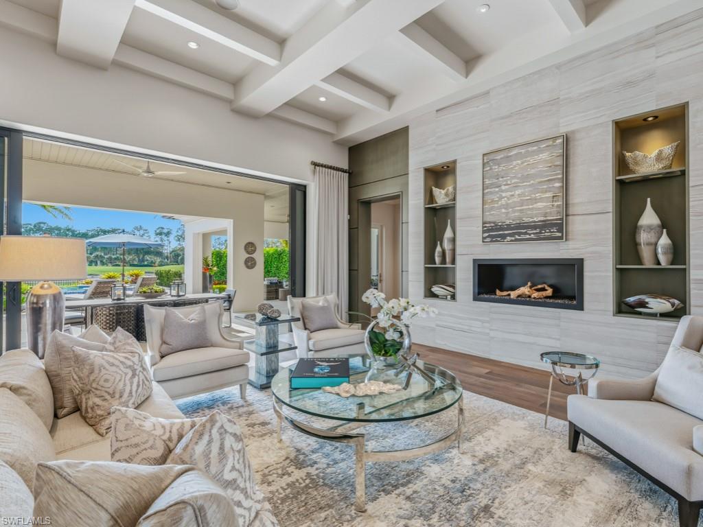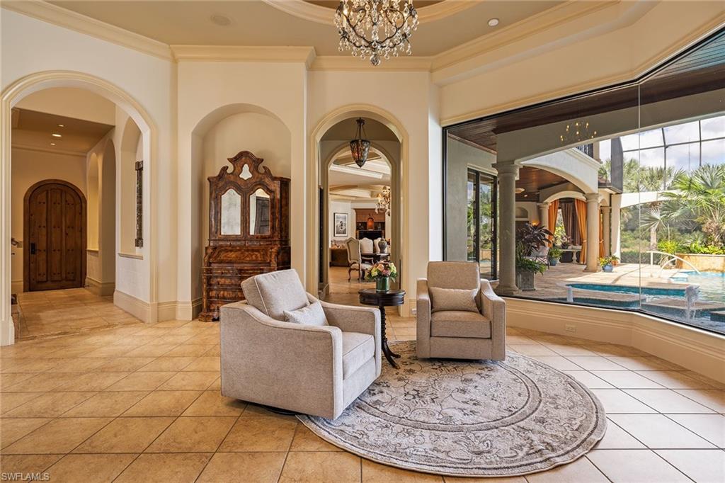 Immediate golf membership available! This custom-designed estate is on a private panoramic homesite in the prestigious Cortile neighborhood in Mediterra Golf and Country Club. The home features nearly 7,000 square feet of luxurious living with five bedrooms plus study and is ideally on a lush private homesite offering panoramic preserve, lake and golf course views of the north and south finishing holes. A soaring, bright and airy two-story foyer adorned with custom beams welcomes you through modern double glass doors. Constructed in 2019 and designed by acclaimed interior designer Brian Gluckstein, the residence is a study in architectural refinement. The interior is highlighted by extensive use of natural light, wide-plank white oak flooring, meticulously crafted ceiling details and refined cabinetry by SOHO. Detailed millwork, integrated lighting design and designer hardware elevate the home’s overall aesthetic. The formal living room with a natural gas fireplace seamlessly transitions an open-concept more casual family room, and a gourmet kitchen featuring a white Caesar stone waterfall island, Wolf six-burner gas range with custom hood, built-in steam oven, warming drawer, Miele dishwasher, Sub-Zero refrigeration and under-counter wine storage. Adjacent spaces are defined by symmetry and scale with artful transitions between rooms via inset door frames and coffered ceilings. Expansive pocketing sliders open to a covered lanai with a Lynx gas grill, Perlick beverage drawers and automated screens and shutters, ideal for year-round alfresco entertaining and storm protection. The resort-style gas-heated pool and spa are flanked by dual fire bowls with water spillovers and a freestanding fire pit offering tranquil views and exceptional privacy. The primary suite features dual walk-in closets, dual water closets, glass-enclosed shower with dual heads and a freestanding modern soaking tub. One main-floor guest suite, three second-floor guest suites, a loft with wet bar and entertainment wall, expansive covered sunset overlook balcony with automated screens and shutters and secondary laundry provide ample space and convenience for visiting family and friends. Additional features of this magnificent property include a natural gas-powered Generac generator, Andersen 400 Series impact-rated windows and doors, elevator, four-car climate-controlled garage spaces and Control4 home automation. A world of luxury awaits you in Mediterra featuring two Tom Fazio-designed championship golf courses, a Gulf-front beach club and restaurant, tennis and pickleball courts, an updated clubhouse, and a soon-to-be-expanded new sports and lifestyle center.