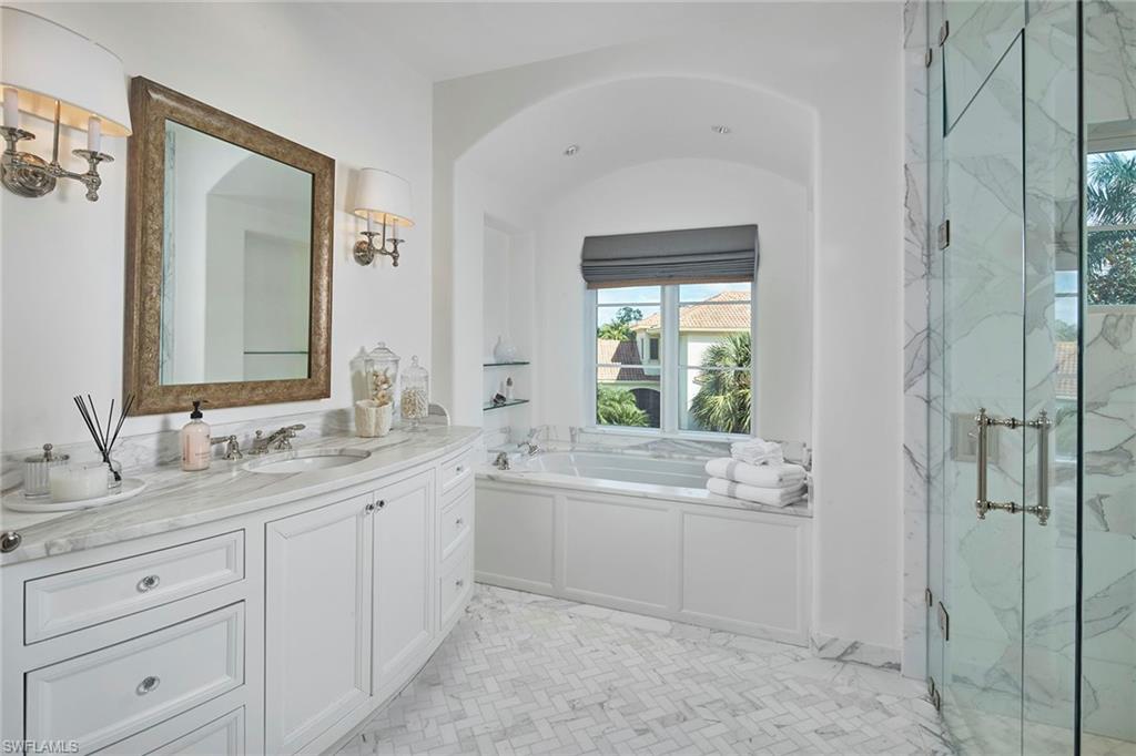 NO WAIT! GOLF MEMBERSHIP SLOT AVAILABLE IMMEDIATELY! NEWLY RENOVATED PRIVATE BEACH CLUB | Discover unparalleled luxury in this exquisite 2-story masterpiece nestled in the prestigious Mediterra community. Designed by the renowned Frey & Sons, the 'Tuscano' model offers an expansive 4-bedroom layout, a spacious den, and five full & 1 half baths, all set against a beautiful golf course and lake view. Upon entry, you are greeted by a dramatic foyer with grand hardwood French doors, leading to an elegant formal living room. This space is framed by soaring windows that flood the room with natural light and provide sweeping views of the sparkling pool with its tranquil fountain features and the lush green fairways beyond. The home exudes opulence with stunning marble floors throughout the main living areas, complemented by newly installed wood flooring in the den, loft, and upstairs bedroom, while plush new carpeting graces the lower-level bedrooms. The gourmet kitchen is a chef’s dream, featuring top-of-the-line Viking appliances, including a gas range, wall oven, and refrigerator drawers. The culinary space is further enhanced by a well-appointed wet bar and a butler's pantry, complete with a refrigerated wine cellar for the discerning connoisseur. Retreat to the palatial primary bedroom suite, which boasts a sun-drenched sitting area and generous his-and-her walk-in closets. The en-suite bathroom is a sanctuary of sophistication, with dual sinks, a freestanding soaking tub, a separate shower, and a bidet, all designed with the finest finishes. The outdoor living space is equally spectacular, offering a summer kitchen perfect for alfresco dining, a cozy outdoor fireplace for intimate gatherings, and a stunning pool and spa with a captivating water fountain. The lush courtyard creates a seamless flow between indoor and outdoor spaces, ideal for entertaining or relaxing in style. The 3-car garage has durable encore flooring and a whole-home generator for added peace of mind. This residence is a true testament to refined living, meticulously designed to offer both grandeur and comfort. Every element of this home has been thoughtfully crafted to create an atmosphere of luxury that exceeds all expectations. Mediterra is a prestigious luxury golf & country club community featuring Two championship Tom-Fazio golf courses for avid golfers, a private beach club with restaurant & bar, multiple tennis courts, pickle-ball & bocce, fitness center, pristine bike & jogging trails, and luxurious dining at the private country club restaurant. The Mediterra Beach Club offers an escape to a 10,000 sq. ft two-story private oceanfront paradise on the Gulf of Mexico. Featuring a restaurant & bar that serves members via indoor & outdoor dining, this private facility boasts a heated swimming pool, a sundeck, and cabana beach service for chairs, umbrellas & refreshments.