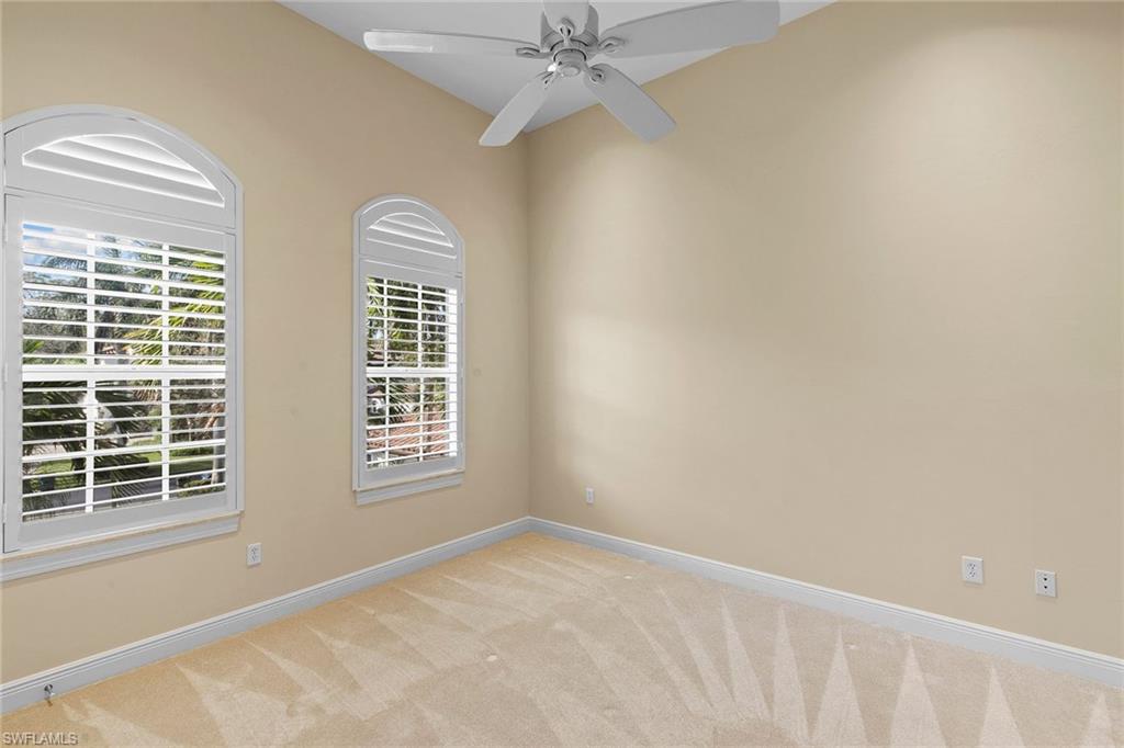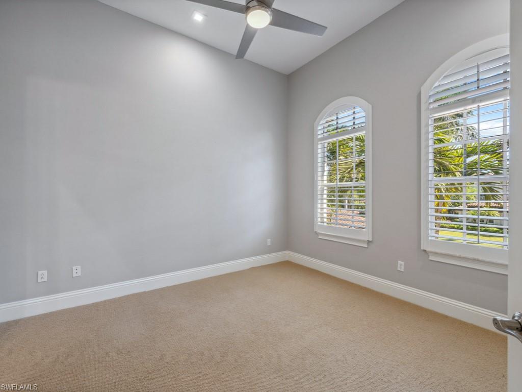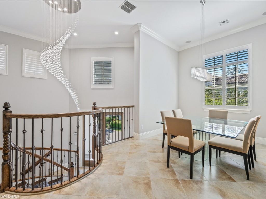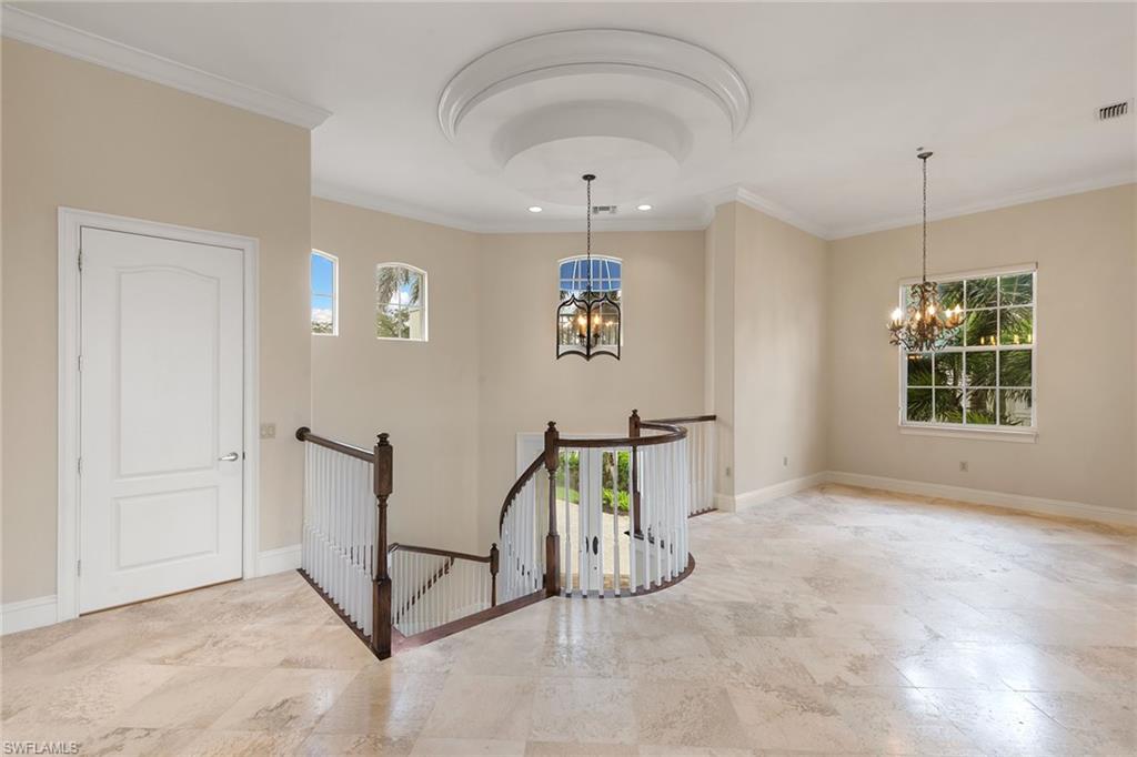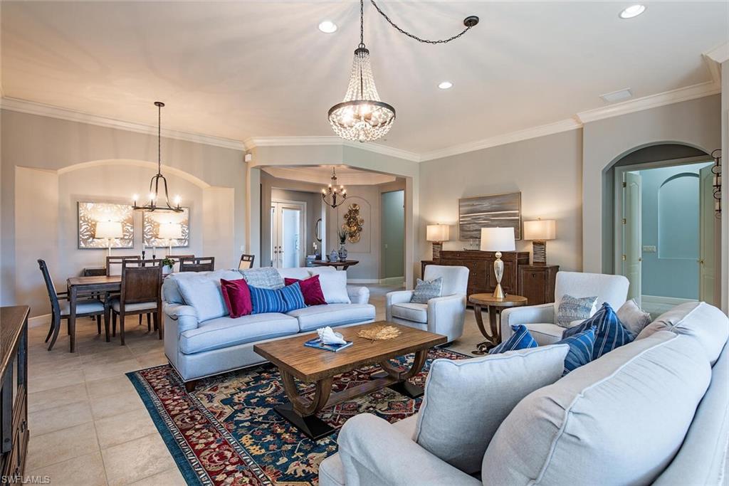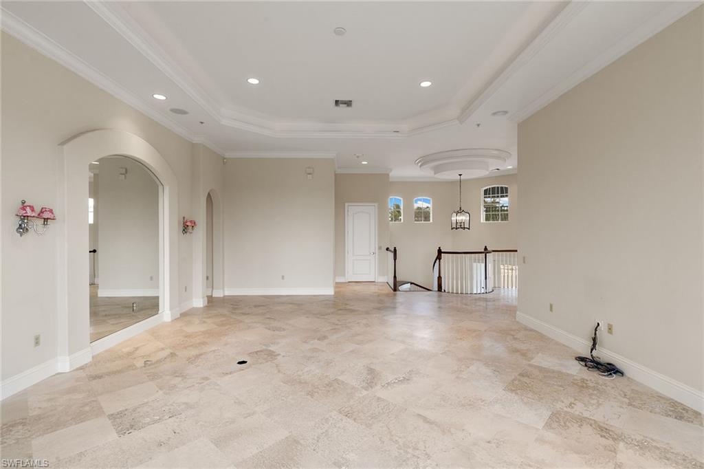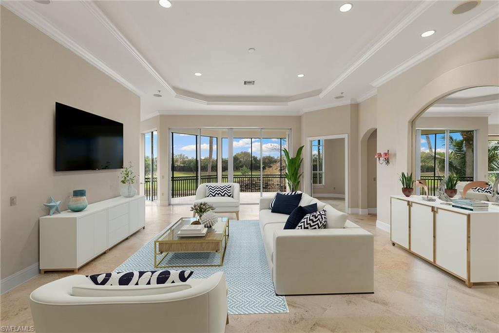 Welcome to this elegant residence in the sought-after Monterosso neighborhood of Mediterra. Featuring three bedrooms, three baths and a den, this home offers expansive golf course views, southern exposure and a spacious open layout. Upon entry, double doors lead to a dramatic staircase and a light-filled great room with soaring ceilings and stone flooring throughout the main living areas. The kitchen is appointed with custom cabinetry, high-end appliances and gas cooking, ideal for culinary pursuits and entertaining. The primary suite offers a tranquil retreat with dual vanities, a soaking tub and a frameless glass shower. Additional highlights include a screened balcony, attached two-car garage. Imagine enjoying afternoon walks through the unique park exclusive to Monterosso neighborhood. Located directly across from the home is the pool and mail kiosks offering exceptional convenience. Virtual photos show how the home can be recreated to fit your needs. In the award-winning community of Mediterra featuring two Tom Fazio championship golf courses, pickleball, tennis, state-of-the-art fitness and a private beach club. Enjoy your toes in the sand and golden sunsets at Mediterra's fully renovated private Beach Club, along the Gulf. Imagine arriving to have your car valet parked and lounge chairs and umbrellas waiting for your arrival or set up upon your request. With 10,000 square feet of space, the upper level offers indoor and alfresco dining, a full bar, swimming pool along with lockers and dressing areas for changing. Spend the day and enjoy dinner while watching the sun set in the distance.