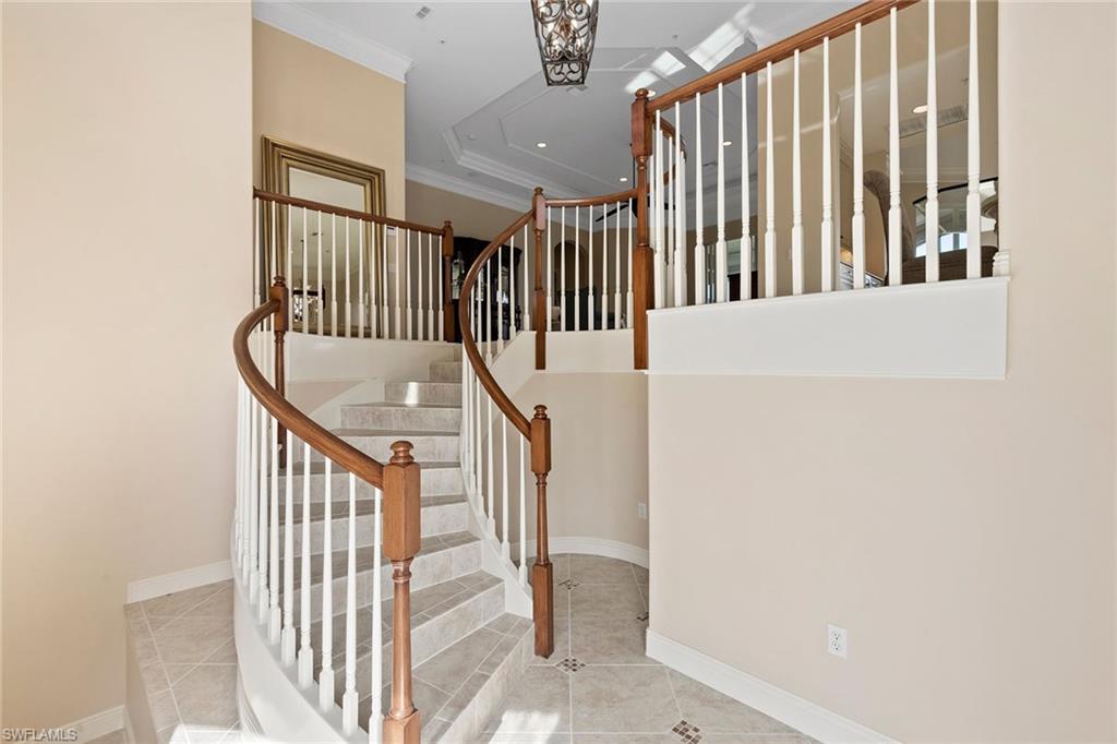 Located in the beautiful Mediterra Golf & Country Club - NEWLY RENOVATED PRIVATE BEACH CLUB - A grand foyer entry & captivating wood-embellished spiral staircase welcome you to this lovely second-floor coach home equipped with a private elevator! Updated light & bright tones, featuring many upgrades throughout, including hurricane impact windows & doors, a modern kitchen, washer & dryer, plantation shutters, custom lighting fixtures, and ceiling speakers. Abundant light soaks into the main living areas through oversized glass sliders, which open to the screened lanai that is surrounded by serene preserve views. The one-of-a-kind modern kitchen includes upgraded stainless steel appliances, rich raised panel wood cabinetry, a natural gas stove with a vented hood, lowered granite countertops & breakfast bar. The primary bedroom suite offers oversized picture windows, tray ceilings & direct outdoor access to the lanai from the primary bedroom. His & her vanities are found in the bath with large mirrors, a soaking tub, and a separate walk-in shower. The den is the perfect home office space with a tropical landscape view. Mediterra is a prestigious luxury golf & country club community featuring Two championship Tom-Fazio golf courses for avid golfers, a private beach club with restaurant & bar, multiple tennis courts, pickle-ball & bocce, fitness center, pristine bike & jogging trails, and luxurious dining at the private country club restaurant. The Mediterra Beach Club offers an escape to a 10,000 sq. ft two-story private oceanfront paradise on the Gulf of Mexico. Featuring a restaurant & bar that serves members via indoor & outdoor dining, this private facility boasts a heated swimming pool, a sundeck, and cabana beach service for chairs, umbrellas & refreshments.