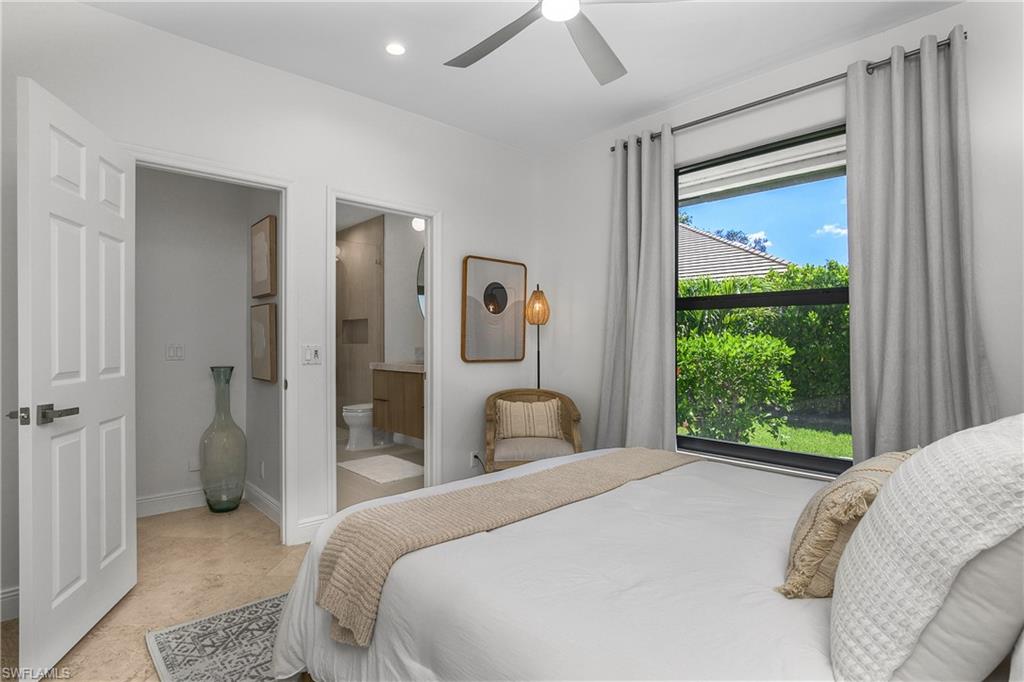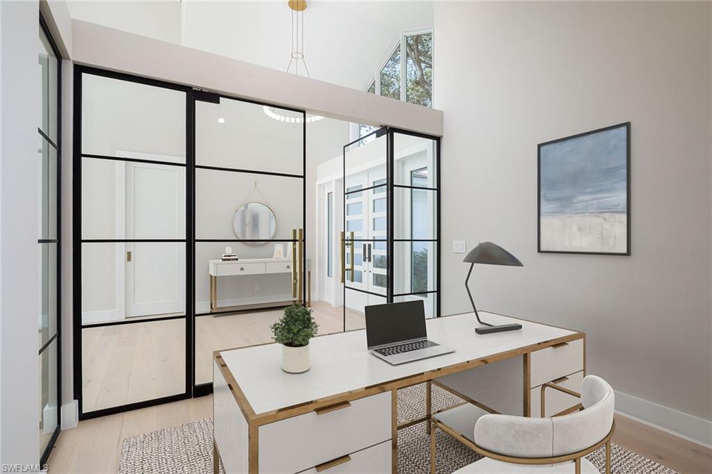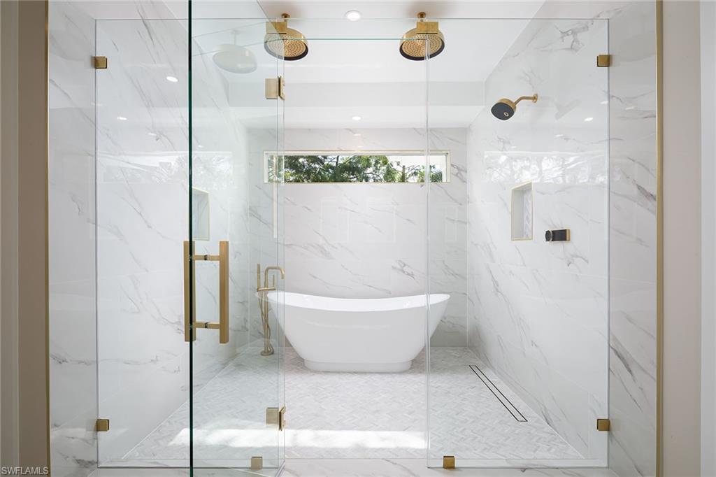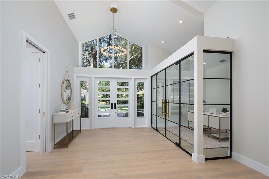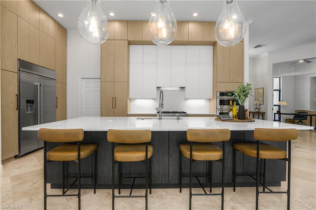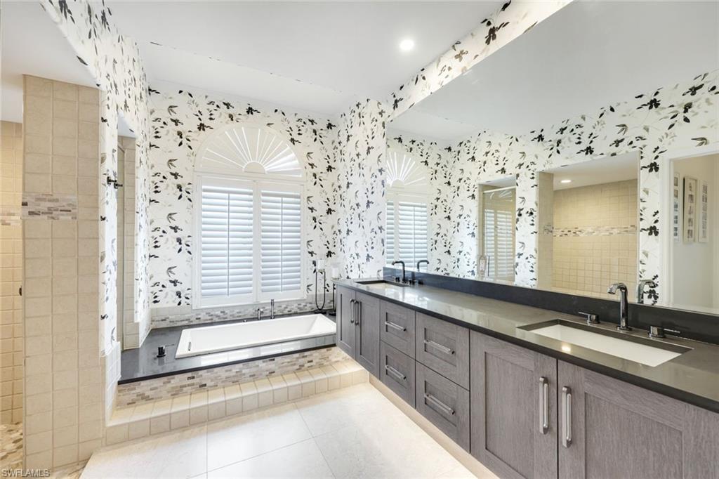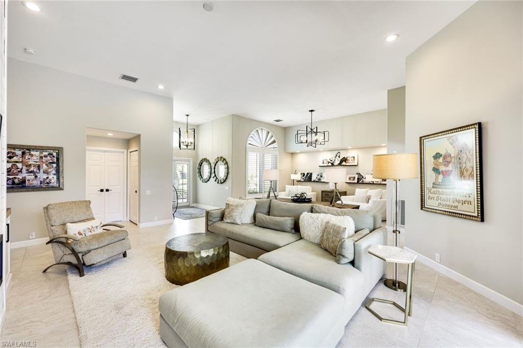 Coastal modern describes this spectacular total renovation in Monterey. This fabulous lakefront pool home offers soothing lake views with charming setting and is perched at the end of a quiet U-shaped street. Stunning architecture greets you with dramatic soaring 20 ft beamed ceilings and a huge bank of windows in the massive great room. The full renovation is fantastic, complete with gorgeous redesigned kitchen with massive center island and bar with dual zone wine refrigerator, white oak floors throughout, new impact windows and sliders, sleek new front doors, new pavered driveway and patio, new pool and spa, solid core 8ft shaker doors and new casings, baseboards and window wood trim throughout, newly repiped plumbing, new electrical box and electric throughout, new irrigation system, new AC ductwork, oversized laundry, luxurious owner’s suite complete with massive state-of-the-art bathroom, and signature dressing room loaded with space. Other superb finish details include freshly epoxied garage floors, chic lighting package inside and out, glassed in den, quartz and marble kitchen finishes, Sub-Zero refrigerator, Viking dishwasher, GE Cafe oven, induction cooktop with pot filler and microwave, Blanco sink,, oversized garage with 2nd refrigerator, newer roof (2018), new tankless hot water heater, and more. A fabulous wetroom in the owner’s suite comes complete with three Kohler shower heads (including two rain heads), stand-alone Empava tub, lighted mirrors and porcelain tile. The home is immaculate, stylish, state-of-the-art and move-in ready and the sunny eastern exposure floods the home with morning sunshine. Monterey continues to be among the leading communities in North Naples conveniently just three miles to Vanderbilt Beach and two miles to Mercato and Waterside Shops with 24-hour guarded gatehouse. Excellent amenities include award-winning clubhouse for private events, fitness center, heated lap pool, Har-Tru tennis courts with active tennis programs, kid’s play area, and basketball/pickleball court. A-rated public schools and three excellent private schools nearby. Photography and owner’s suite dressing room built-in cabinets are virtually staged.