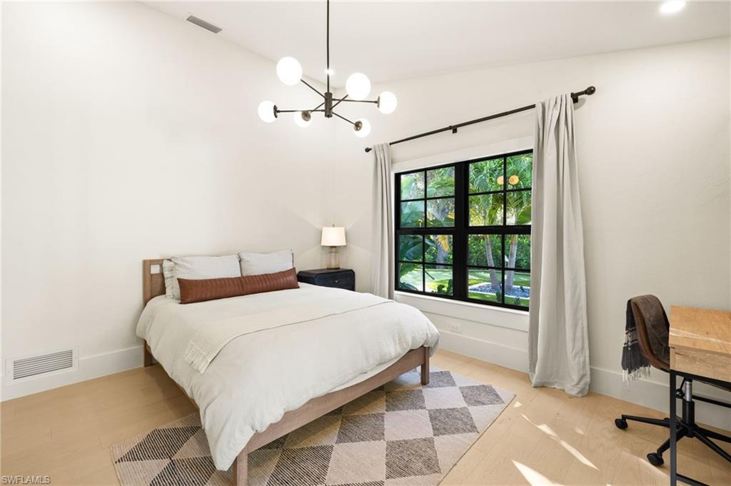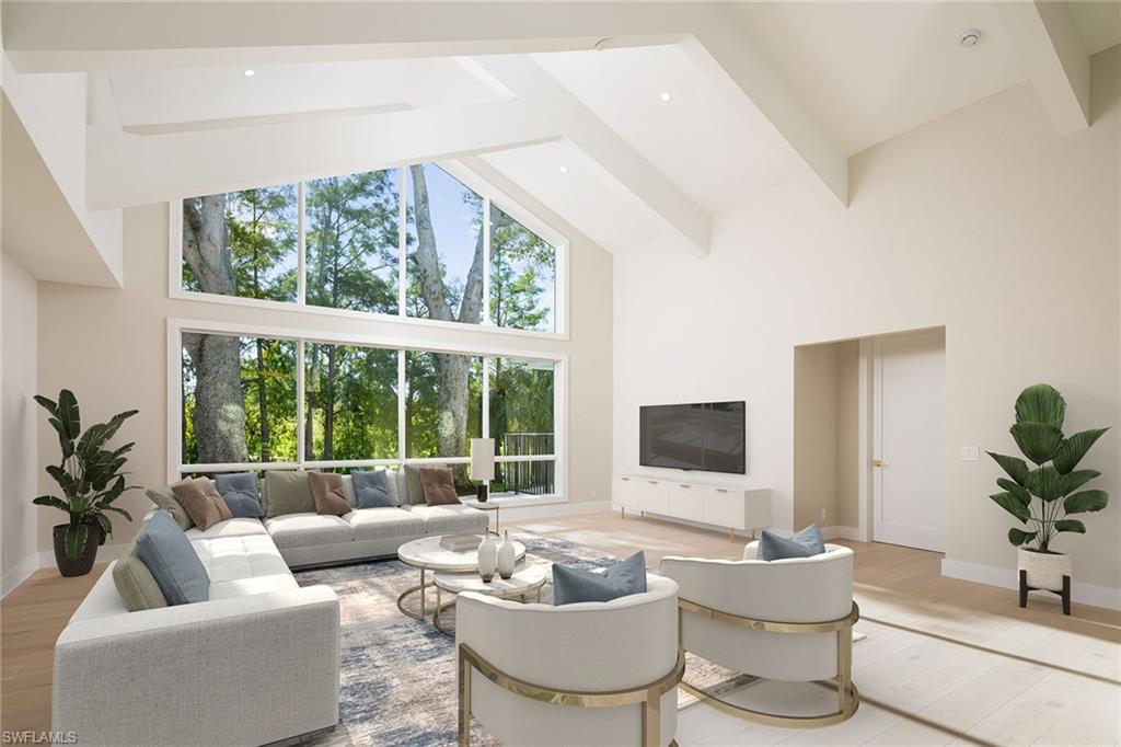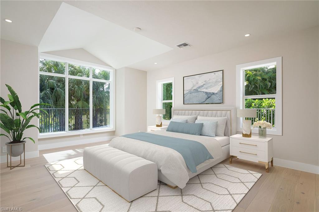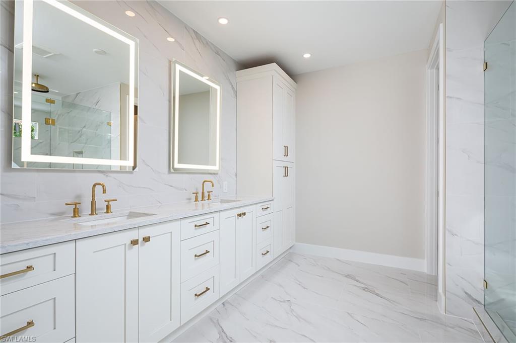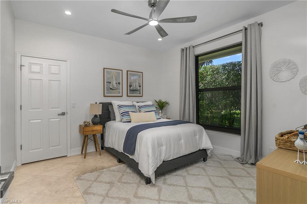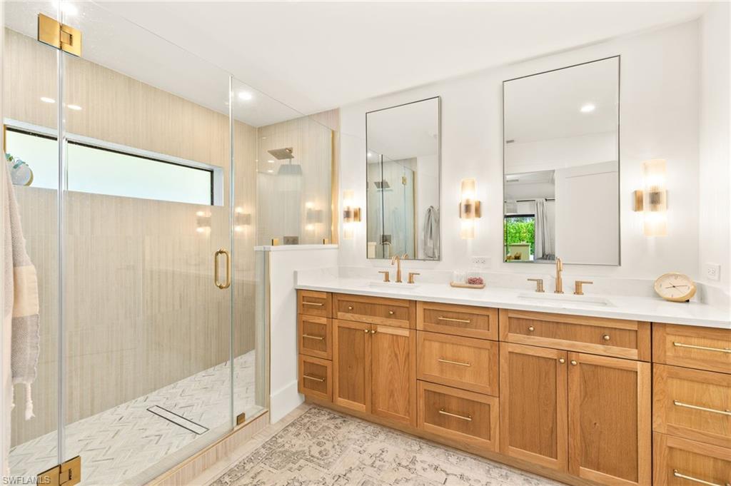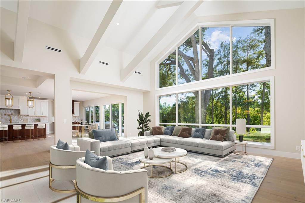 Coastal modern describes this spectacular total renovation in Monterey. This fabulous lakefront pool home offers soothing lake views with charming setting and is perched at the end of a quiet U-shaped street. Stunning architecture greets you with dramatic soaring 20 ft beamed ceilings and a huge bank of windows in the massive great room. The full renovation is fantastic, complete with gorgeous redesigned kitchen with massive center island and bar with dual zone wine refrigerator, white oak floors throughout, new impact windows and sliders, sleek new front doors, new pavered driveway and patio, new pool and spa, solid core 8ft shaker doors and new casings, baseboards and window wood trim throughout, newly repiped plumbing, new electrical box and electric throughout, new irrigation system, new AC ductwork, oversized laundry, luxurious owner’s suite complete with massive state-of-the-art bathroom, and signature dressing room loaded with space. Other superb finish details include freshly epoxied garage floors, chic lighting package inside and out, glassed in den, quartz and marble kitchen finishes, Sub-Zero refrigerator, Viking dishwasher, GE Cafe oven, induction cooktop with pot filler and microwave, Blanco sink,, oversized garage with 2nd refrigerator, newer roof (2018), new tankless hot water heater, and more. A fabulous wetroom in the owner’s suite comes complete with three Kohler shower heads (including two rain heads), stand-alone Empava tub, lighted mirrors and porcelain tile. The home is immaculate, stylish, state-of-the-art and move-in ready and the sunny eastern exposure floods the home with morning sunshine. Monterey continues to be among the leading communities in North Naples conveniently just three miles to Vanderbilt Beach and two miles to Mercato and Waterside Shops with 24-hour guarded gatehouse. Excellent amenities include award-winning clubhouse for private events, fitness center, heated lap pool, Har-Tru tennis courts with active tennis programs, kid’s play area, and basketball/pickleball court. A-rated public schools and three excellent private schools nearby. Photography and owner’s suite dressing room built-in cabinets are virtually staged.