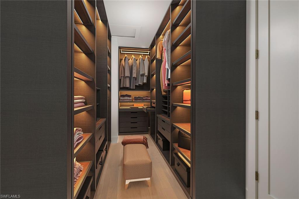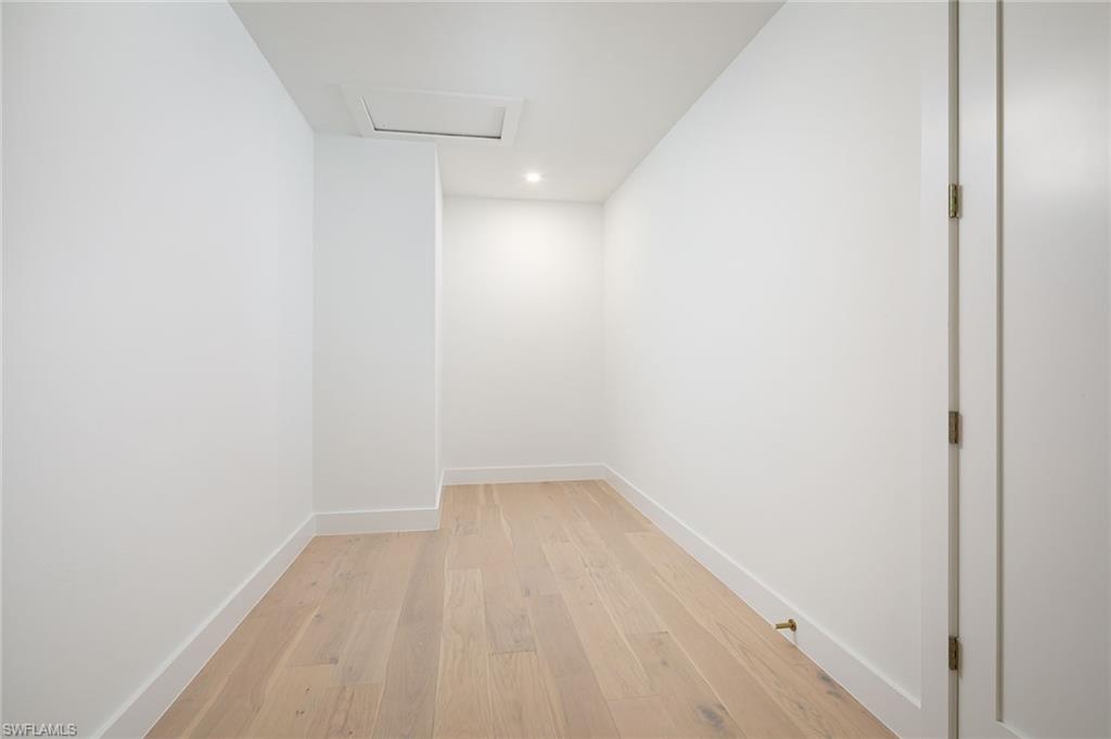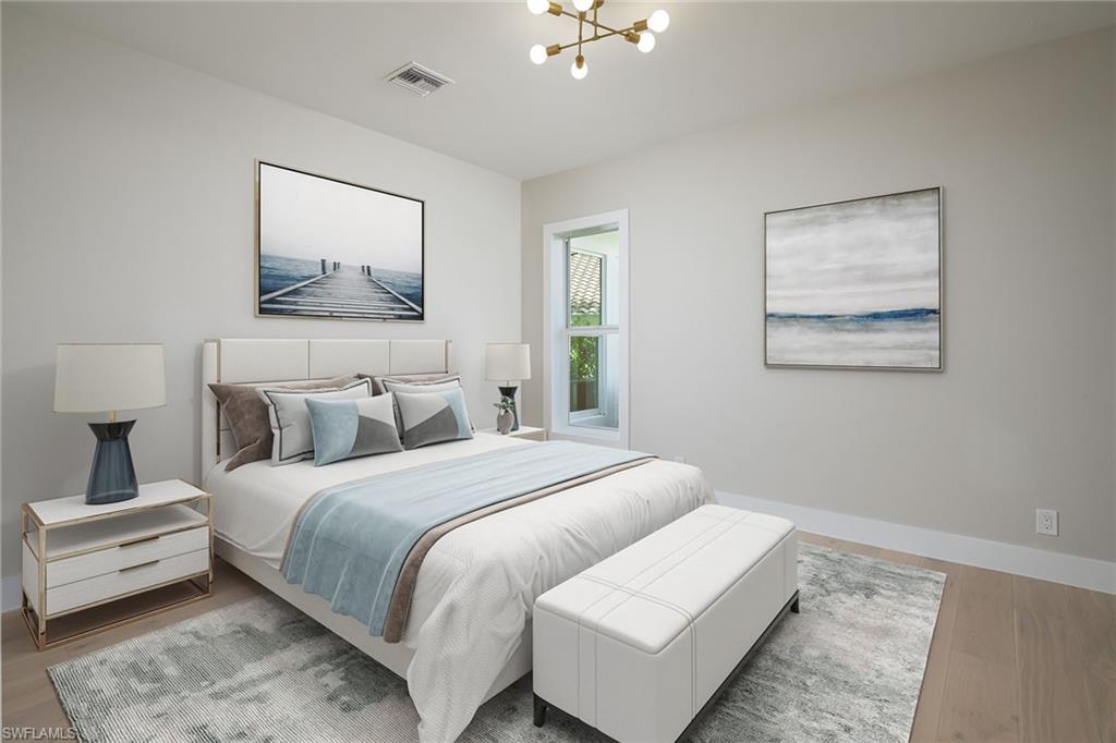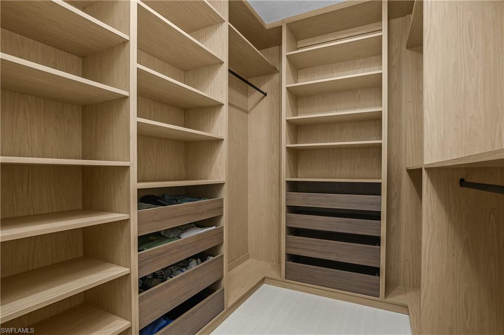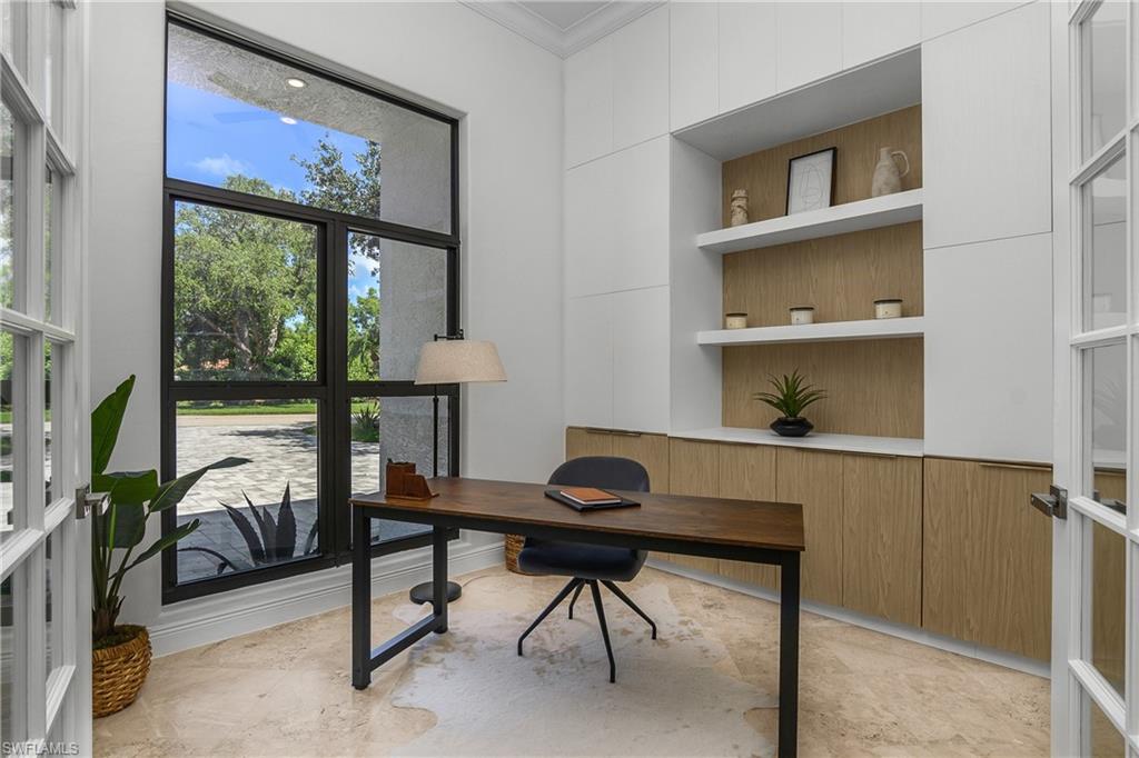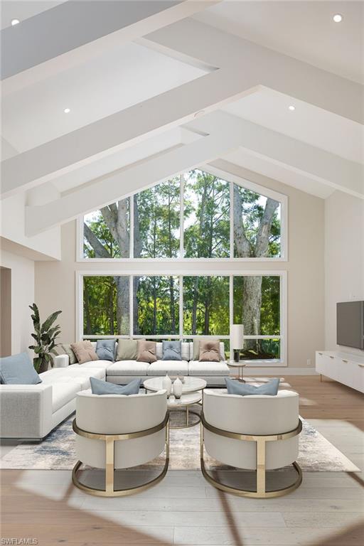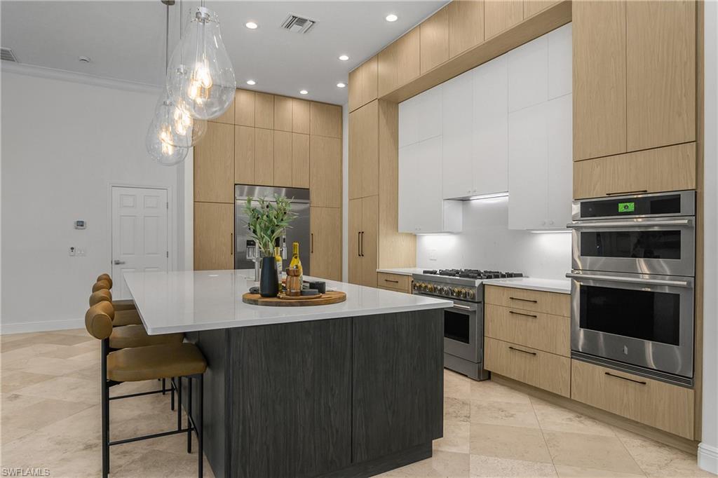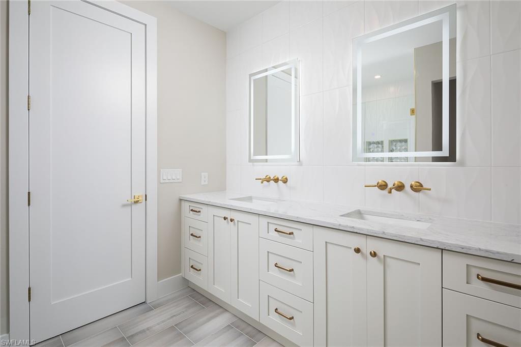 Coastal modern describes this spectacular total renovation in Monterey. This fabulous lakefront pool home offers soothing lake views with charming setting and is perched at the end of a quiet U-shaped street. Stunning architecture greets you with dramatic soaring 20 ft beamed ceilings and a huge bank of windows in the massive great room. The full renovation is fantastic, complete with gorgeous redesigned kitchen with massive center island and bar with dual zone wine refrigerator, white oak floors throughout, new impact windows and sliders, sleek new front doors, new pavered driveway and patio, new pool and spa, solid core 8ft shaker doors and new casings, baseboards and window wood trim throughout, newly repiped plumbing, new electrical box and electric throughout, new irrigation system, new AC ductwork, oversized laundry, luxurious owner’s suite complete with massive state-of-the-art bathroom, and signature dressing room loaded with space. Other superb finish details include freshly epoxied garage floors, chic lighting package inside and out, glassed in den, quartz and marble kitchen finishes, Sub-Zero refrigerator, Viking dishwasher, GE Cafe oven, induction cooktop with pot filler and microwave, Blanco sink,, oversized garage with 2nd refrigerator, newer roof (2018), new tankless hot water heater, and more. A fabulous wetroom in the owner’s suite comes complete with three Kohler shower heads (including two rain heads), stand-alone Empava tub, lighted mirrors and porcelain tile. The home is immaculate, stylish, state-of-the-art and move-in ready and the sunny eastern exposure floods the home with morning sunshine. Monterey continues to be among the leading communities in North Naples conveniently just three miles to Vanderbilt Beach and two miles to Mercato and Waterside Shops with 24-hour guarded gatehouse. Excellent amenities include award-winning clubhouse for private events, fitness center, heated lap pool, Har-Tru tennis courts with active tennis programs, kid’s play area, and basketball/pickleball court. A-rated public schools and three excellent private schools nearby. Photography and owner’s suite dressing room built-in cabinets are virtually staged.
