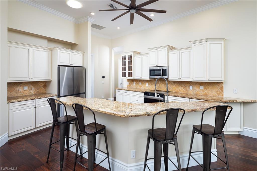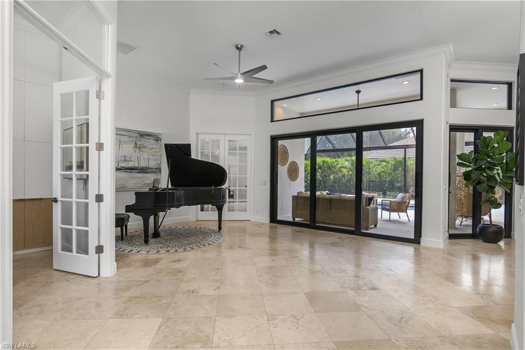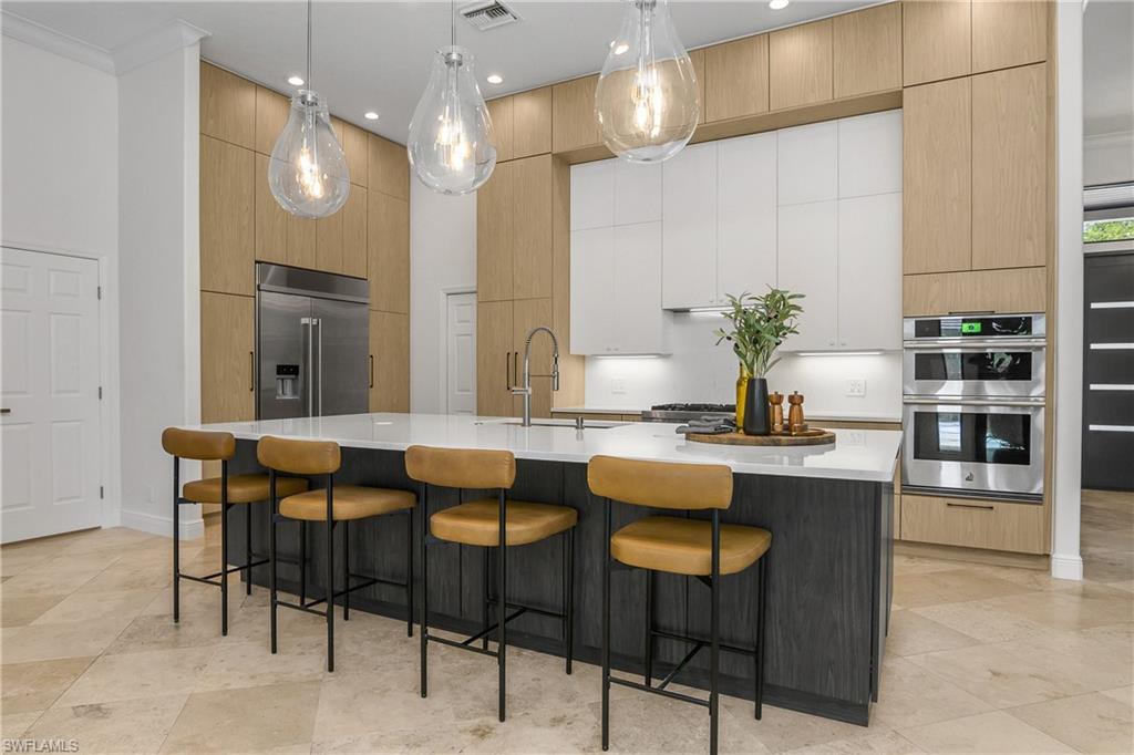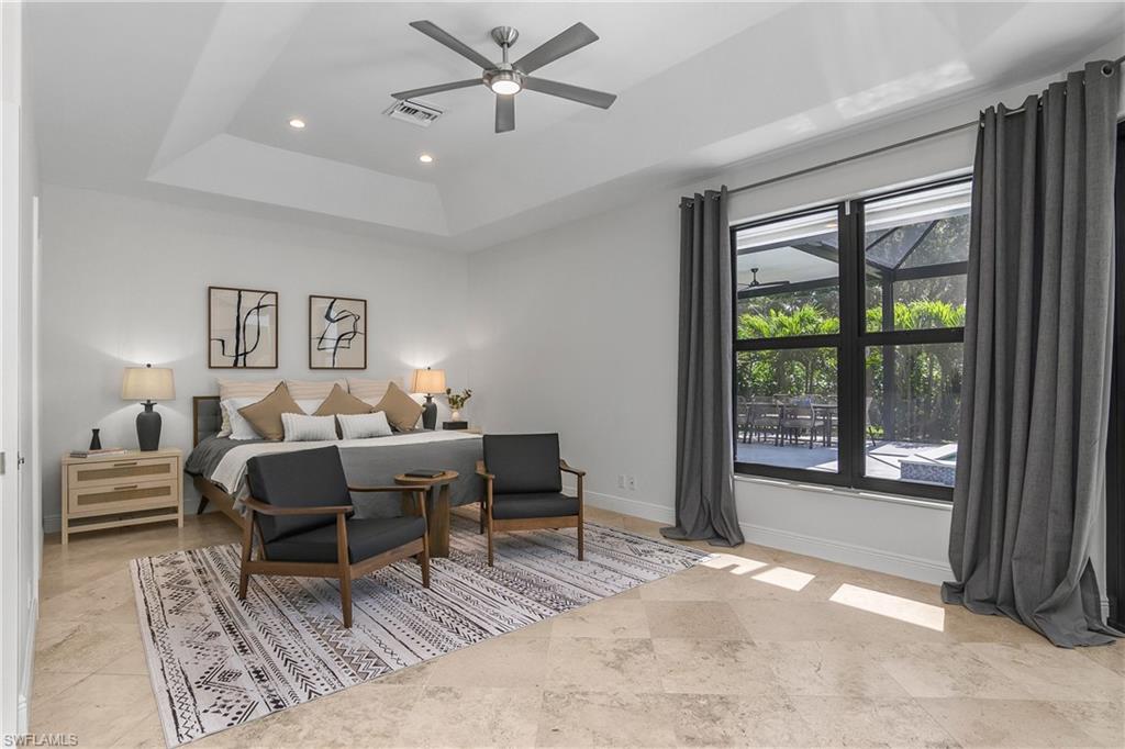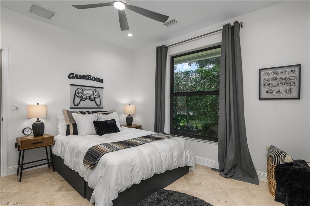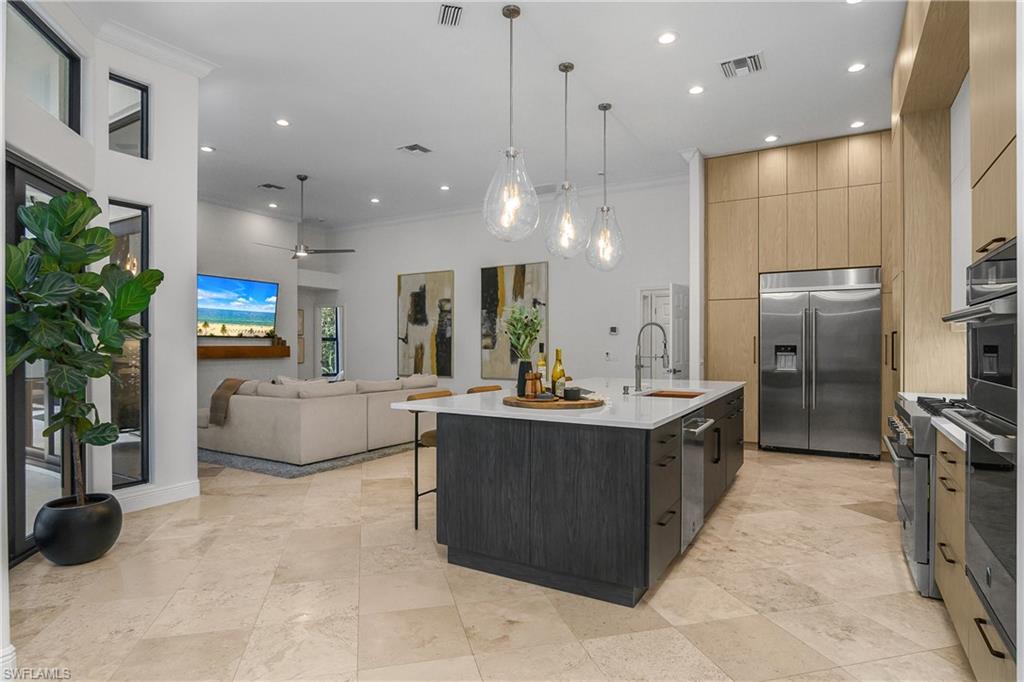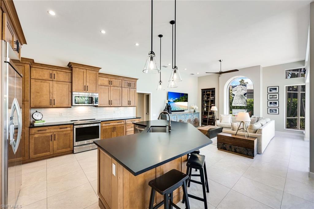 Effortlessly sophisticated home on a cul-de-sac street in the highly sought after and rarely available Monterey community! This 4 bed/3 bath + den home was recently updated to include an additional 500 sf of living space and an open kitchen perfect for entertaining. So much is NEW in this home, both inside and out! Full of luxurious finishes, including a professional La Marzocco espresso bar, Simonelli grinder (worth $12k), NEW Italian ceramic tile, New double convection oven, NEW AC with UV light filter, NEW water heater, NEW water well and NEW RO system. Outside features a butterfly garden, $55k of NEW landscaping, NEW lanai casing, NEW parking pad, and a spacious backyard with a zip line and trampoline. All furniture conveys, including a piano and Nest cameras. Located in an A+ rated school zone, just 1 mile from the beach, near the upscale Mercato and Waterside Shops. The gated Monterey community offers a renovated clubhouse, resort-style pool, fitness center, tennis, pickleball, and more. With easy access to I-75, the SWFL International airport, world class dining, shopping, entertainment, and beautiful white-sand SW Florida beaches.