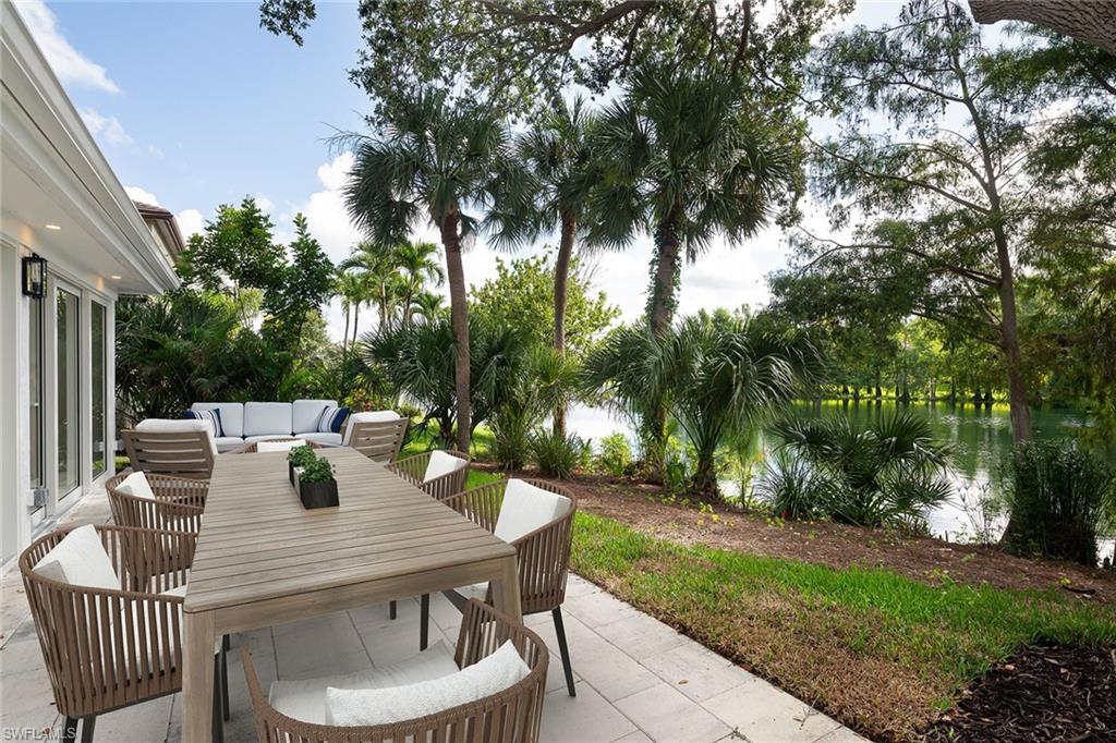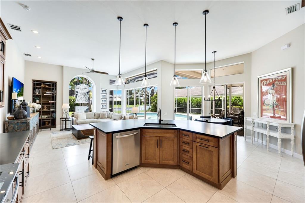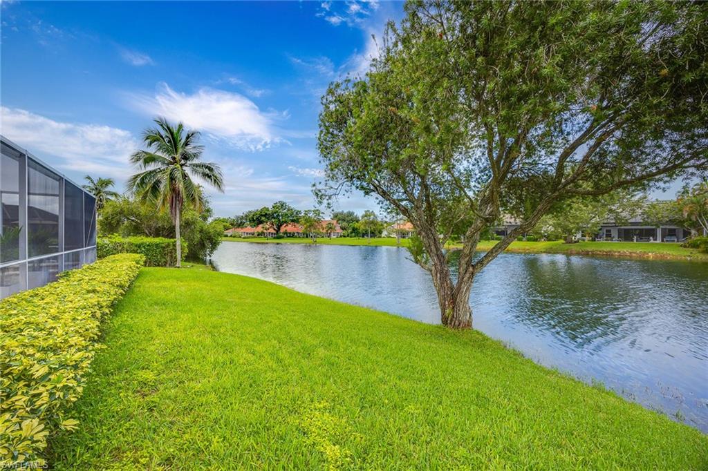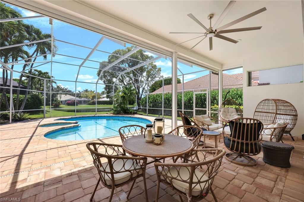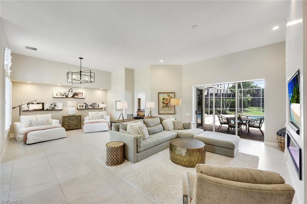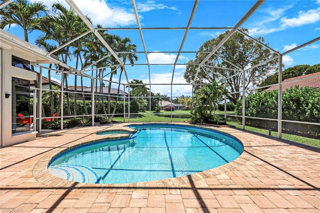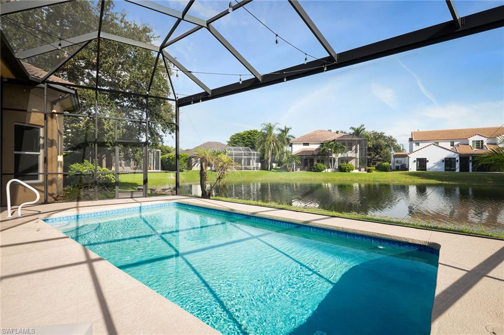 Welcome to this elegant three-bedroom, two-bath residence with breathtaking long lake views in the coveted gated community of Monterey. On a peaceful cul-de-sac, this home is designed for relaxing and entertaining with a seamless blend of indoor and outdoor living. This tastefully renovated home offers marble herringbone primary bath flooring with expansive walk-in shower, custom cabinetry, soaking tub, dual sinks and new lighting. The kitchen is stunning with beautifully curated tiles, quartz counters, island, Bosch appliances, wine station with a carbonated water faucet and built in cooler for your beverage collection. The home features vaulted ceilings, neutral large tiles on the diagonal, large walk-in closets in primary suite, split bedroom floor plan ensuring privacy with primary on one side and guest rooms on the other. The kitchen flows effortlessly to the family room with French doors that open to the spacious screened lanai with a private pool and spa, all overlooking the picturesque, serene lake. Monterey is an amenity-rich community with three Har Tru tennis courts, pickleball/sports court, playground, pool, fitness and more. Centrally in North Naples, with excellent A-plus rated schools, high-end shopping, dining, gorgeous beaches all just minutes away. Don’t miss this opportunity to live the ideal Naples lifestyle!