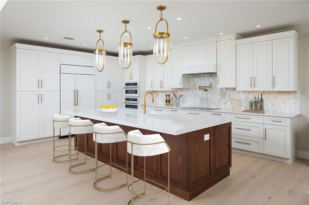 Look no further than this reimagined, redesigned, stunning Monterey residence. This meticulously renovated home boasts four bedrooms plus den/office with three full baths and powder room. Thoughtfully designed, open concept floor plan that flows effortlessly for your comfort and enjoyment. The gourmet kitchen boasts JennAir appliances, Bosch dishwasher, Taj Mahal quartzite counters, custom kitchen shelves and cabinetry with Rejuvenation Brass hardware, LED lighting under cabinets and shelves, custom fluted wood under island, Zephyr beverage refrigerator, Zephyr monsoon hood vent and gorgeous Visual Comfort concrete pendant lights. Additional features are the beautiful white oak hardwood flooring throughout, extensive custom trim work, black iron and glass custom French doors to the office, built-ins in all closets, exquisite tiles and finishes in baths, frameless shower doors, impact 9-foot sliders, 8-foot front doors, new roof and impact windows throughout. Step outside to the expansive open lanai with pool and spa and your putting green. Monterey, is an amenity-rich community and near excellent public and private schools. Amazing location for shopping, dining and our gorgeous beaches! Don’t miss this Monterey gem.