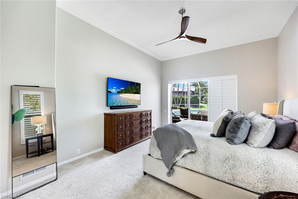Beautifully updated pool home on a quiet lakefront lot in the highly sought-after Monterey lives large with an open great room layout, a deep covered lanai, 12-foot ceilings inside and out and eight-foot doors. Many improvements have been made, including impact windows and lanai doors (two mitered glass windows are not impact), a new picture frame lanai enclosure (2018), a new roof (2017), a renovated primary bath (2022), a new AC system and AC ductwork (2023), gorgeous mahogany-stained Plastpro front doors, a Clopay garage door, new interior doors, beautiful hardwood flooring and newer baseboards and casings throughout the living area and bedrooms. Spectacular full renovation of the primary bath with sparkling quartz counters, an exquisite oversized walk-in shower with no threshold, gleaming subway tile, a dual rain head and dual Aquabliss handheld shower heads. The open kitchen with a granite island is the perfect gathering area with beautiful white cabinetry, drawers and pull-outs, a walk-in pantry and a new Samsung stainless steel refrigerator and range. Other features include plantation shutters, well for irrigation and an oversized side-load garage with built-in cabinets and epoxy floors. The versatile floor plan offers a study with a closet that can be used as a fourth bedroom and a separate den area is easily convertible into second home office or enclosed playroom. The meticulous, move-in condition and negotiable furniture offerings complete the package. Monterey continues to be among the leading communities in North Naples conveniently located just three miles to Vanderbilt Beach and two miles to Mercato and Waterside Shops with a 24-hour guarded gatehouse. Excellent amenities include an award-winning clubhouse for private events, a fitness center, heated lap pool, Har-Tru tennis courts with active tennis programs, kids play area, and a basketball/pickleball court. A-rated public schools and three excellent private schools nearby.