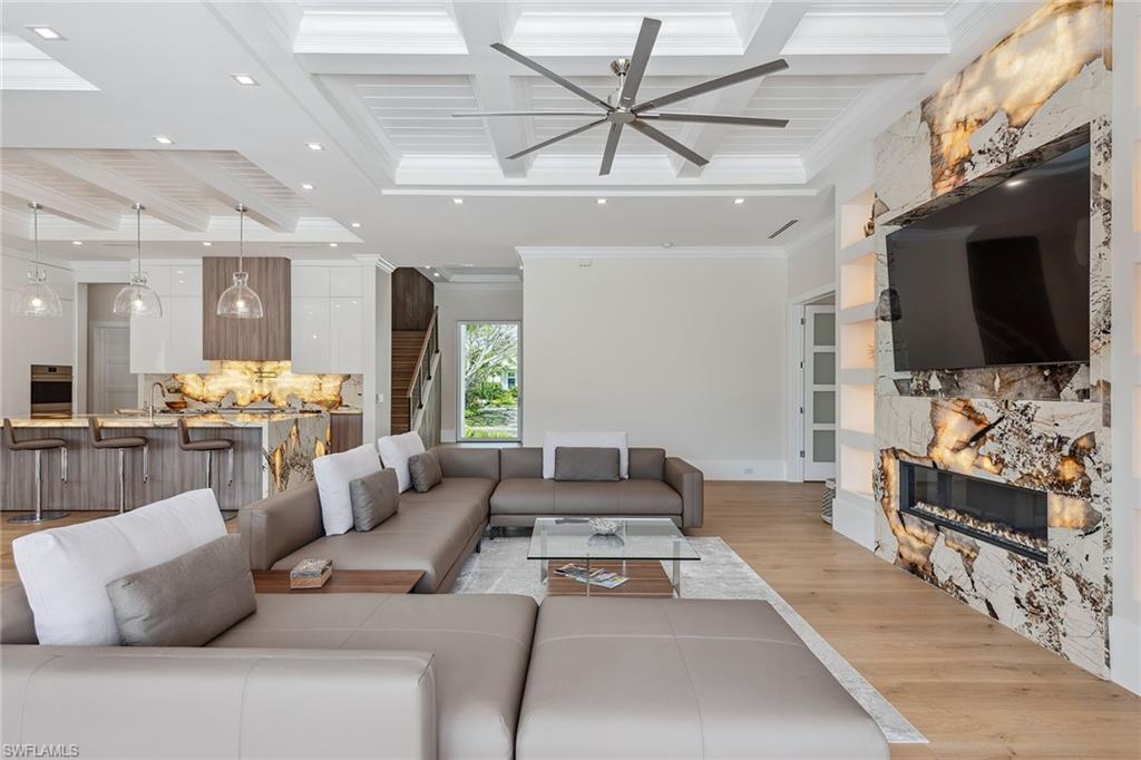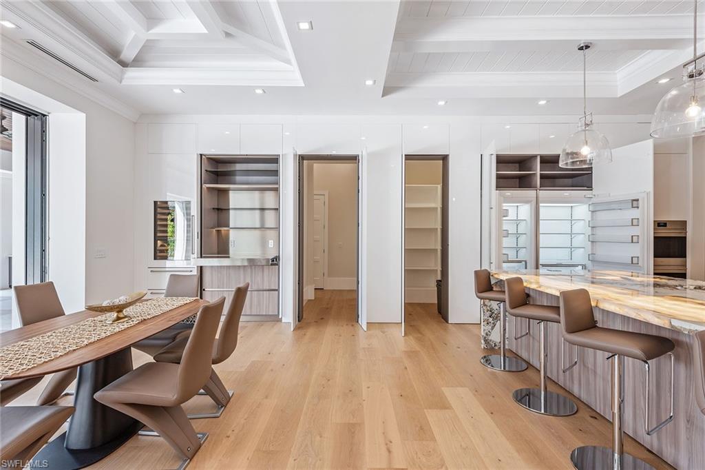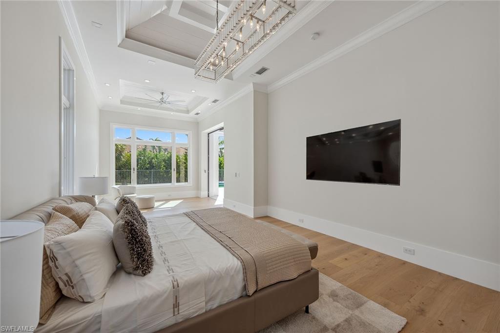 High and dry no Ian damage, water line only half up the driveway! House sits on hill. Available Today - move in ready! A stunning mansion, perfectly located in the Moorings with excellent deep wide bay views and soothing sunsets! The front foyer leads you up a winding staircase to the 2nd floor personal library, showcasing the lots of wood floorings and gorgeous, wood beam, coffered ceilings. Fully equipped with a top-of-the-line kitchen, exterior grilling accommodations, and an amply spaced 4-car garage -- this home will not disappoint! With over 5000 square feet of living area, full furnishings, and a fully heated pool/spa for optimal end-of-day relaxation, there is plenty of room to unwind. Just a few steps take you from the custom lanai to the boat dock, ready for your next adventure.