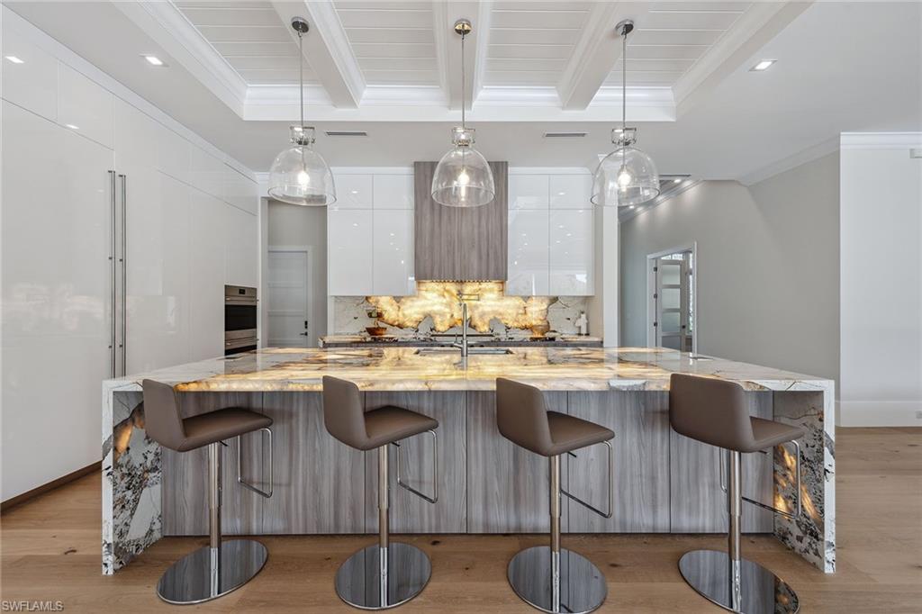 Turnkey and truly spectacular, this waterfront estate offers 126 feet of pristine water frontage and an oversized dock! This is the opportunity you’ve been dreaming of—an elegantly updated, prestige Mediterranean-style residence featuring 4 bedrooms plus a den, 4 baths, and over a story and a half of luxurious living space. Enjoy scenic western water views and an exceptional outdoor lifestyle with a lighted wrap-around walkway, 16,000 lb. boat lift, and quick, direct access to the Gulf of Mexico—just minutes away by boat. Enter through wrought-iron gates to a paved circular driveway and 3-car garage. Double doors lead into an elegant foyer flowing into sophisticated living and dining rooms. The superb island kitchen is appointed with Taj Mahal Quartzite countertops, brand-new Café appliances, a wet bar, dining buffet, and modern soft-close wood cabinetry. Luxurious finishes continue throughout: the master and guest baths feature Crystallo Quartzite, while the family bath highlights stunning Agate precious stone. Additional upscale amenities include COREtec luxury vinyl flooring, a Lumitron lighting system, tray ceilings, crown molding, and impact-resistant windows throughout. Private membership to the Moorings Beach Club is available, and with quick access to the world-class dining and boutique shopping of 5th Ave. S—plus the beach less than a mile away—you’ll experience the best of Naples living at your doorstep.