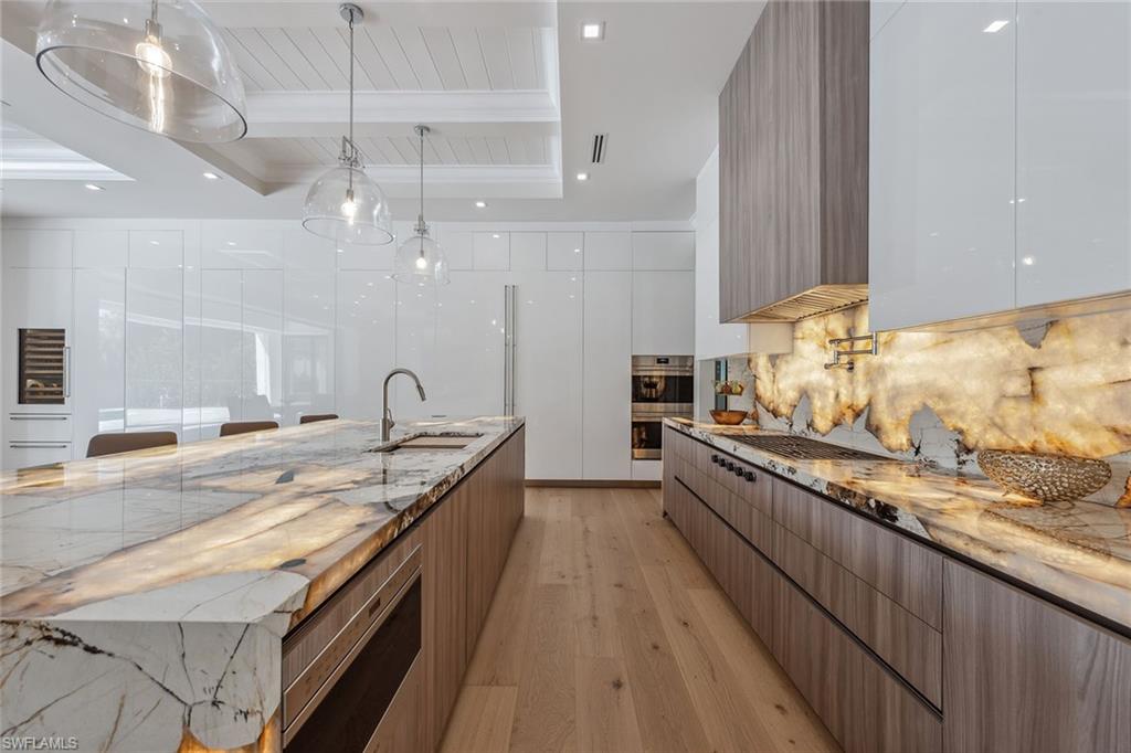 Designed by JMDG Architecture, this luxurious home offers a seamless blend of elegance and function. The kitchen, crafted in Italy by Idea Group, features partially translucent, highest-grade onyx countertops and premium Wolf and Sub-Zero appliances, including a double oven and dishwasher. A spacious walk-in pantry adds convenience. The home's finishes, including those in the baths, are from the renowned brand Porcelanosa, showcasing sophistication in every detail. With five bedrooms, a den and 5.5 uniquely styled baths, this home offers ample space and style. Rolf Benz indoor furniture and Restoration Hardware light fixtures enhance the contemporary design, while all Anderson windows, sliders and a pivot front door add to the home's sleek appeal. Outside, enjoy the poolside fire and water feature, complete with electric hurricane shutters and rolldown screens that provide privacy or keep out bugs. The three-car garage has room for up to three car lifts. A built-in wine cooler, 1,000-gallon propane tank and Pentair water filtration system ensure comfort throughout.