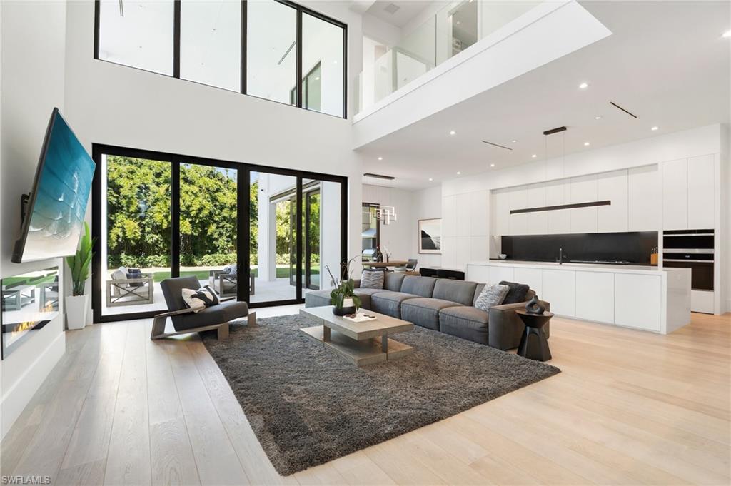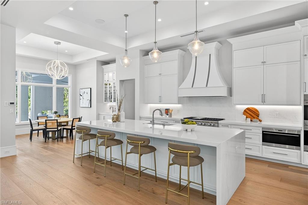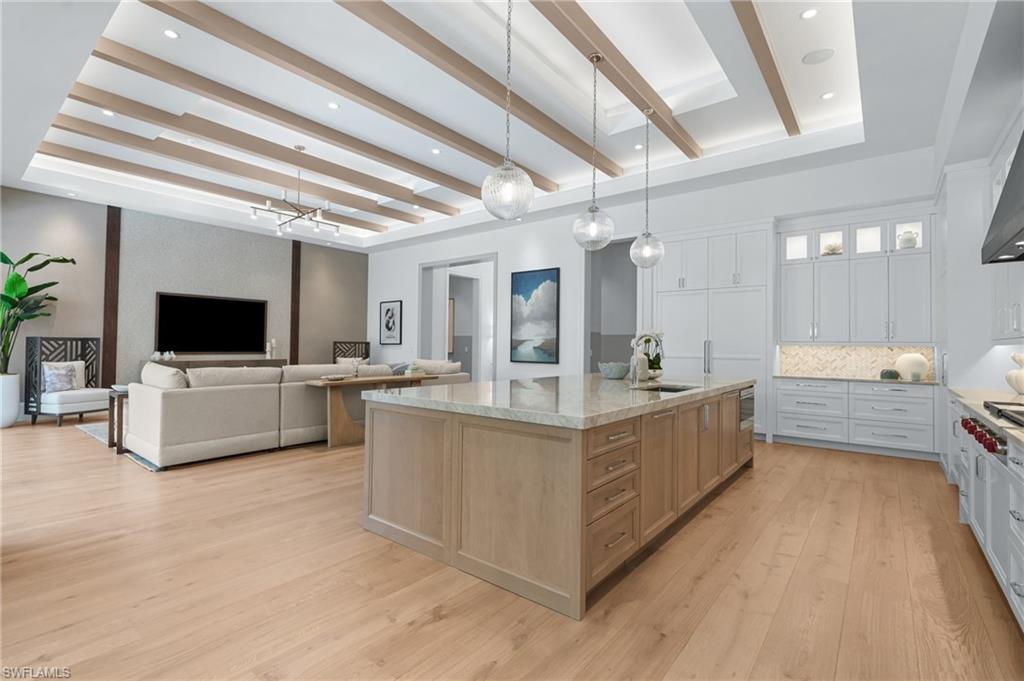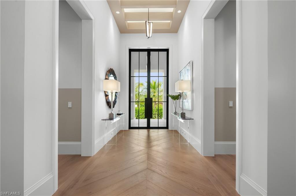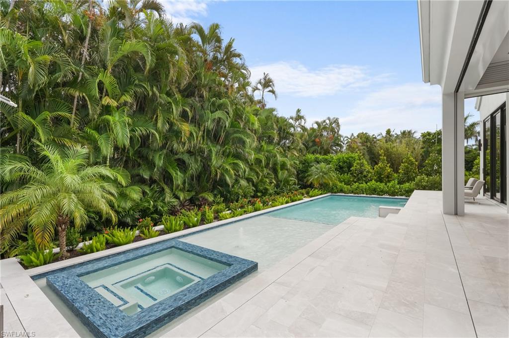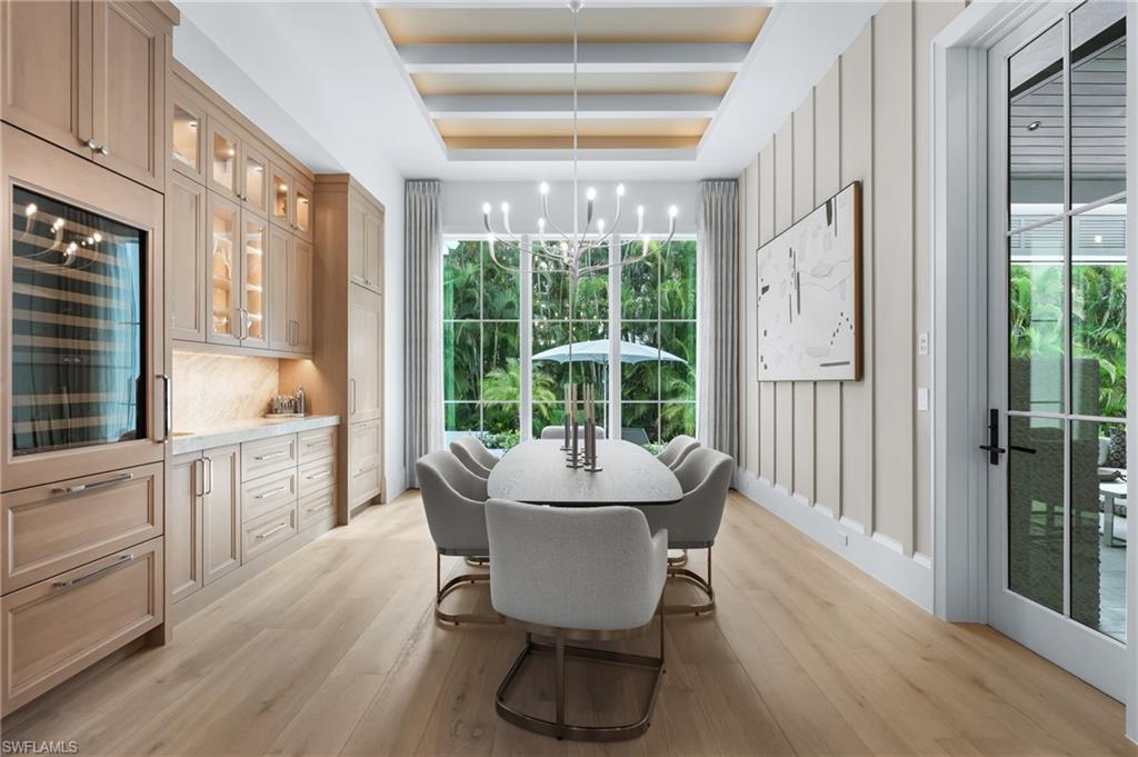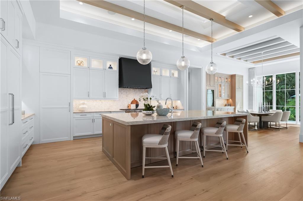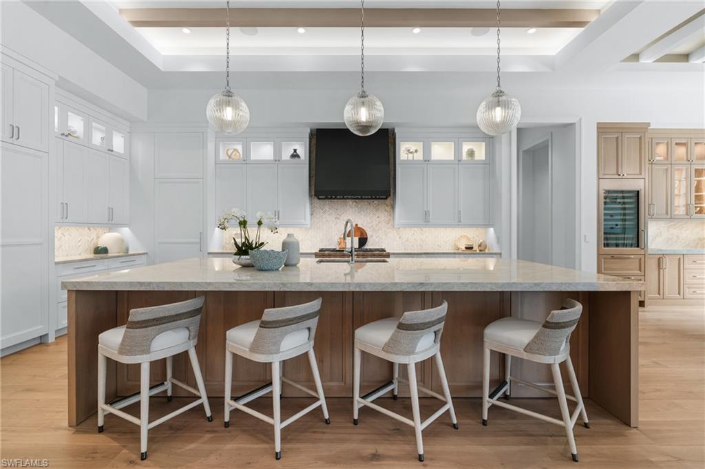 Modern Coastal Luxury Meets Biophilic Design in The Moorings — Minutes from Downtown Naples and the Beach Experience refined coastal living in this custom Borelli-built estate home that masterfully blends modern elegance, natural elements, and indoor-outdoor living. This 4,314-square-foot single-story residence was designed with a meticulous focus on biophilic design, seamlessly connecting the beauty of nature with sophisticated architectural detail. From the moment you enter through the grand double entry doors, your eyes are drawn through the open-concept living area to an outdoor entertainment oasis featuring a stunning 6-foot driftwood sculpture suspended over a sunken circular lounge with a fire pit and swim-up bar, flowing effortlessly into a resort-style pool and spa. Inside, you’ll find washed oak hardwood floors, soaring detailed ceilings, and luxury finishes throughout. The open-concept floor plan connects a chef-inspired kitchen—featuring Taj Mahal quartzite countertops, Sub-Zero and Wolf appliances, custom wood cabinetry, and a walnut wet bar—to elegant living and dining spaces perfect for both intimate gatherings and grand entertaining. This 4-bedroom + office + media OR 5 bedroom + den/flex room residence includes five full designer bathrooms. The media room with its custom built-in bar creates a stylish retreat for movies or game nights. The primary suite is a true sanctuary, offering dual custom walk-in closets, a soaking tub, oversized walk-in shower with dual shower heads, and two private water closets. Designed for the Naples lifestyle, the outdoor living area extends over 650 sq. ft. of covered space and includes a summer kitchen with grill and Green Egg station, electric roll-down screens, outdoor shower, and a fully fenced backyard surrounded by mature tropical landscaping. The southeast rear exposure ensures ideal sunshine over the pool during winter months. Additional upgrades include: • Crestron smart home automation • Generator (on order) • Integrated security and sound system • Two tankless water heaters • Electric roll down hurricane shutters • Split three-car garage with epoxy floors Located just minutes from 5th Avenue South, 3rd Street South, and Naples’ white sand beaches, this home offers private beach access through the optional Moorings Beach Park Association. Enjoy an unparalleled Naples lifestyle—morning walks on the beach, afternoons by the pool, and evenings dining in the heart of downtown. Whether you’re seeking a second home in Naples or planning a full-time relocation from the Midwest or Northeast, this residence delivers the perfect balance of sophistication, comfort, and coastal serenity.
