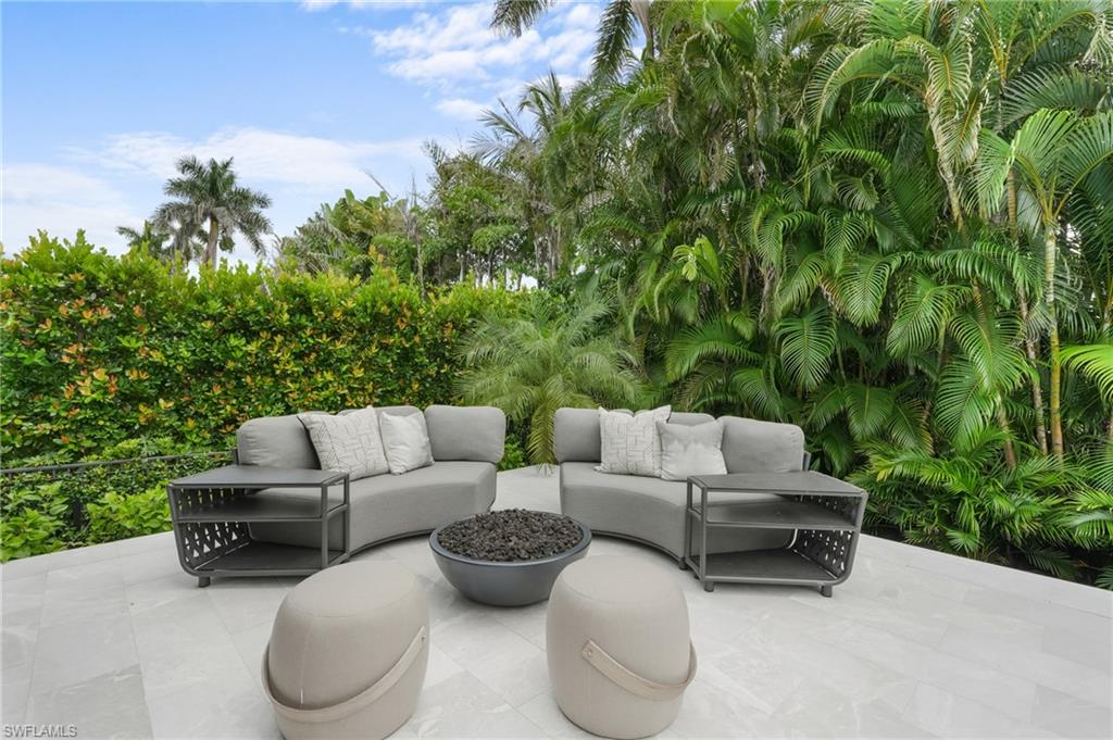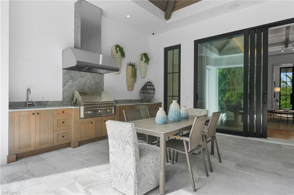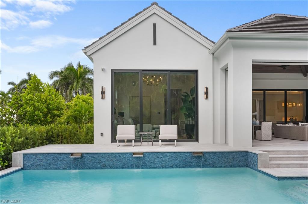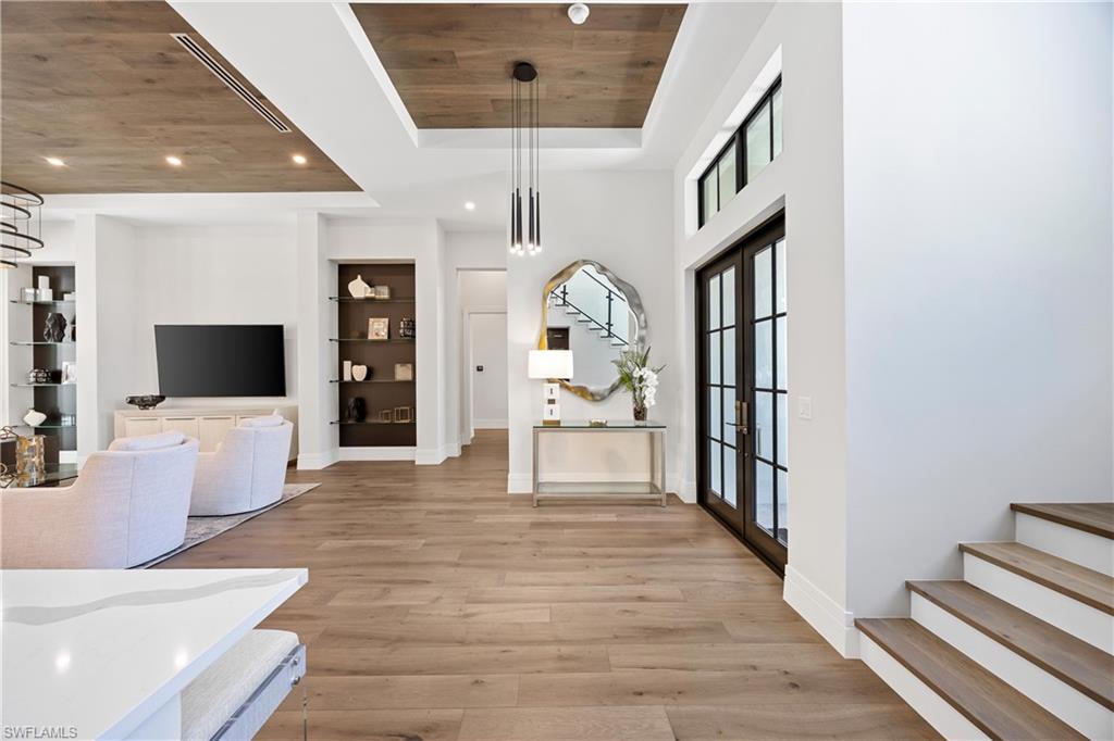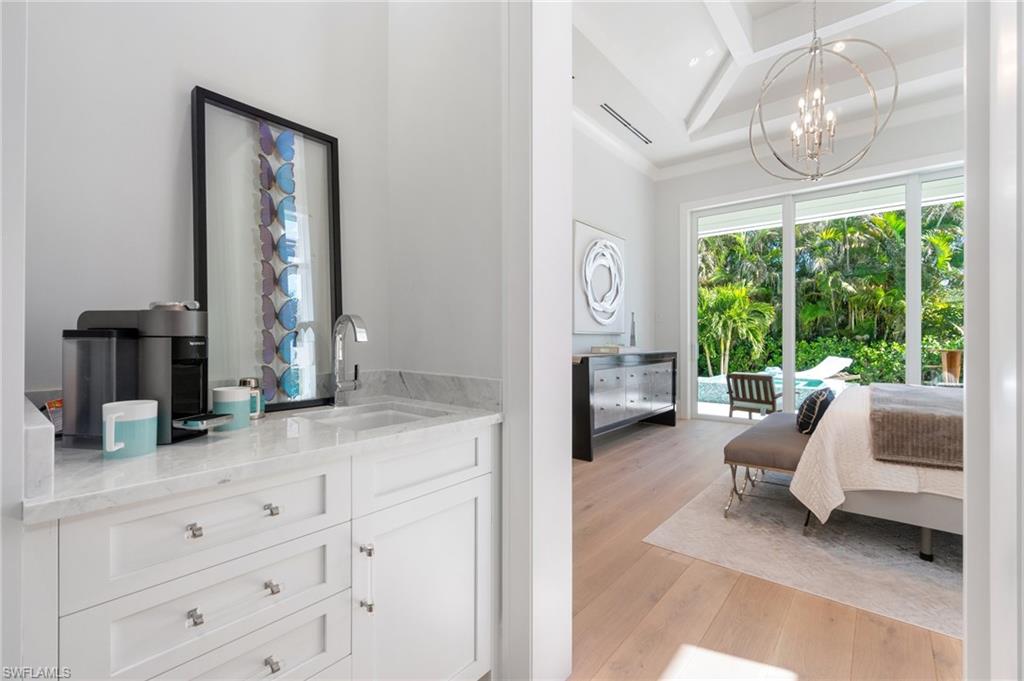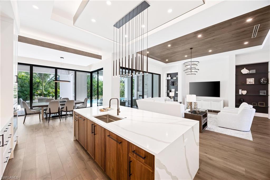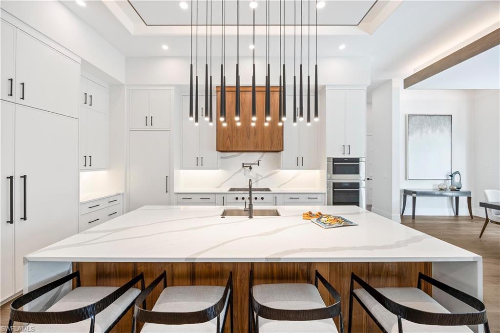 Modern Coastal Luxury Meets Biophilic Design in The Moorings — Minutes from Downtown Naples and the Beach Experience refined coastal living in this custom Borelli-built estate home that masterfully blends modern elegance, natural elements, and indoor-outdoor living. This 4,314-square-foot single-story residence was designed with a meticulous focus on biophilic design, seamlessly connecting the beauty of nature with sophisticated architectural detail. From the moment you enter through the grand double entry doors, your eyes are drawn through the open-concept living area to an outdoor entertainment oasis featuring a stunning 6-foot driftwood sculpture suspended over a sunken circular lounge with a fire pit and swim-up bar, flowing effortlessly into a resort-style pool and spa. Inside, you’ll find washed oak hardwood floors, soaring detailed ceilings, and luxury finishes throughout. The open-concept floor plan connects a chef-inspired kitchen—featuring Taj Mahal quartzite countertops, Sub-Zero and Wolf appliances, custom wood cabinetry, and a walnut wet bar—to elegant living and dining spaces perfect for both intimate gatherings and grand entertaining. This 4-bedroom + office + media OR 5 bedroom + den/flex room residence includes five full designer bathrooms. The media room with its custom built-in bar creates a stylish retreat for movies or game nights. The primary suite is a true sanctuary, offering dual custom walk-in closets, a soaking tub, oversized walk-in shower with dual shower heads, and two private water closets. Designed for the Naples lifestyle, the outdoor living area extends over 650 sq. ft. of covered space and includes a summer kitchen with grill and Green Egg station, electric roll-down screens, outdoor shower, and a fully fenced backyard surrounded by mature tropical landscaping. The southeast rear exposure ensures ideal sunshine over the pool during winter months. Additional upgrades include: • Crestron smart home automation • Generator (on order) • Integrated security and sound system • Two tankless water heaters • Electric roll down hurricane shutters • Split three-car garage with epoxy floors Located just minutes from 5th Avenue South, 3rd Street South, and Naples’ white sand beaches, this home offers private beach access through the optional Moorings Beach Park Association. Enjoy an unparalleled Naples lifestyle—morning walks on the beach, afternoons by the pool, and evenings dining in the heart of downtown. Whether you’re seeking a second home in Naples or planning a full-time relocation from the Midwest or Northeast, this residence delivers the perfect balance of sophistication, comfort, and coastal serenity.
