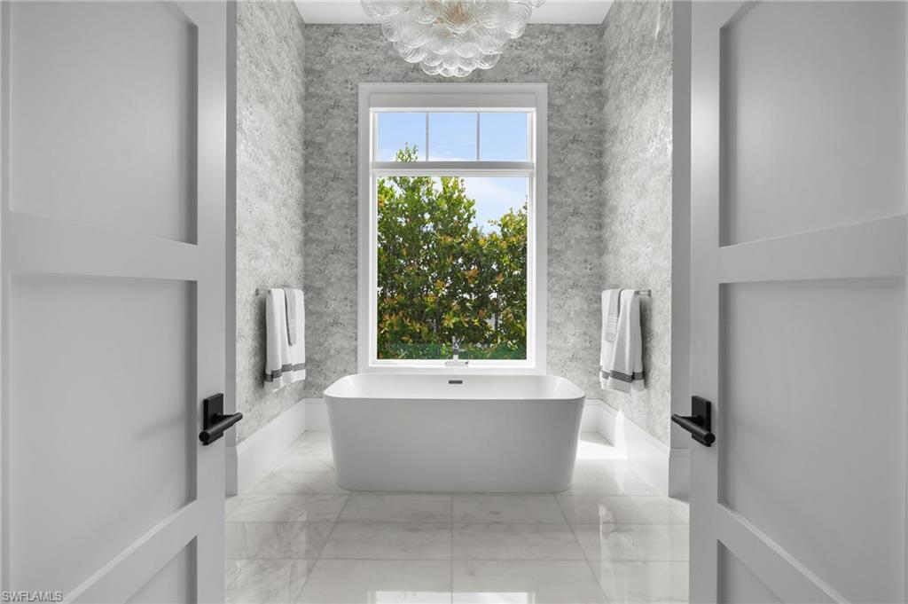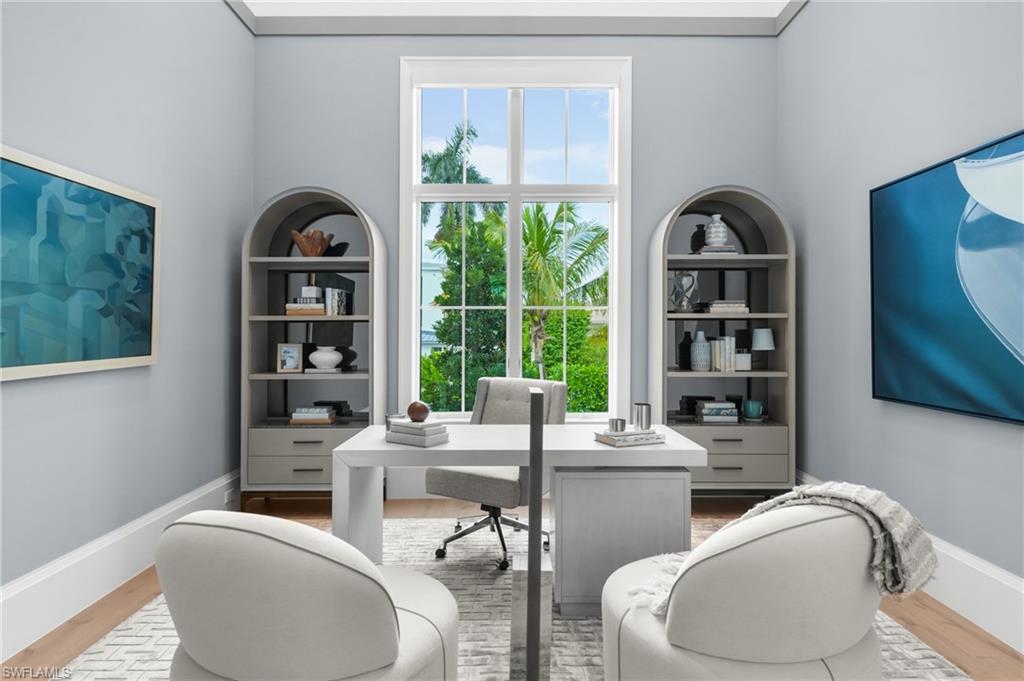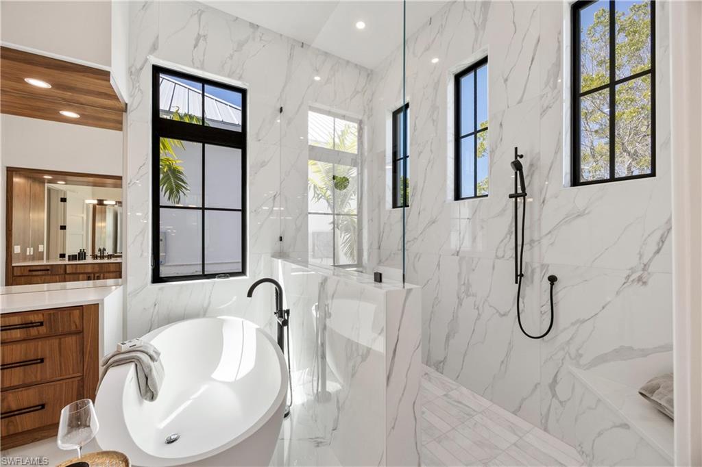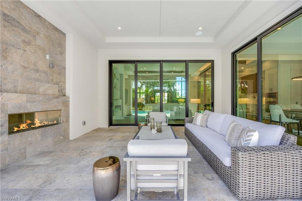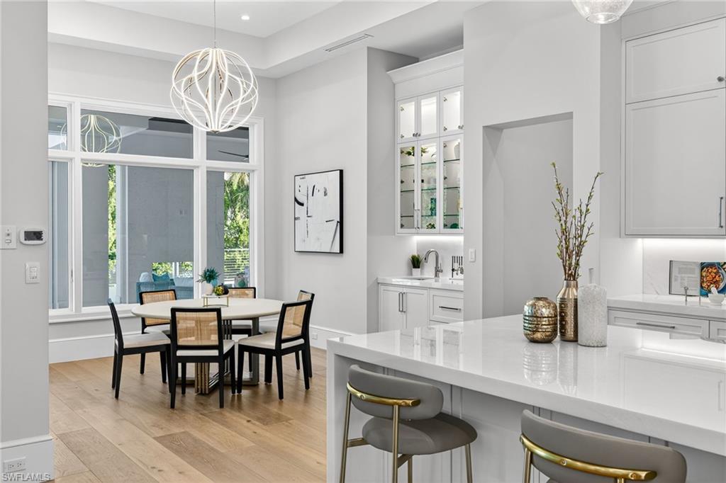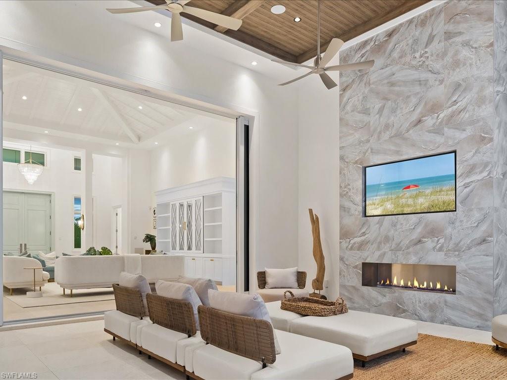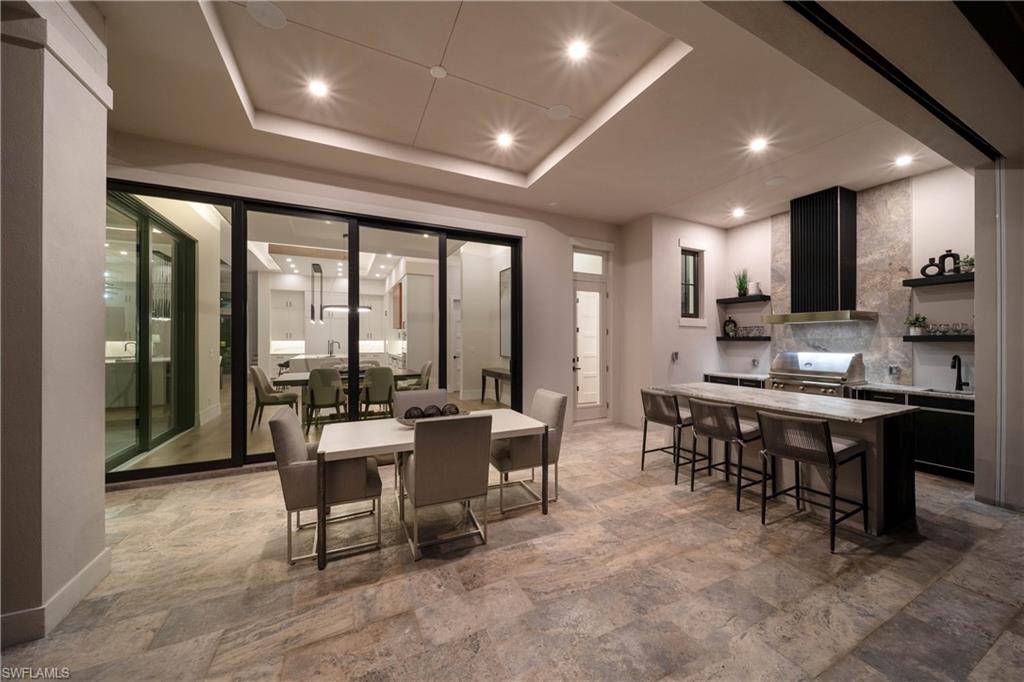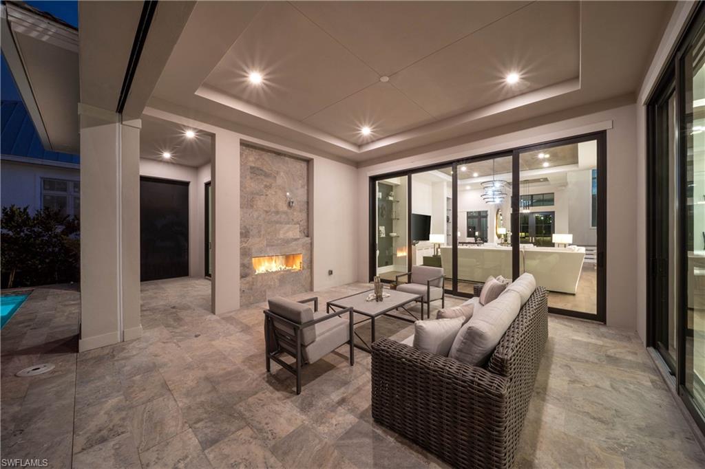 Modern Coastal Luxury Meets Biophilic Design in The Moorings — Minutes from Downtown Naples and the Beach Experience refined coastal living in this custom Borelli-built estate home that masterfully blends modern elegance, natural elements, and indoor-outdoor living. This 4,314-square-foot single-story residence was designed with a meticulous focus on biophilic design, seamlessly connecting the beauty of nature with sophisticated architectural detail. From the moment you enter through the grand double entry doors, your eyes are drawn through the open-concept living area to an outdoor entertainment oasis featuring a stunning 6-foot driftwood sculpture suspended over a sunken circular lounge with a fire pit and swim-up bar, flowing effortlessly into a resort-style pool and spa. Inside, you’ll find washed oak hardwood floors, soaring detailed ceilings, and luxury finishes throughout. The open-concept floor plan connects a chef-inspired kitchen—featuring Taj Mahal quartzite countertops, Sub-Zero and Wolf appliances, custom wood cabinetry, and a walnut wet bar—to elegant living and dining spaces perfect for both intimate gatherings and grand entertaining. This 4-bedroom + office + media OR 5 bedroom + den/flex room residence includes five full designer bathrooms. The media room with its custom built-in bar creates a stylish retreat for movies or game nights. The primary suite is a true sanctuary, offering dual custom walk-in closets, a soaking tub, oversized walk-in shower with dual shower heads, and two private water closets. Designed for the Naples lifestyle, the outdoor living area extends over 650 sq. ft. of covered space and includes a summer kitchen with grill and Green Egg station, electric roll-down screens, outdoor shower, and a fully fenced backyard surrounded by mature tropical landscaping. The southeast rear exposure ensures ideal sunshine over the pool during winter months. Additional upgrades include: • Crestron smart home automation • Generator (on order) • Integrated security and sound system • Two tankless water heaters • Electric roll down hurricane shutters • Split three-car garage with epoxy floors Located just minutes from 5th Avenue South, 3rd Street South, and Naples’ white sand beaches, this home offers private beach access through the optional Moorings Beach Park Association. Enjoy an unparalleled Naples lifestyle—morning walks on the beach, afternoons by the pool, and evenings dining in the heart of downtown. Whether you’re seeking a second home in Naples or planning a full-time relocation from the Midwest or Northeast, this residence delivers the perfect balance of sophistication, comfort, and coastal serenity.