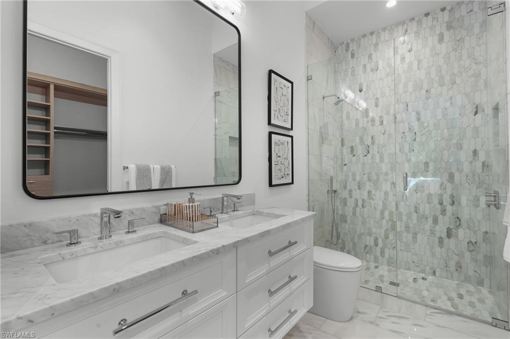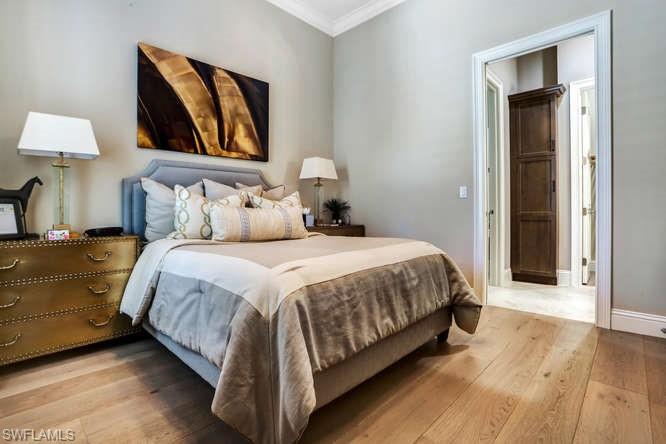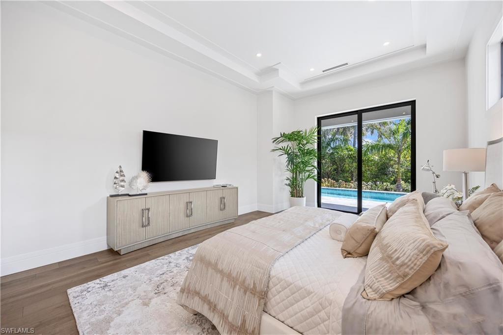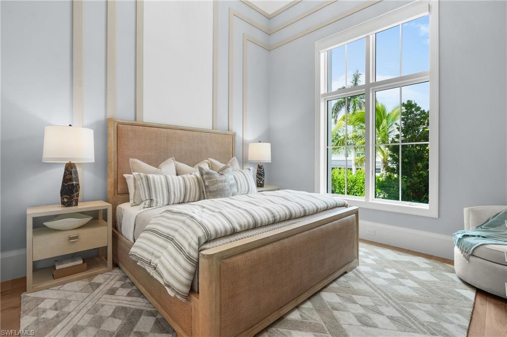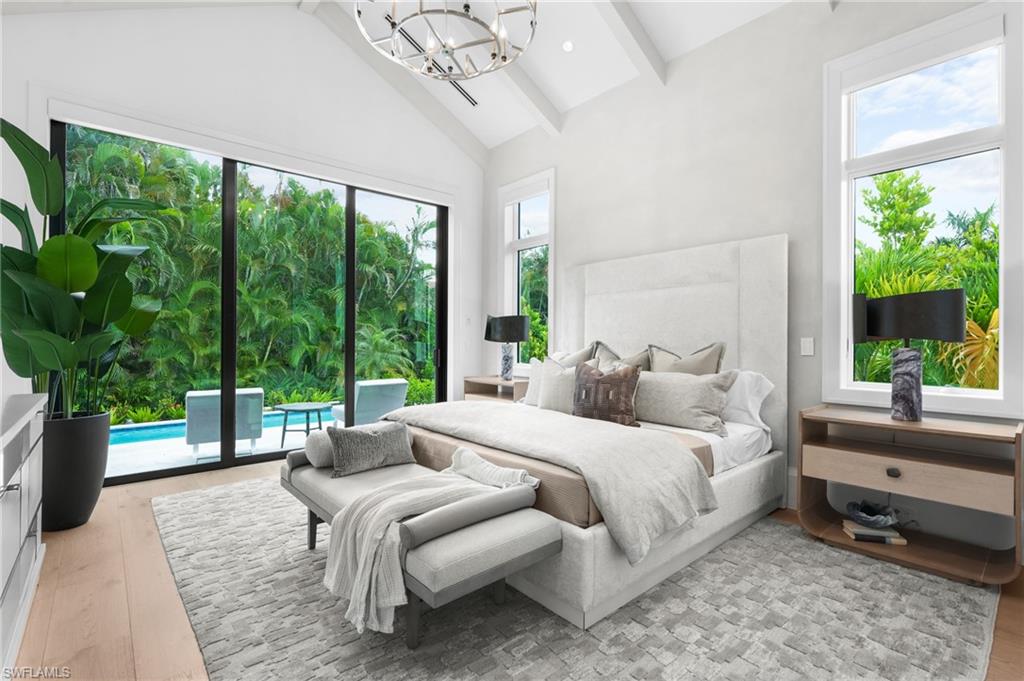 Experience modern luxury in this brand-new Moorings estate built by renowned Borelli Construction. Spanning 4,400 square feet on one level, this residence offers five en-suite bedrooms, with one designed as a private office with soaring ceilings. Fully furnished and styled by Clive Daniel Home, the interior showcases custom wall treatments, designer finishes, and thoughtful details throughout. The chef’s kitchen is complemented by a spacious butler’s pantry functioning as a fully equipped second kitchen, while the stunning great room boasts a dramatic ceiling with LED accent lighting. Wolf and SubZero appliances, European white oak flooring, Samsung Frame TVs, Crestron home & lighting automation, and a whole house generator provide the ultimate in luxury and convenience. The lanai features motorized screens and shutters for comfort and storm protection, while the desirable eastern exposure delivers year-round sun on the pool and a shaded lanai at sunset. Third-level pull-downs in the primary closets maximize storage. Located west of Crayton Road across from waterfront homes, this elevated residence meets current FEMA requirements for the home and all mechanicals. Its central location offers quick access to the private Moorings Beach access and all that Naples has to offer.