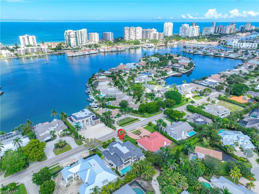 This is the optimum waterfront site for a sailor or power-boater who wants a sheltered mooring site with almost immediate access to the gulf. Doctor's Pass is five minutes from the dock. There are no bridges and adequate depth! The southwest exposure from the rear yard and dock provides stunning sunsets over the wide lagoon, and the soft prevailing sea-breezes keep the pool area comfortable year-round. The residence has been completely re-constructed over the last two years with a new roof, new partition walls, baseboards, cabinetry baths, appliances and HV/AC equipment, and is ready for owner decorating and occupancy or rental. The floor plan has split primary suites, a third guest bedroom and a large den or office. Surrounded by mature live oaks in one of Naples loveliest neighborhoods, it is offered at lot value and awaits your pleasure.