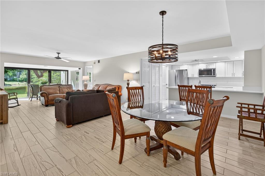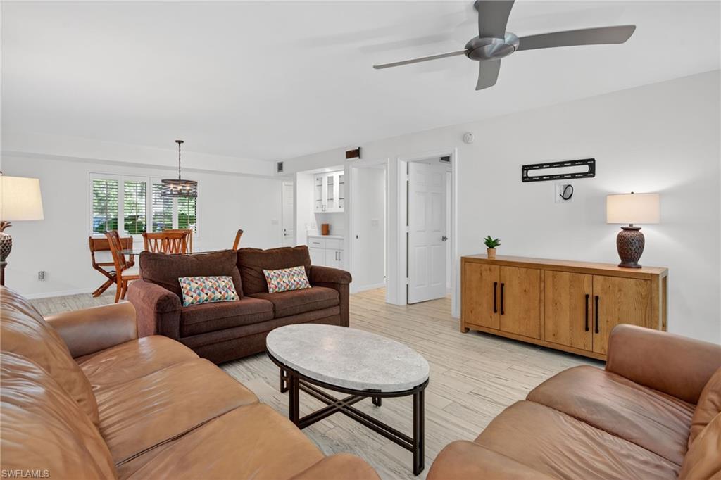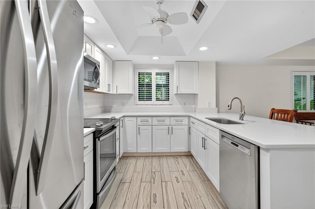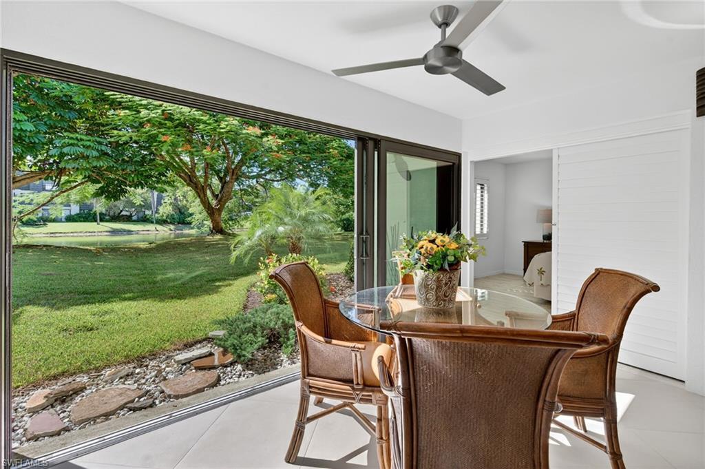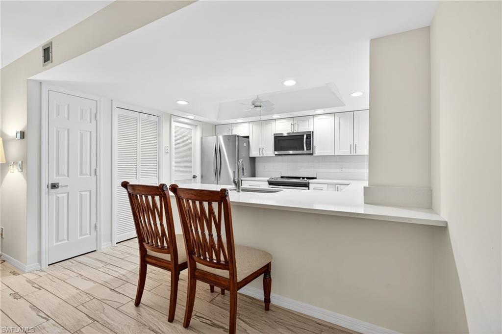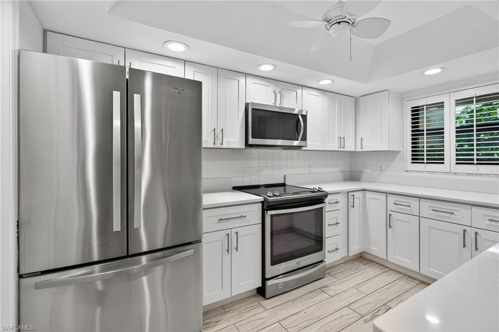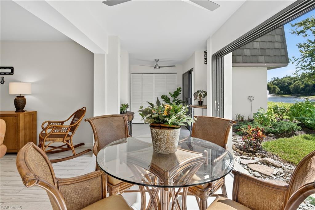 **MOTIVATED SELLERS!** Welcome to this fully remodeled, move-in ready first-floor end unit in the highly sought-after, pet friendly (large dogs allowed) community of Naples Bath and Tennis. All assessments have been paid, providing peace of mind for the new owner. This beautiful condo has been updated from top to bottom, featuring luxury vinyl plank flooring throughout for a modern, low-maintenance living experience. The bright and airy kitchen boasts newer stainless steel appliances, sleek white quartz countertops, white cabinetry, and a timeless subway tile backsplash. Recessed lighting adds a touch of elegance, enhancing the open and inviting space. The unit also includes impact-resistant glass for added security and storm protection. Storage is abundant throughout, with spacious closets and an external storage unit just outside the door. The large pantry cabinet ensures that all your kitchen essentials stay neatly organized. The enclosed lanai adds additional living space under air, offering a perfect spot to relax while enjoying stunning views of the serene lake and lush landscaping. The master suite is a true retreat, featuring a gorgeous glass-enclosed shower, white vanity with quartz countertops, and a generously sized walk-in closet. The guest bedroom is equally spacious, providing comfort and privacy for visitors. Naples Bath and Tennis is known for its prime location, just minutes from Naples' world-class shopping, dining, and entertainment options. The Gulf of Mexico's pristine white sand beaches are only a short drive away. This is a rare opportunity to own a beautifully renovated condo in one of the most desirable communities in Naples.