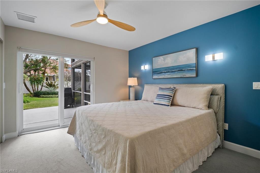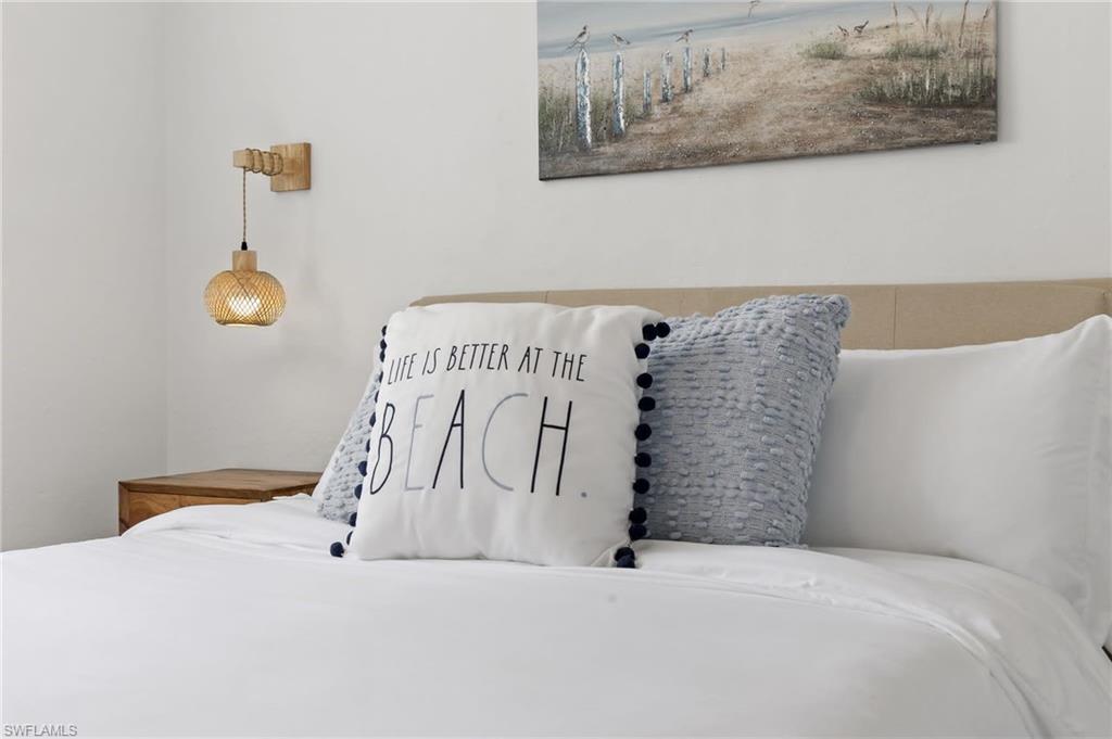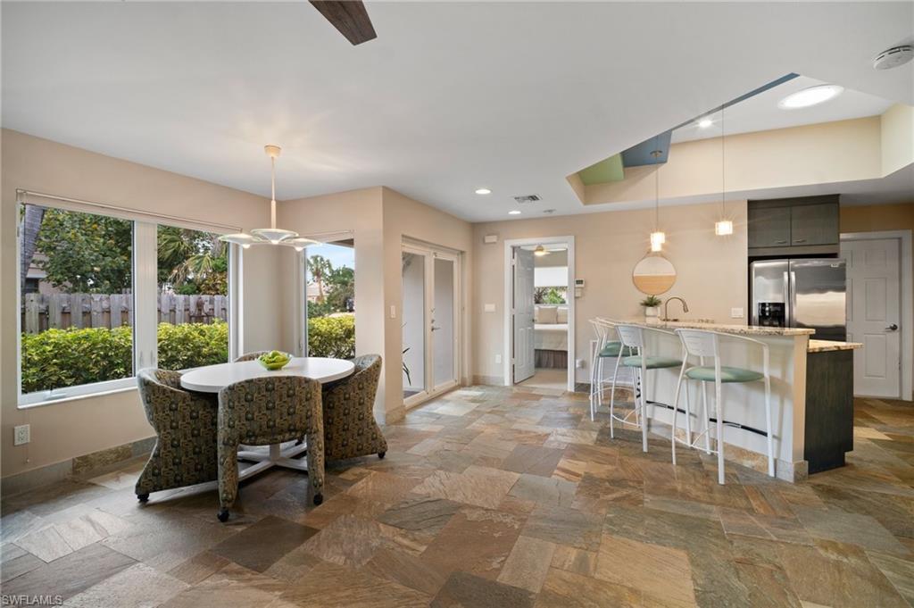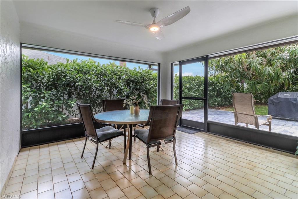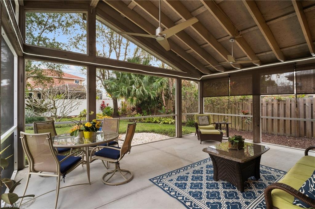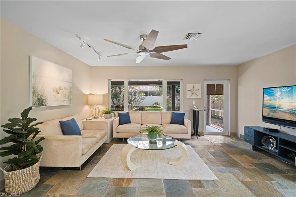 New A/C July 2025! Pool freshly updated! Nestled between Vanderbilt Beach, Mercato, and the Ritz Carlton Beach Resort lies the ultimate Naples beach house retreat. With no homeowners association or rental restrictions, this turnkey furnished home offers exceptional flexibility as a vacation rental, seasonal escape or full-time residence. The unique floor plan offers opportunity for lots of guest space or multi-generational living! Thoughtfully designed with a laid-back coastal aesthetic, the residence spans 1,820 square feet and includes three bedrooms, a den and two full baths. The second bath has been updated to include a walk-in shower with sparkling white penny tile. Interiors feature durable, easy-care surfaces with no carpet, allowing for carefree living and hosting. The great room centers around a modern fireplace wall and includes a workspace, comfortable seating and big-screen television. The open kitchen offers generous countertop space and stainless steel appliances, flowing effortlessly into a boho-inspired dining room adorned with a stone-top table and artful chandelier. The yard is fenced for privacy, with thoughtful, low maintenance landscaping. Spacious pool and pavered deck is south facing for lots of fun in the sun. Hot tub has waterfall that spills over rock formation into the pool. Designed to accommodate gatherings of eight or more, the home includes an enclosed air-conditioned lanai with bar area and cabinet storage—perfect for entertaining. Overlooking the pool, it's a cool place to gather and entertain.