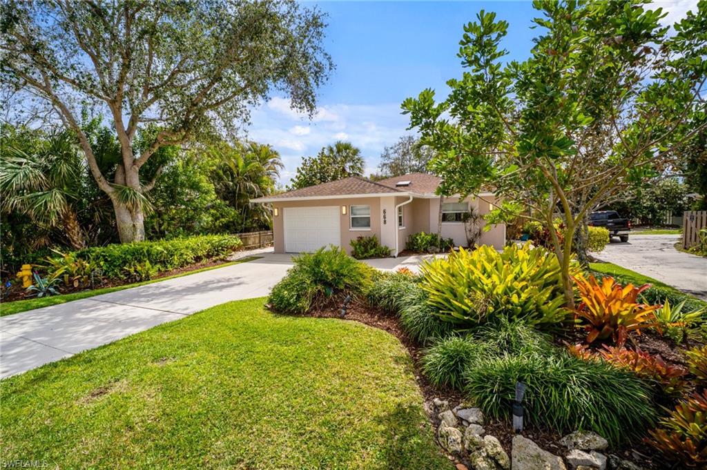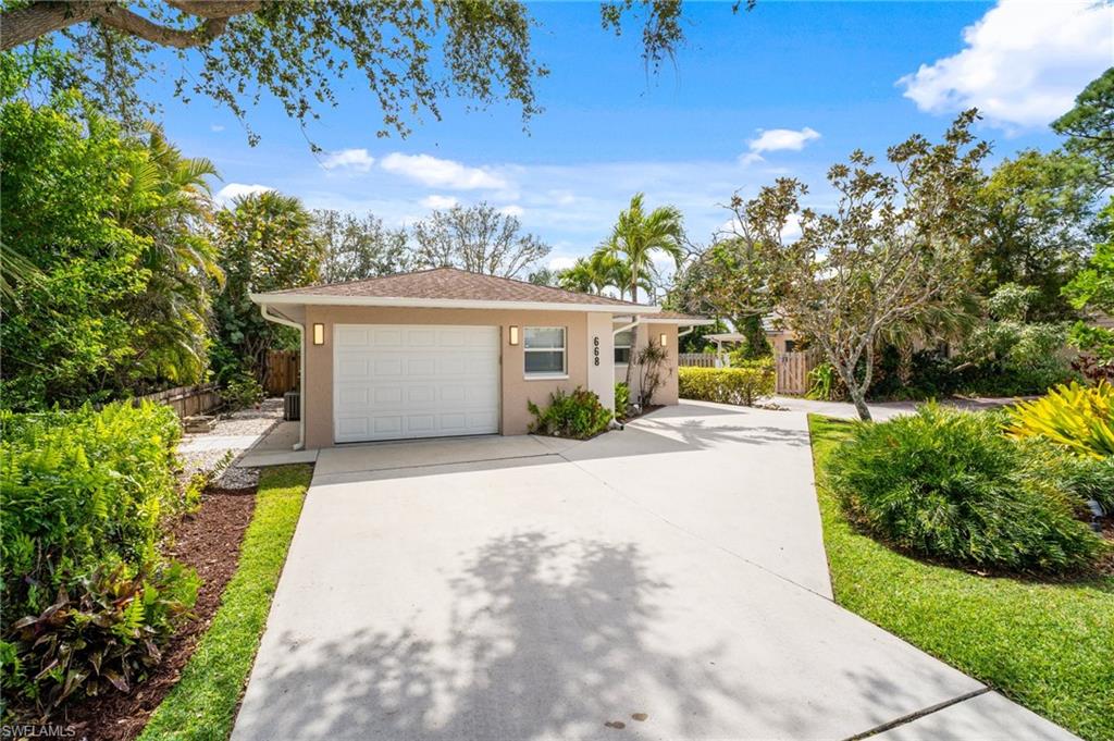 Welcome to this lushly landscaped Oasis! This beautiful home is in the heart of North Naples in a highly desirable location west of 41, and nestled in the premium, 600 block of Naples Park. No HOA fees and minutes to pristine Beaches. This welcoming home is located in designated flood zone (X500) and has had no hurricane flood damage. With Hurricane IMPACT Windows, Doors, Garage Door, Brand NEW ROOF installed in March 2025 and New Tankless Water Heater, (January 2025) this home is not only beautiful, but a solid and safe investment! Surrounded by the best that Naples has to offer, this home is just minutes to Vanderbilt Beach & Wiggins Pass State Park, Mercato, Waterside Shops, Pelican Bay Park, Pavilion Shops, Ritz Carlton, Fitness, Movie Theaters, a wide array of wonderful restaurants, Publix, Trader Joes, Whole Foods and Medical - just to name a few. With two bedrooms and two full baths, this property boasts an expansive lanai with cathedral ceiling, perfect for relaxing and entertaining outdoors. The home enjoys serene, landscaped gardens and a completely fenced, private yard. The outdoor grill is conveniently connected to the home’s gas propane system. Well-appointed with custom, wood cabinetry, high-end granite throughout, field stone flooring and wide-open floor plan, this home also enjoys an abundance of natural light. The kitchen is equipped with a gas stove and stainless-steel appliances. Large laundry room with extra storage and one car garage with room for work-bench and extra storage complete this home. This lovey home is being sold furnished and ready to move right in - Welcome Home!