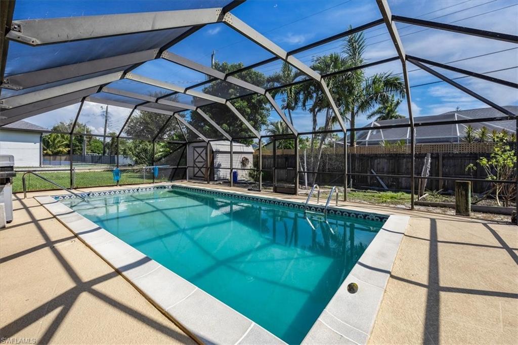 New on the market, beautiful 2+BR, 2 Full Baths, Private Laundry, New Storage Building for all of the toys, Covered Lanai, heated pool/spa home in the very desirable area of Naples Park, just a 10-minute bike ride to your choice of two amazing beaches. To the Southwest of the home, you have Vanderbilt Beach with white sandy beaches, restrooms at the entrance and a multi-level parking garage. To the Northwest you have Wiggins Pass State Park which is extremely popular with a beautiful beach front, covered seating and grilling areas, a watch tower and 7 lots for parking. No matter your choice, you will love swimming, boating, fishing and all other water activities OR you can stay at your very own home and enjoy sun and fun in your very private, fenced backyard and swim, relax, read, BBQ, eat fresh fruit from your very own fantastic Mago tree ... or whatever you want to do in your screened in pool/spa lanai. The local schools are very highly rated for your children. Restaurants and bars, Shopping and Entertainment are all close by in North Naples. Finally, a listing where the pictures match the home, no hidden surprises. Lowest priced pool home in the area, don't wait to visit because this home is priced to sell. Zoned X500 OUT of Special Flood Zone The home has never flooded in any storm and Naples Park just went through a complete County paid replacement of its entire drainage system, so all rain and storm waters run away freely. AC is 2017, Roof is 2017, Listing agent had a 4-point inspection done for buyers review to assure you that all is safe and sound. What you see is what you get so take a look now and own your personal piece of paradise today!
