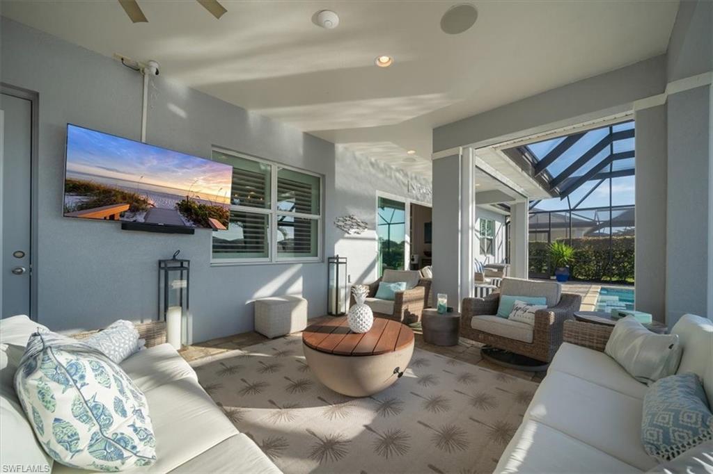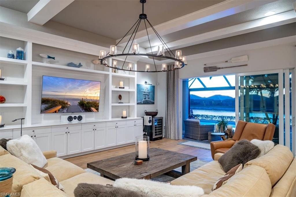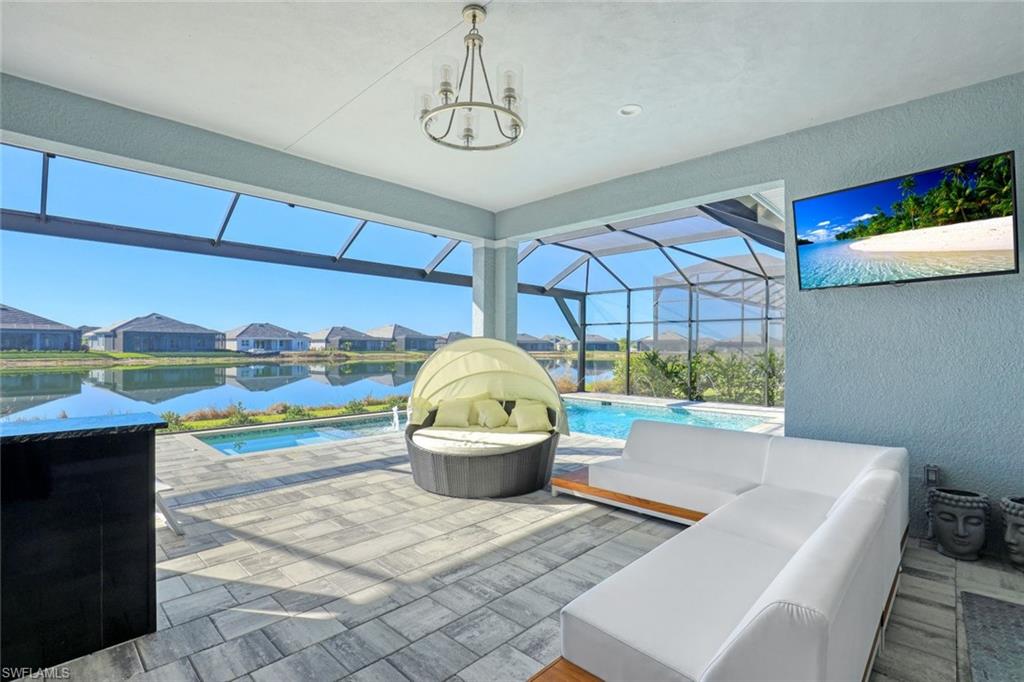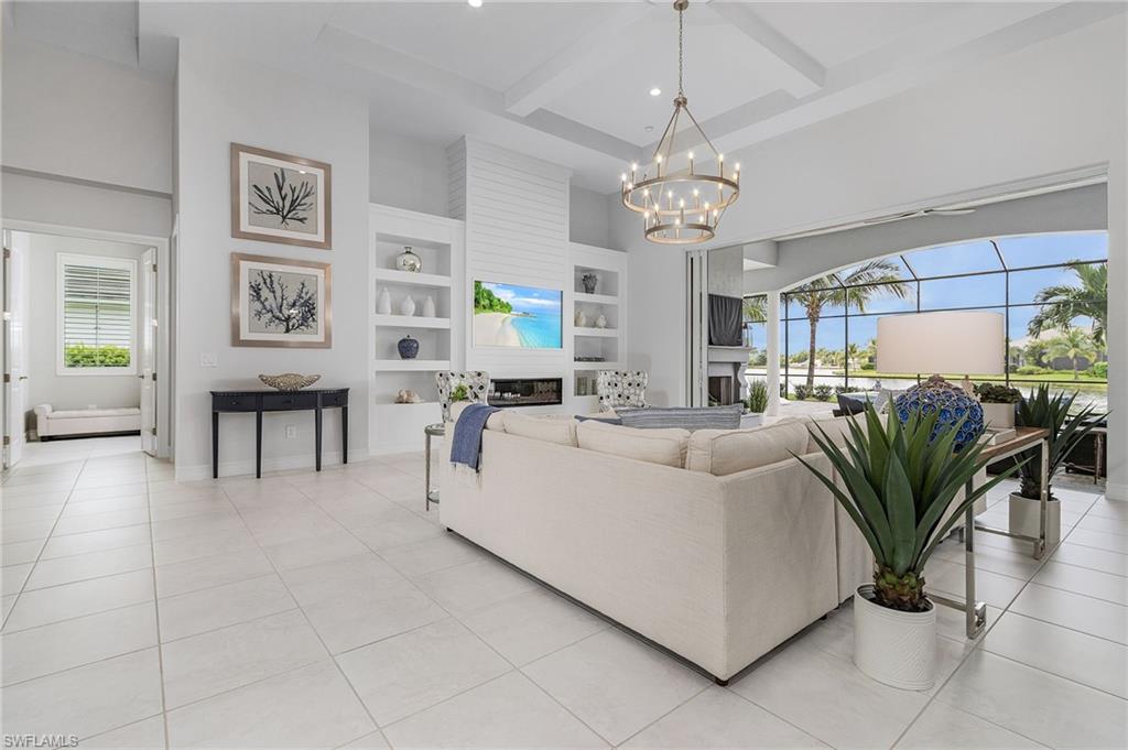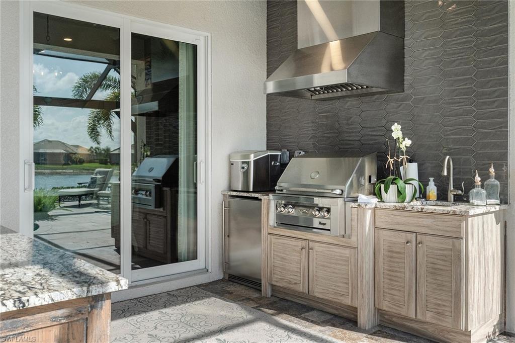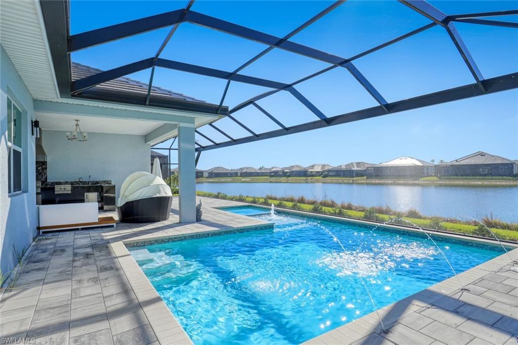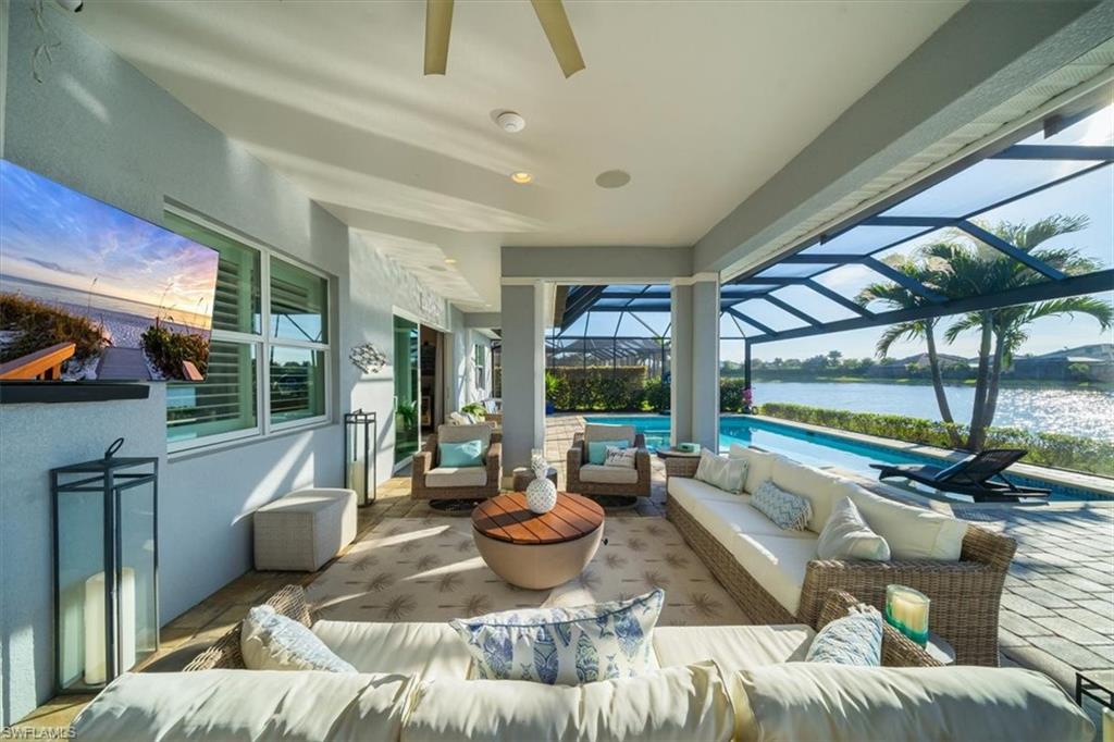 Welcome to a rare opportunity in the boutique community of Naples Reserve, where sophistication blends seamlessly with relaxed coastal living. Crafted by Stock Development, and showcasing the distinctive touches of Linda Burke Interiors, this beautiful home sits on an oversized lakefront lot, offering panoramic water views and direct access to two large lakes. For those dreaming of water recreation, a private boat dock may be built, elevating your Florida lifestyle to new heights. From interior luxury living, to the spacious lanai and pool area, this home is designed for discerning buyers who want both style and quality. Featuring 12-foot tray ceilings, expansive impact-rated windows and doors, you may entertain effortlessly in the chic, beautifully styled great room or transition to the spacious lanai where your custom Smokey Stone outdoor kitchen, dramatic waterfall pool and spa, and inviting firepit create a sanctuary. The oversized outdoor dining space is dramatic with the full kitchen, panoramic view cage, custom awning and cozy fire pit. Step inside to discover a chef’s kitchen distinguished by quartz countertops, designer cabinetry and high-end gas appliances with a cook-top range and custom designer hood. This pristine and beautifully decorated home offers the finest in finish details including plantation shutter window treatments. The primary bedroom suite is a tranquil retreat with a spa-inspired bath and dual custom designed walk-in closets. Charming French doors open to the lanai and pool area. Three guest bedrooms, a bright and spacious den and a formal dining area ensure space and privacy. The lighting throughout is custom and superior. Recently appraised for more than $2.1 million and offered with furniture negotiable, this wonderful four-bedroom plus den home requires no flood insurance. Note the immaculate three-car garage with air conditioning, extra insulation and epoxy flooring along with SunGuard tinted windows throughout, plus additional landscaping and outdoor lighting. Don't forget the 500-gallon propane tank which powers the whole-house generator and both kitchens. Every feature, from tinted SunGuard windows to professionally designed landscaping and outdoor lighting reflects luxury without compromise. With no flood insurance required and a recent high value appraisal, energy efficient upgrades, new custom-built closets and designer touches, this home offers both investment confidence and security in today's market. Enjoy a drive in the six-person golf cart (also negotiable). Naples Reserve is a sought-after community offering robust social and sports activities, a newly remodeled restaurant and kitchen, pickleball, tennis, tiki bar, a lakeside marina, a resort-style pool, a clubhouse and an activity-filled fitness center. The Marco Island lifestyle of beaches and boating are minutes away, as is the pleasure of fine cuisine in Old Naples. More than a home, it's an invitation to escape to your own paradise in Naples, FL.