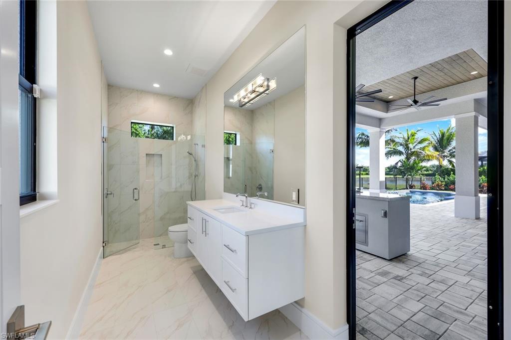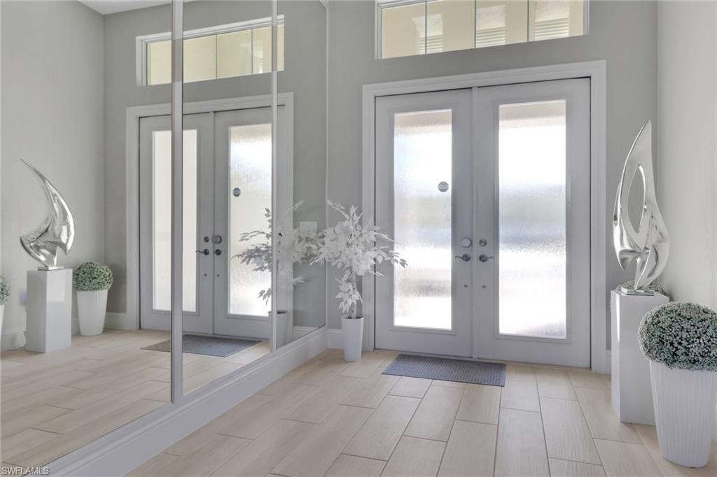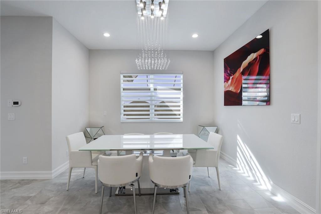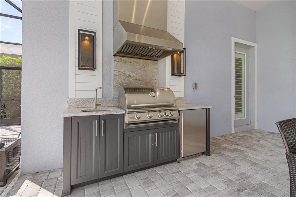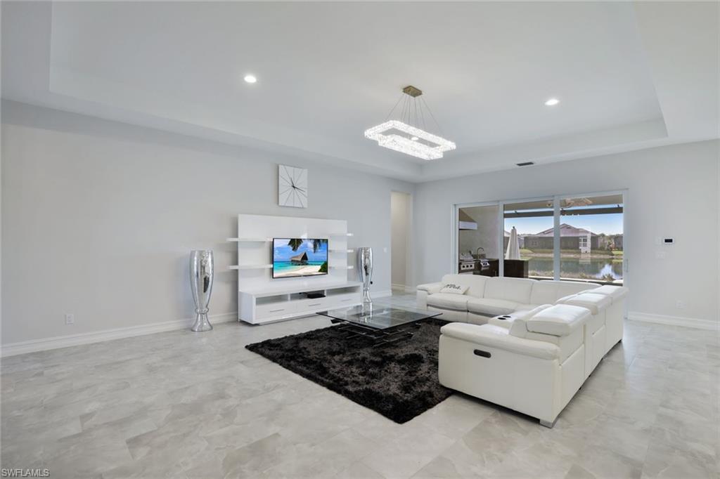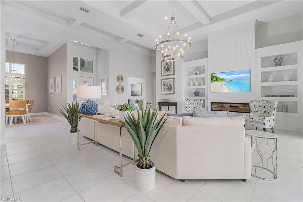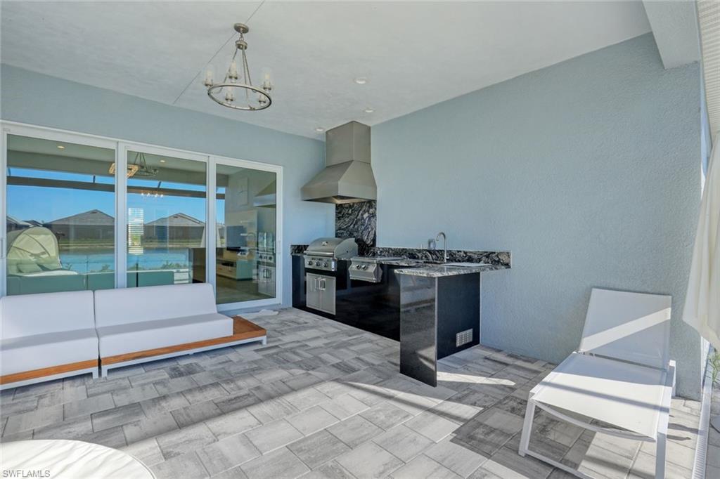 Welcome to a rare opportunity in the boutique community of Naples Reserve, where sophistication blends seamlessly with relaxed coastal living. Crafted by Stock Development, and showcasing the distinctive touches of Linda Burke Interiors, this beautiful home sits on an oversized lakefront lot, offering panoramic water views and direct access to two large lakes. For those dreaming of water recreation, a private boat dock may be built, elevating your Florida lifestyle to new heights. From interior luxury living, to the spacious lanai and pool area, this home is designed for discerning buyers who want both style and quality. Featuring 12-foot tray ceilings, expansive impact-rated windows and doors, you may entertain effortlessly in the chic, beautifully styled great room or transition to the spacious lanai where your custom Smokey Stone outdoor kitchen, dramatic waterfall pool and spa, and inviting firepit create a sanctuary. The oversized outdoor dining space is dramatic with the full kitchen, panoramic view cage, custom awning and cozy fire pit. Step inside to discover a chef’s kitchen distinguished by quartz countertops, designer cabinetry and high-end gas appliances with a cook-top range and custom designer hood. This pristine and beautifully decorated home offers the finest in finish details including plantation shutter window treatments. The primary bedroom suite is a tranquil retreat with a spa-inspired bath and dual custom designed walk-in closets. Charming French doors open to the lanai and pool area. Three guest bedrooms, a bright and spacious den and a formal dining area ensure space and privacy. The lighting throughout is custom and superior. Recently appraised for more than $2.1 million and offered with furniture negotiable, this wonderful four-bedroom plus den home requires no flood insurance. Note the immaculate three-car garage with air conditioning, extra insulation and epoxy flooring along with SunGuard tinted windows throughout, plus additional landscaping and outdoor lighting. Don't forget the 500-gallon propane tank which powers the whole-house generator and both kitchens. Every feature, from tinted SunGuard windows to professionally designed landscaping and outdoor lighting reflects luxury without compromise. With no flood insurance required and a recent high value appraisal, energy efficient upgrades, new custom-built closets and designer touches, this home offers both investment confidence and security in today's market. Enjoy a drive in the six-person golf cart (also negotiable). Naples Reserve is a sought-after community offering robust social and sports activities, a newly remodeled restaurant and kitchen, pickleball, tennis, tiki bar, a lakeside marina, a resort-style pool, a clubhouse and an activity-filled fitness center. The Marco Island lifestyle of beaches and boating are minutes away, as is the pleasure of fine cuisine in Old Naples. More than a home, it's an invitation to escape to your own paradise in Naples, FL.