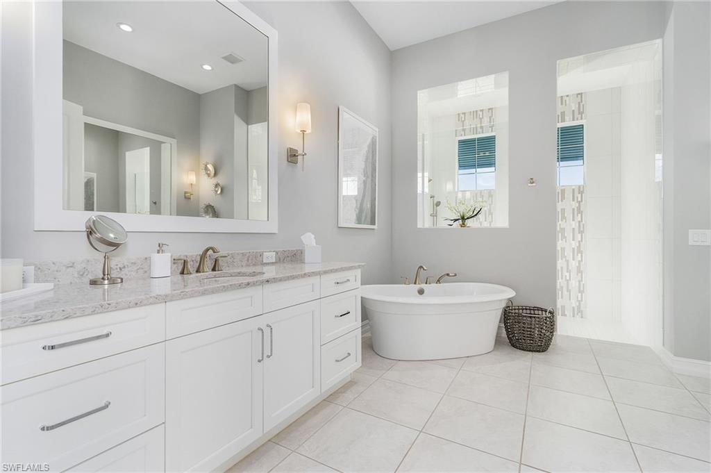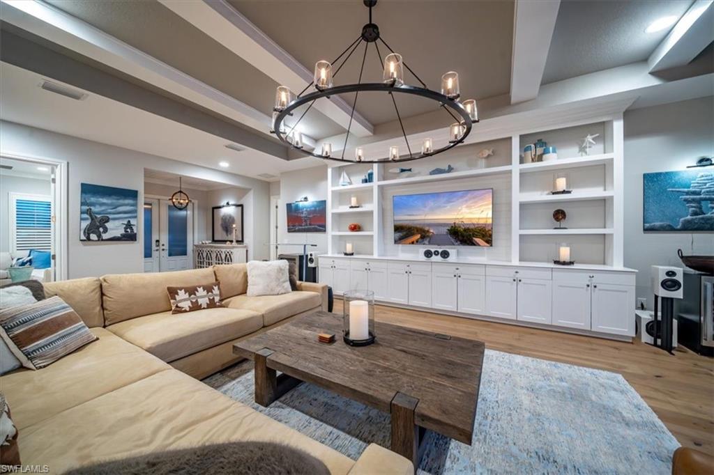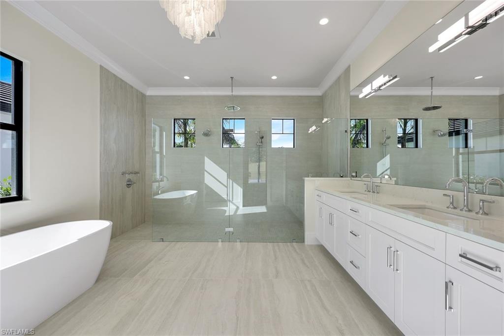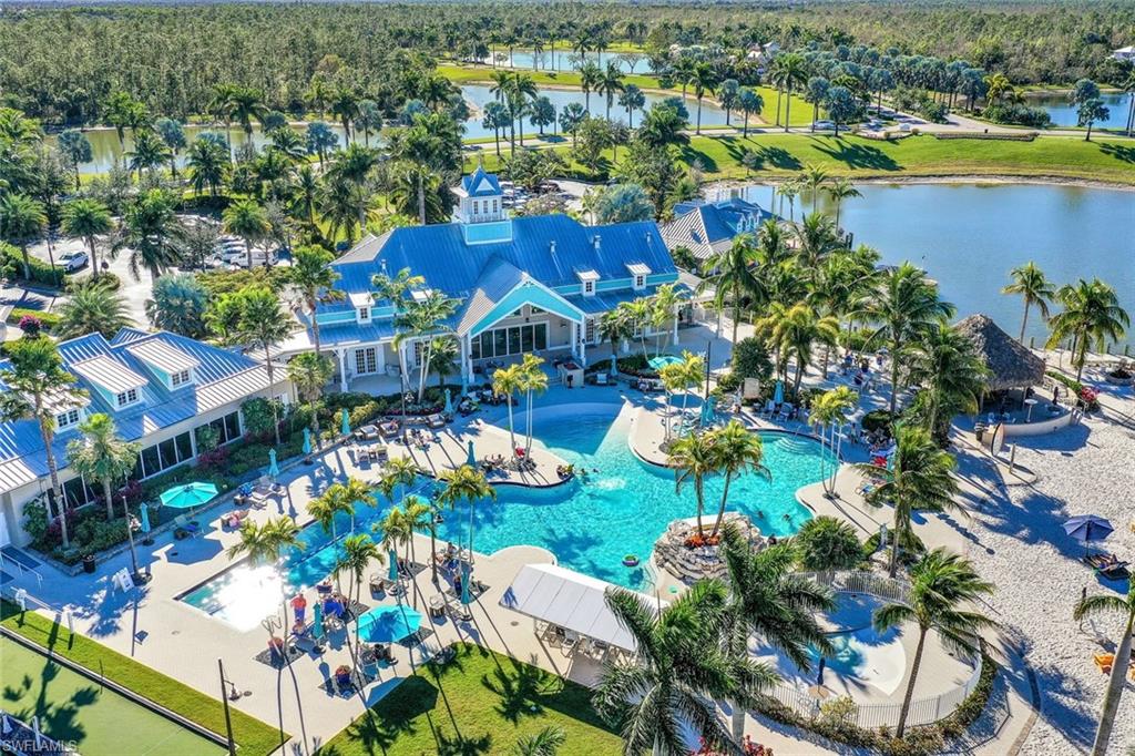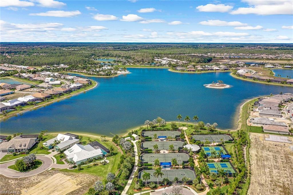 Coastal luxury describes this spectacular new Stock Homes Madison Model on one of the best lots in Naples Reserve, offering panoramic lake views & nightly sunsets. This exquisite 4 bedroom plus den, 4.5-bathroom home dazzles with 16-foot ceilings adorned with custom woodwork, upscale designer lighting, 30-inch porcelain tile and Montage wood flooring. Plenty of room in this sizable laundry room with built-in cabinetry, with ensuite bathrooms in each guest room, state of the art Xfinity Home security system, air-conditioned two car garage, water purification system, an upgraded fiberglass Advisar hurricane impact entry door, impact-resistant windows, plantation shutters, large white custom-built cornices ensconcing electronic shades and much more. The chef's kitchen is a masterpiece featuring quartz countertops, custom-designed pantry, top-of-the-line appliances, and extensive cabinetry. Enjoy entertaining under the crystal chandelier as you gaze out onto the serene lake. The master suite is a sanctuary with dual walk-in custom closets with quartz countertops and a spa-inspired bathroom, complete with a freestanding soaking tub and a walk-in shower enclosed in glass. All bedrooms feature custom upgraded closets and wood flooring. The expansive lanai is an outdoor paradise, boasting a panoramic sixty-foot pull screen for unobstructed views, generous lounging and dining spaces with marble pavers, and a fully equipped outdoor kitchen with an expansive granite wall and Vintage grill. The living room boasts a navy shiplap feature wall with all bedrooms with upgraded fans. The outside facade of the house also features genuine shiplap and Coppersmith sconces with African orchids and expansive tropical landscaping with upgraded irrigation system. The garage and finished attic are insulated with climate control and feature custom organization and cabinetry. Residents of Naples Reserve enjoy access to a state-of-the-art fitness center, a resort-style lakefront pool and beach, two dog parks, bocce, tennis, pickleball courts, dining options, walking and biking trails, a childrens play area, and 22 lakes for a wide array of water sports.