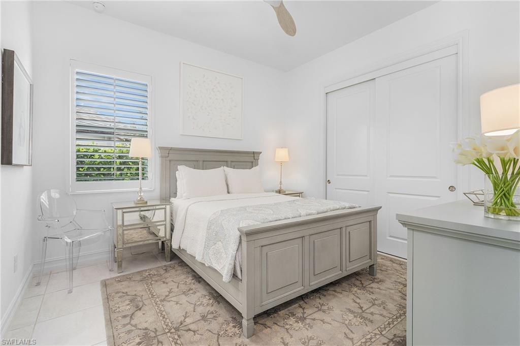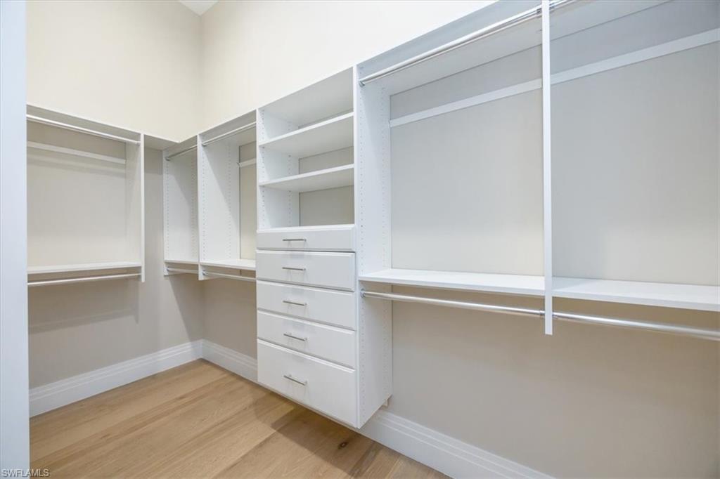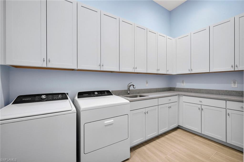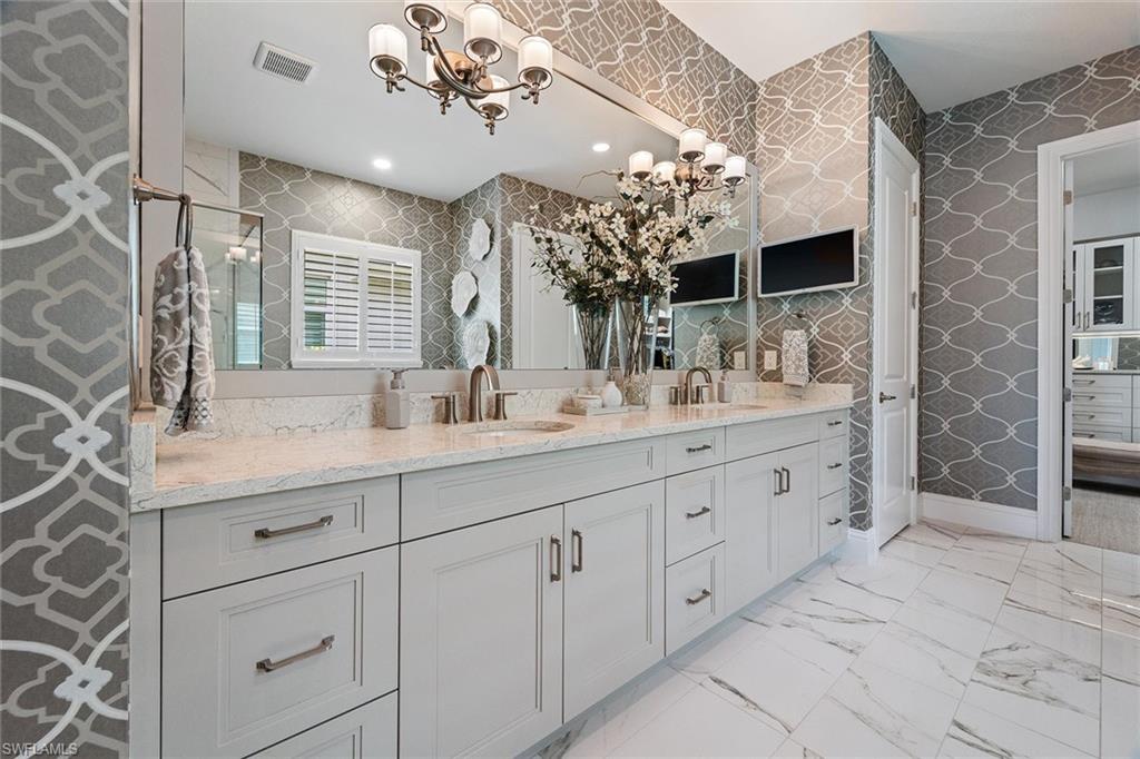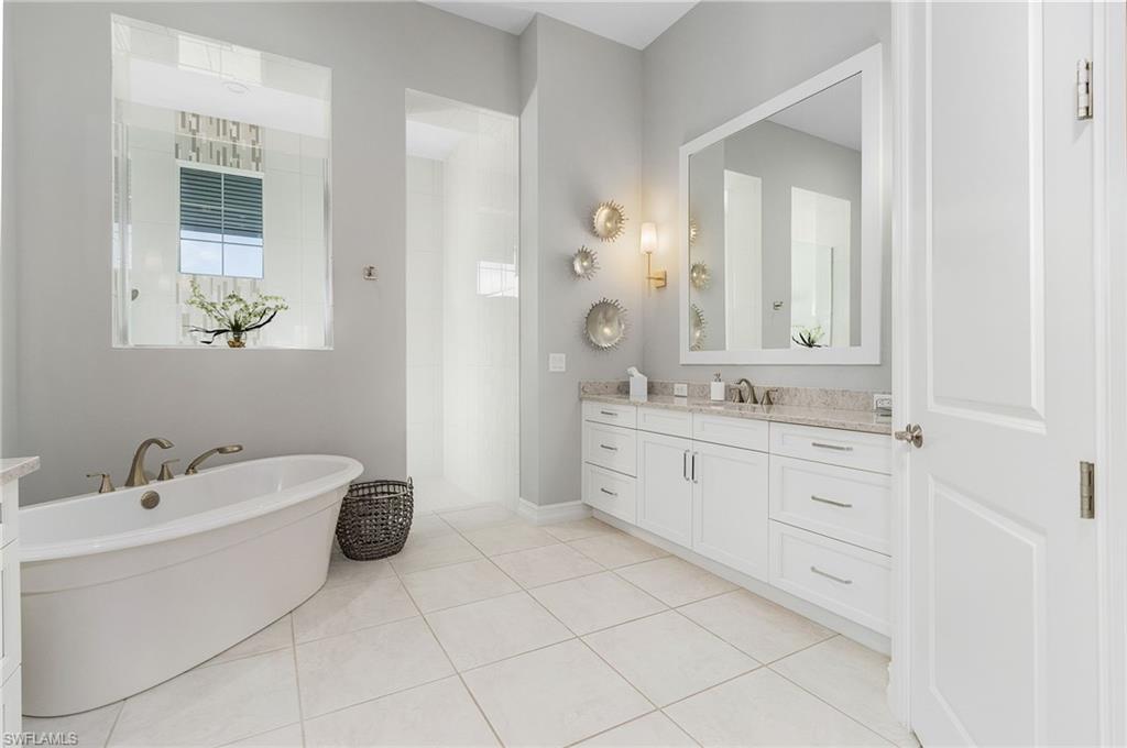 Coastal luxury describes this spectacular new Stock Homes Madison Model on one of the best lots in Naples Reserve, offering panoramic lake views & nightly sunsets. This exquisite 4 bedroom plus den, 4.5-bathroom home dazzles with 16-foot ceilings adorned with custom woodwork, upscale designer lighting, 30-inch porcelain tile and Montage wood flooring. Plenty of room in this sizable laundry room with built-in cabinetry, with ensuite bathrooms in each guest room, state of the art Xfinity Home security system, air-conditioned two car garage, water purification system, an upgraded fiberglass Advisar hurricane impact entry door, impact-resistant windows, plantation shutters, large white custom-built cornices ensconcing electronic shades and much more. The chef's kitchen is a masterpiece featuring quartz countertops, custom-designed pantry, top-of-the-line appliances, and extensive cabinetry. Enjoy entertaining under the crystal chandelier as you gaze out onto the serene lake. The master suite is a sanctuary with dual walk-in custom closets with quartz countertops and a spa-inspired bathroom, complete with a freestanding soaking tub and a walk-in shower enclosed in glass. All bedrooms feature custom upgraded closets and wood flooring. The expansive lanai is an outdoor paradise, boasting a panoramic sixty-foot pull screen for unobstructed views, generous lounging and dining spaces with marble pavers, and a fully equipped outdoor kitchen with an expansive granite wall and Vintage grill. The living room boasts a navy shiplap feature wall with all bedrooms with upgraded fans. The outside facade of the house also features genuine shiplap and Coppersmith sconces with African orchids and expansive tropical landscaping with upgraded irrigation system. The garage and finished attic are insulated with climate control and feature custom organization and cabinetry. Residents of Naples Reserve enjoy access to a state-of-the-art fitness center, a resort-style lakefront pool and beach, two dog parks, bocce, tennis, pickleball courts, dining options, walking and biking trails, a childrens play area, and 22 lakes for a wide array of water sports.