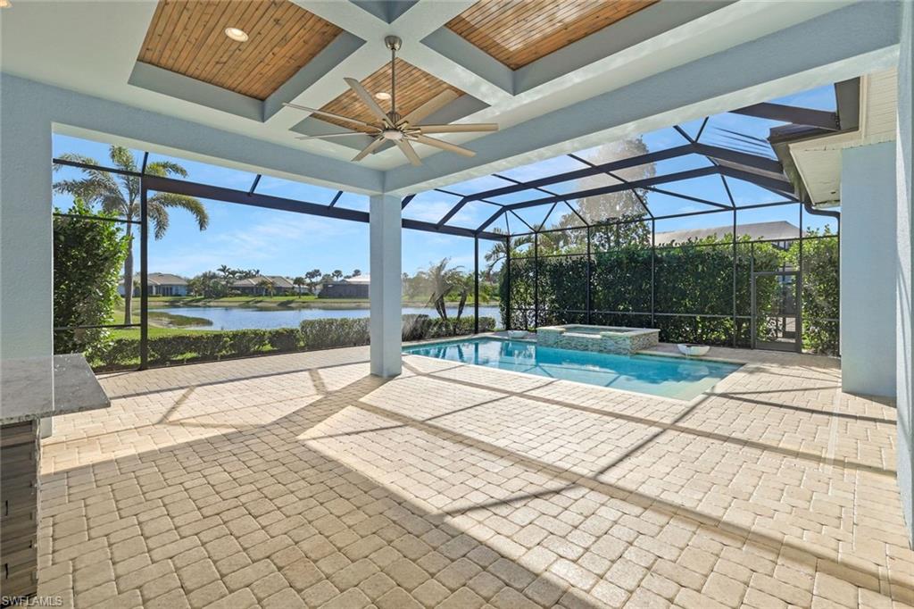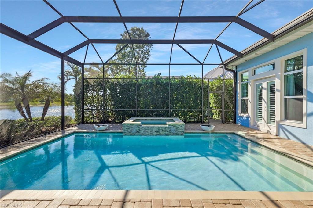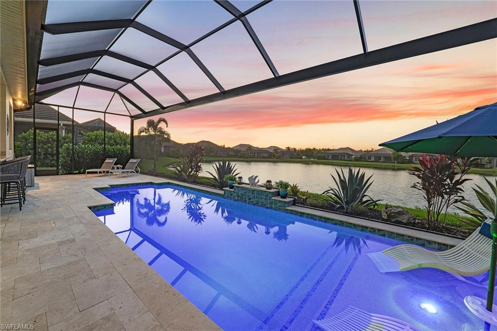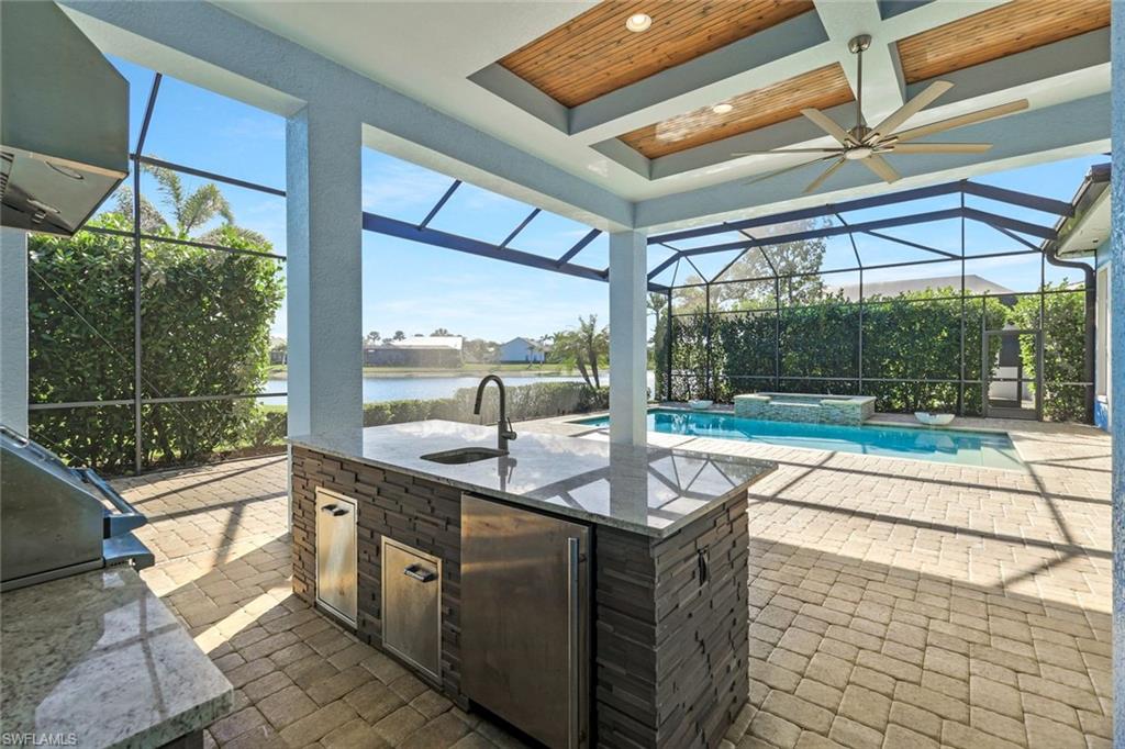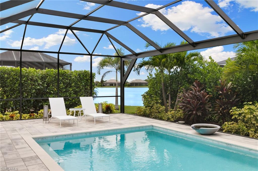 Situated on a Premium Lakefront lot in Naples Reserve, this Beautiful Marathon by Stock Construction has fabulous wide lake views. Enjoy the luxurious lifestyle of this Contemporary open floor plan home with 3 bedrooms plus a den with beautiful Built-in Cabinets, 3.5 baths & 3 car garage with over $$450,000+ in upgrades done after Build!!! The Custom kitchen boasts pullout drawers, a walk-in pantry with electricity & area for small appliances so they won't clutter the countertops, Bosch induction cooktop that heats in seconds, Bosch refrig/freezer and a large island with Cambria Quartz waterfall edges. Electrical outlets are hidden under custom upper cabinets, Elegant 24"x48" Matched Porcelain tile floors run throughout the main areas & master bedroom. Relax in the solar & electric heated Saltwater pool & infinity Jacuzzi surrounded by imported Turkish stone tiles thruout the patio & outdoor Kitchen and covered by a large Picture Window Noseeum screen. Savor the beauty of the custom-designed landscaping. The Kitchen cabinets & appliances, Porcelain Tile Flooring, Pool and Outdoor Kitchen & builtin cabinets were added after closing! Naples Reserve is one of the most desirable neighborhoods in Naples & provides outstanding amenities including a clubhouse, lakefront beach, Marina, fabulous lakes with electric boat & Cafe, Tiki bar with fire pit, fitness center, beach-style pool, tennis, Bocce and pickleball courts, walking and jogging paths, boating, dog parks, and kids' play area. Build your own BOAT DOCK on your property! Don't lose this opportunity to live in 1 of the loveliest cities in the USA!