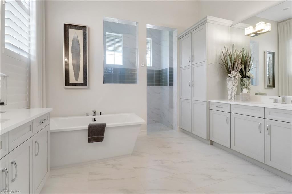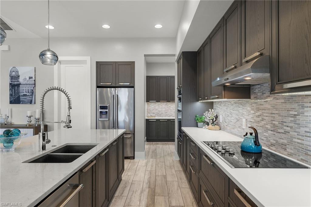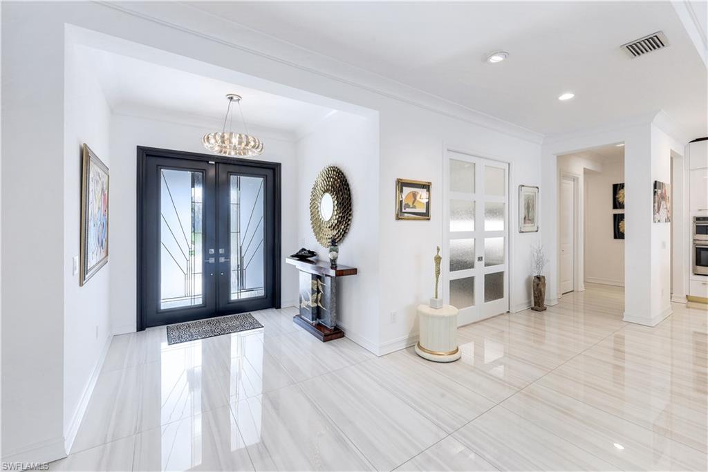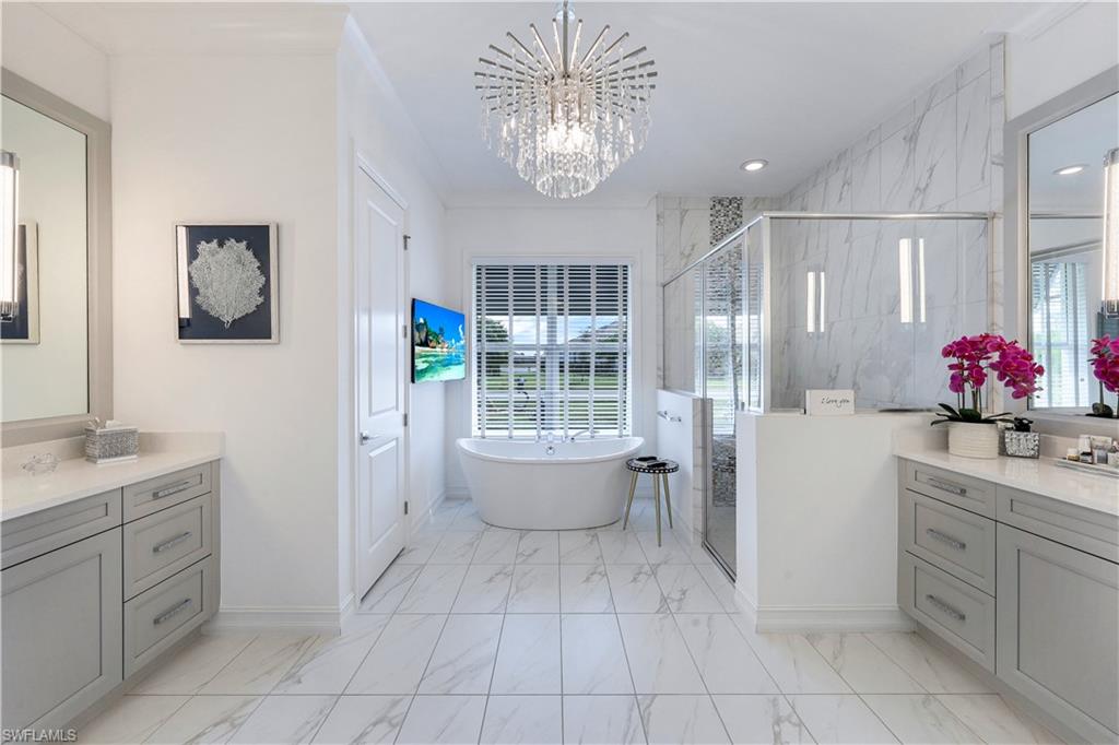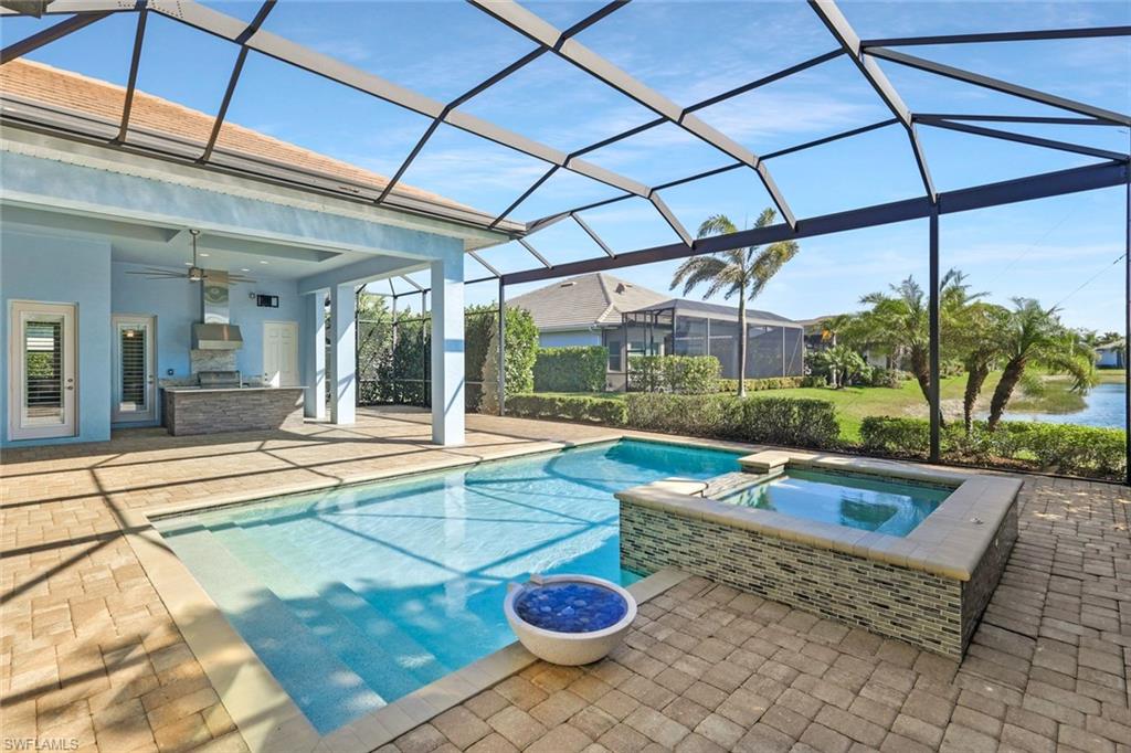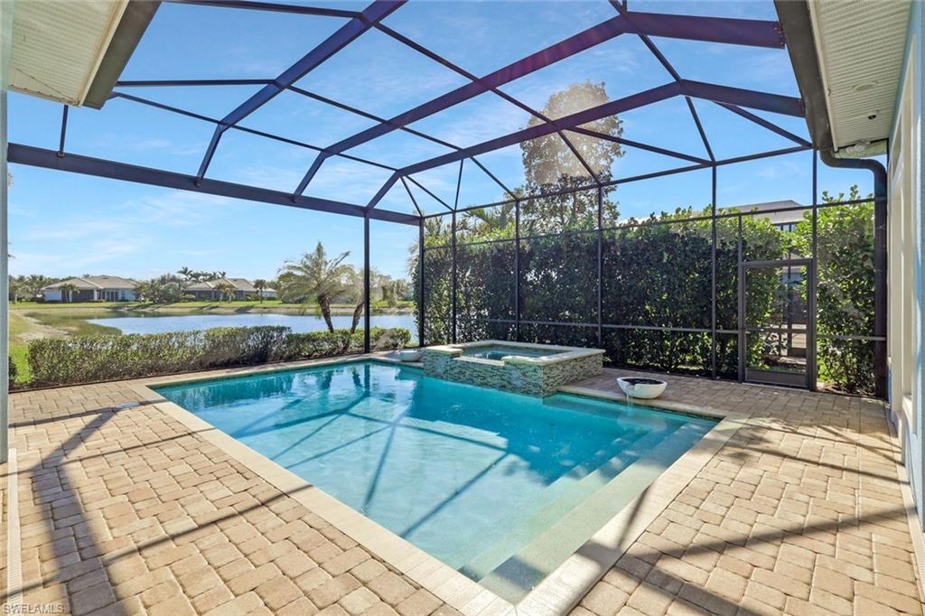 Situated on a Premium Lakefront lot in Naples Reserve, this Beautiful Marathon by Stock Construction has fabulous wide lake views. Enjoy the luxurious lifestyle of this Contemporary open floor plan home with 3 bedrooms plus a den with beautiful Built-in Cabinets, 3.5 baths & 3 car garage with over $$450,000+ in upgrades done after Build!!! The Custom kitchen boasts pullout drawers, a walk-in pantry with electricity & area for small appliances so they won't clutter the countertops, Bosch induction cooktop that heats in seconds, Bosch refrig/freezer and a large island with Cambria Quartz waterfall edges. Electrical outlets are hidden under custom upper cabinets, Elegant 24"x48" Matched Porcelain tile floors run throughout the main areas & master bedroom. Relax in the solar & electric heated Saltwater pool & infinity Jacuzzi surrounded by imported Turkish stone tiles thruout the patio & outdoor Kitchen and covered by a large Picture Window Noseeum screen. Savor the beauty of the custom-designed landscaping. The Kitchen cabinets & appliances, Porcelain Tile Flooring, Pool and Outdoor Kitchen & builtin cabinets were added after closing! Naples Reserve is one of the most desirable neighborhoods in Naples & provides outstanding amenities including a clubhouse, lakefront beach, Marina, fabulous lakes with electric boat & Cafe, Tiki bar with fire pit, fitness center, beach-style pool, tennis, Bocce and pickleball courts, walking and jogging paths, boating, dog parks, and kids' play area. Build your own BOAT DOCK on your property! Don't lose this opportunity to live in 1 of the loveliest cities in the USA!