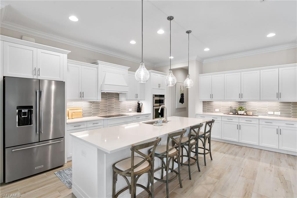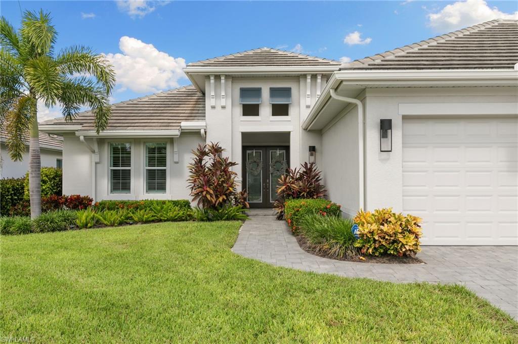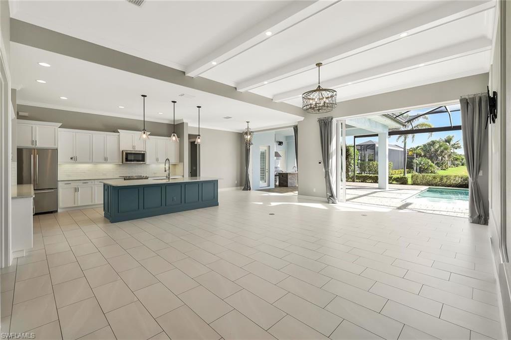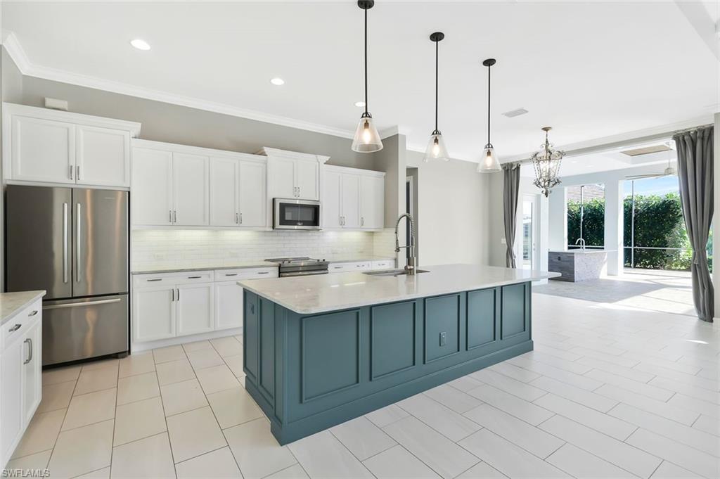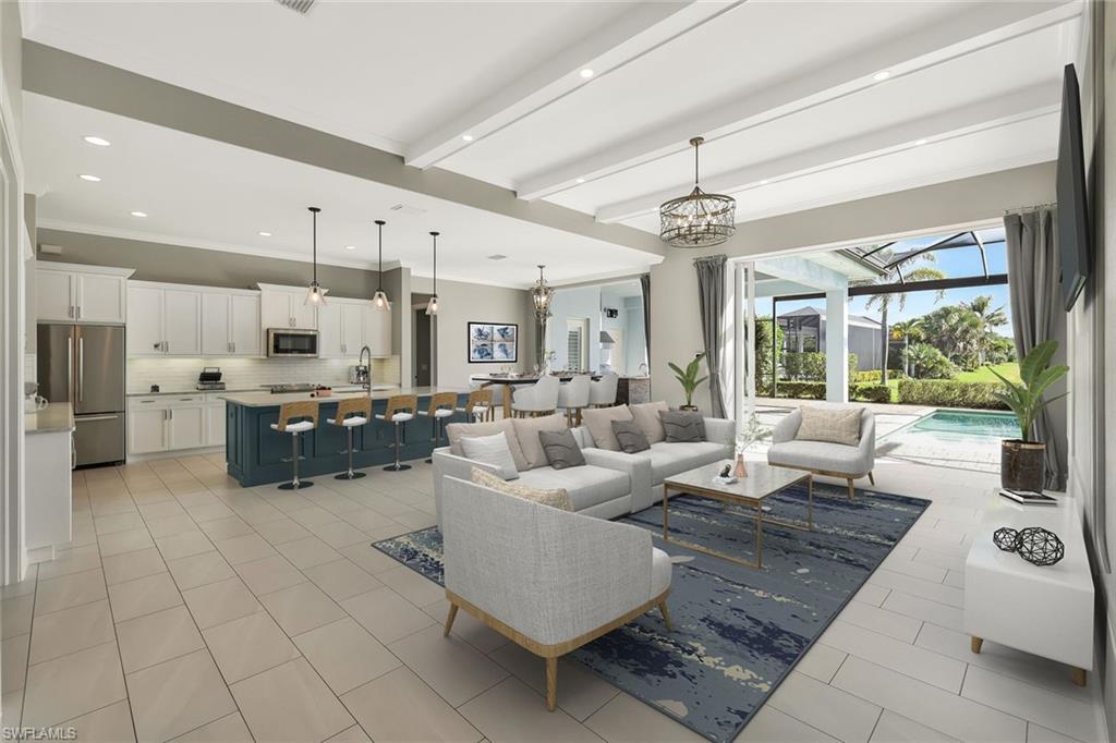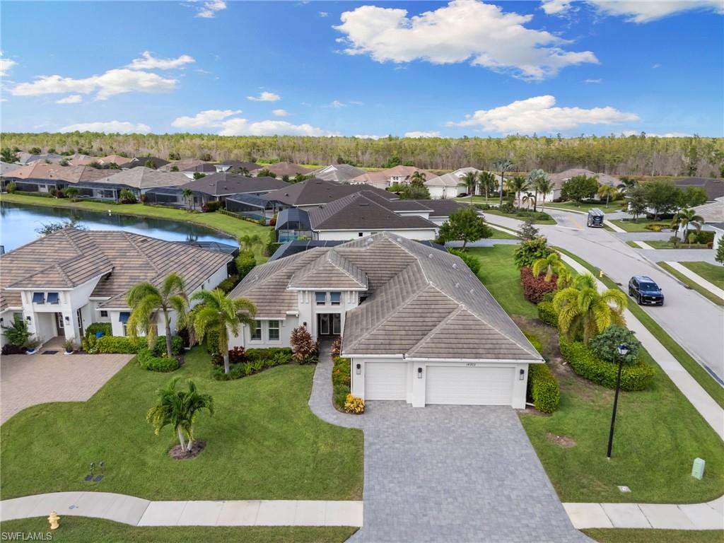 Experience a balance of style, comfort and craftsmanship in this beautifully designed home by Stock Development, ideally on a premium pie-shaped waterfront lot in the resort-inspired community of Naples Reserve. From the moment you arrive, you’ll appreciate the inviting curb appeal, spacious layout, and the seamless connection between indoor and outdoor living. Inside, the home offers four bedrooms and three full baths, each designed with refined finishes and thoughtful details. The gourmet kitchen is the heart of the home, complete with sleek cabinetry, high-end appliances, an oversized island and custom lighting that creates a warm, elegant ambiance for everyday living and entertaining. Flowing effortlessly from the kitchen is the great room, where expansive windows and impact glass doors frame the tranquil water views beyond. The primary suite is a serene retreat featuring a spa-like bath with a floating soaking tub, dual vanities and a generously sized walk-in closet. Each additional bedroom provides comfort and privacy, while the tile-to-ceiling detail in every bath adds an elevated designer touch. Throughout the home, you’ll find crown molding, premium finishes and an attention to detail that sets this residence apart. Go outside to discover an outdoor oasis, an expansive travertine pool deck overlooking the water, featuring a heated saltwater pool, custom outdoor kitchen and multiple areas to relax, dine or entertain under the Florida sun. Whether hosting gatherings with friends or enjoying a quiet evening by the water, this space is designed for unforgettable moments. Additional highlights include a three-car garage with insulated doors, added attic insulation and custom storage racks, ensuring efficiency and functionality. The home’s impact glass windows and doors provide peace of mind and energy efficiency year-round. In Naples Reserve, residents enjoy access to a vibrant lifestyle surrounded by stunning lakes, lush landscapes and exceptional amenities including a resort-style pool, fitness center, tennis, pickleball, boating and the popular Island Club.