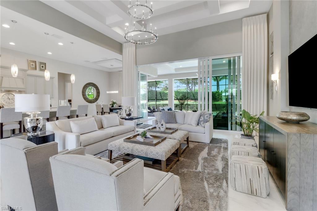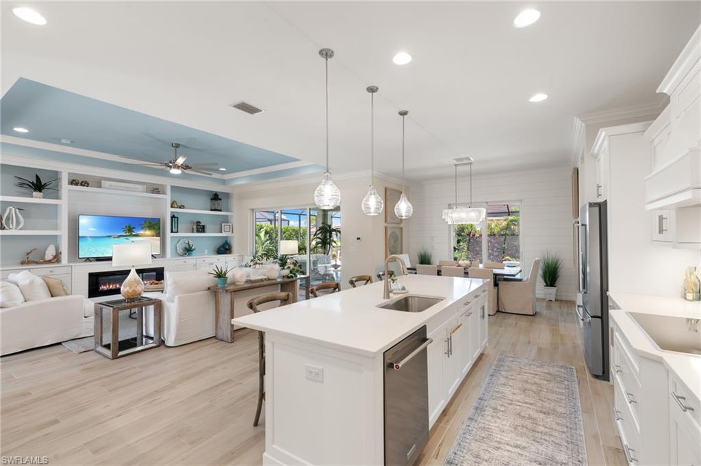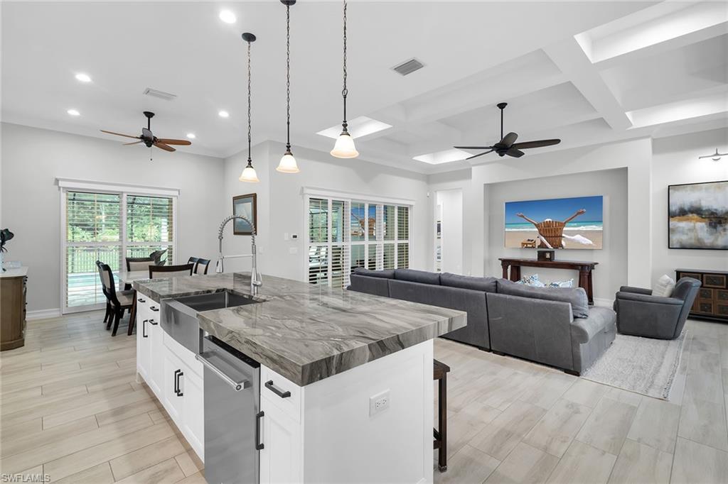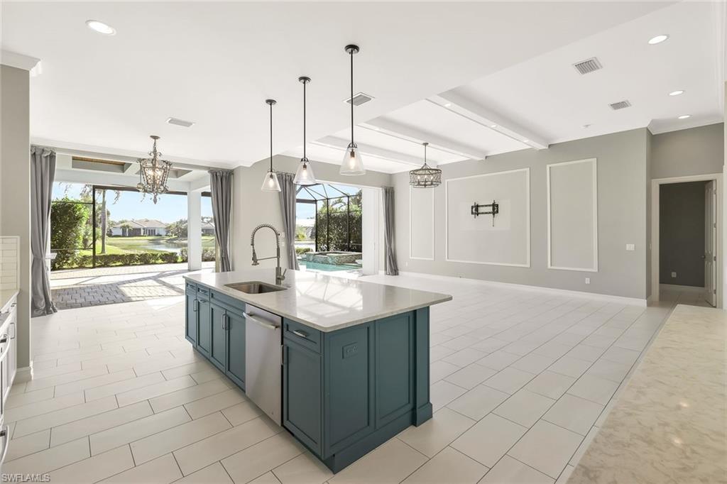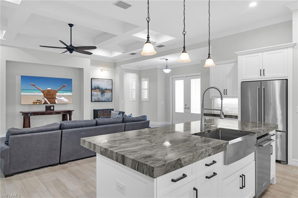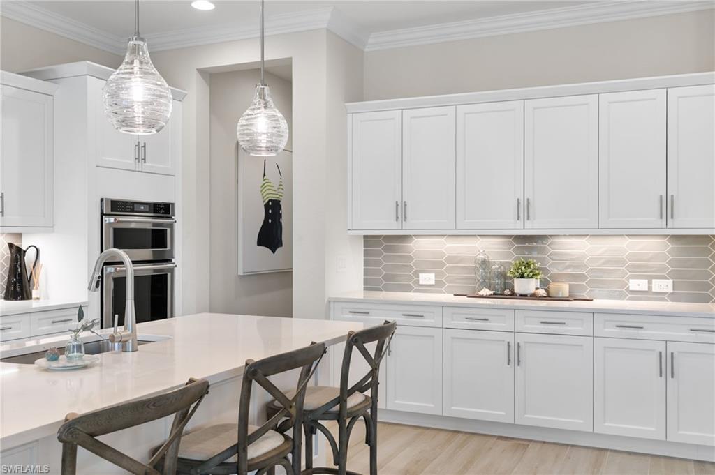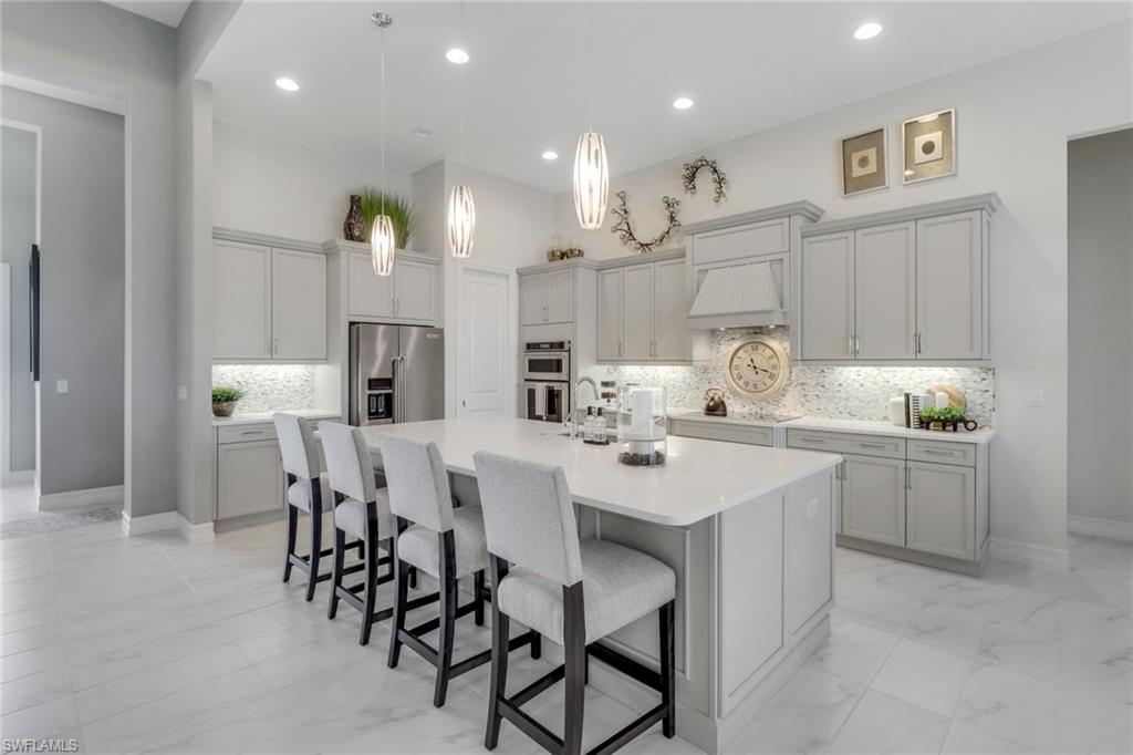 Experience a balance of style, comfort and craftsmanship in this beautifully designed home by Stock Development, ideally on a premium pie-shaped waterfront lot in the resort-inspired community of Naples Reserve. From the moment you arrive, you’ll appreciate the inviting curb appeal, spacious layout, and the seamless connection between indoor and outdoor living. Inside, the home offers four bedrooms and three full baths, each designed with refined finishes and thoughtful details. The gourmet kitchen is the heart of the home, complete with sleek cabinetry, high-end appliances, an oversized island and custom lighting that creates a warm, elegant ambiance for everyday living and entertaining. Flowing effortlessly from the kitchen is the great room, where expansive windows and impact glass doors frame the tranquil water views beyond. The primary suite is a serene retreat featuring a spa-like bath with a floating soaking tub, dual vanities and a generously sized walk-in closet. Each additional bedroom provides comfort and privacy, while the tile-to-ceiling detail in every bath adds an elevated designer touch. Throughout the home, you’ll find crown molding, premium finishes and an attention to detail that sets this residence apart. Go outside to discover an outdoor oasis, an expansive travertine pool deck overlooking the water, featuring a heated saltwater pool, custom outdoor kitchen and multiple areas to relax, dine or entertain under the Florida sun. Whether hosting gatherings with friends or enjoying a quiet evening by the water, this space is designed for unforgettable moments. Additional highlights include a three-car garage with insulated doors, added attic insulation and custom storage racks, ensuring efficiency and functionality. The home’s impact glass windows and doors provide peace of mind and energy efficiency year-round. In Naples Reserve, residents enjoy access to a vibrant lifestyle surrounded by stunning lakes, lush landscapes and exceptional amenities including a resort-style pool, fitness center, tennis, pickleball, boating and the popular Island Club.