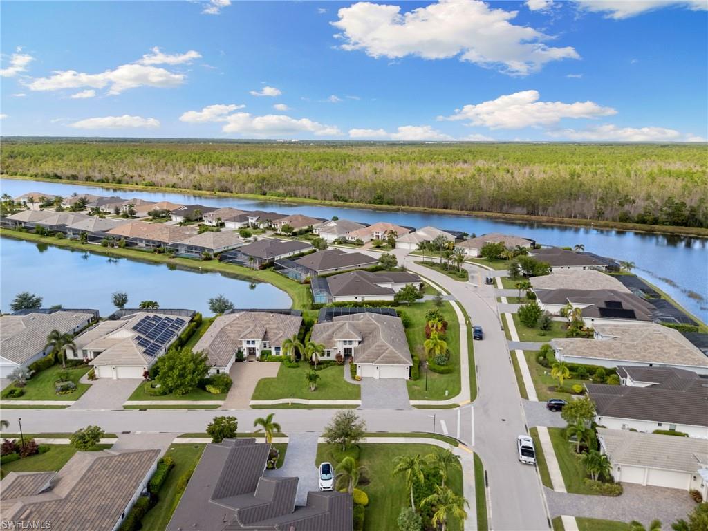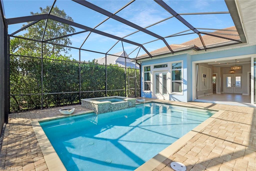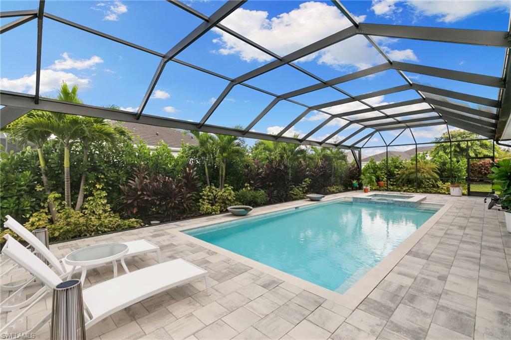 Discover your tropical retreat in Naples Reserve's coveted Canoe Landing. This stunning Stock Development home sits on a beautifully landscaped corner lot and showcases over $220k in builder upgrades. Enjoy your own private paradise with an oversized resort-style pool (14 X 29) and spa (6 X 6), surrounded by botanical garden-style landscaping and breathtaking long lake sunset views. Additional highlights include: Storm smart screens, garage mini split system, plantation shutters, custom family room built-in with fireplace, custom closets, a coffee bar in walk-in pantry and overhead storage racks in the garage. All this is found within Naples' premier resort community, offering an exceptional lifestyle of beauty, privacy, and relaxation. *NO FLOOD INSURANCE REQUIRED-LOMR on record!