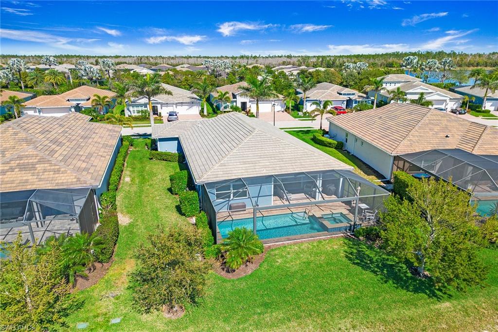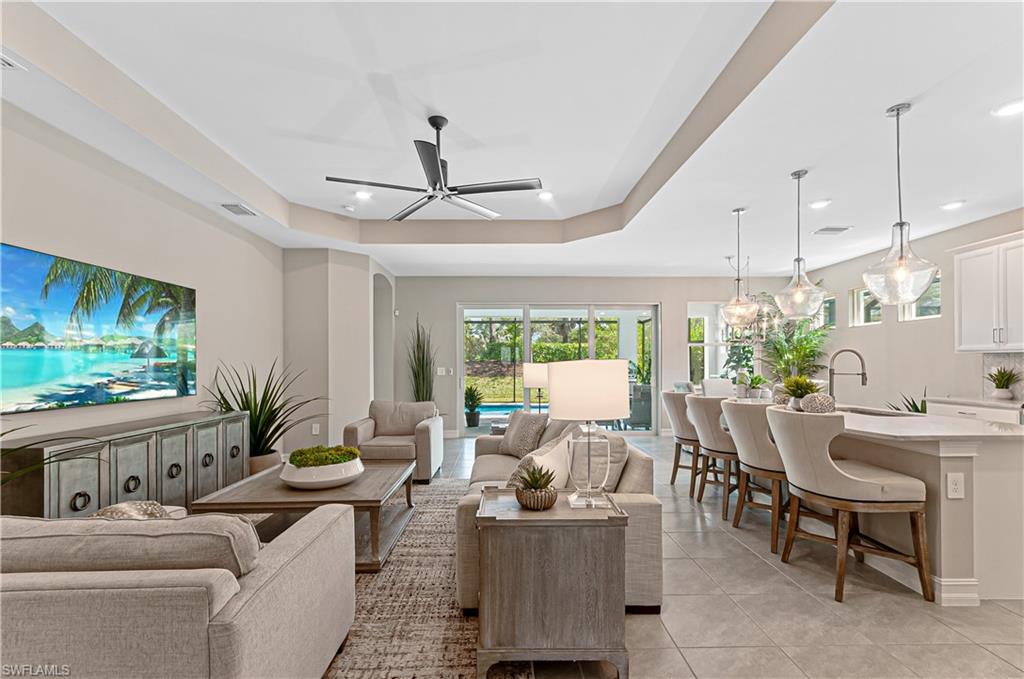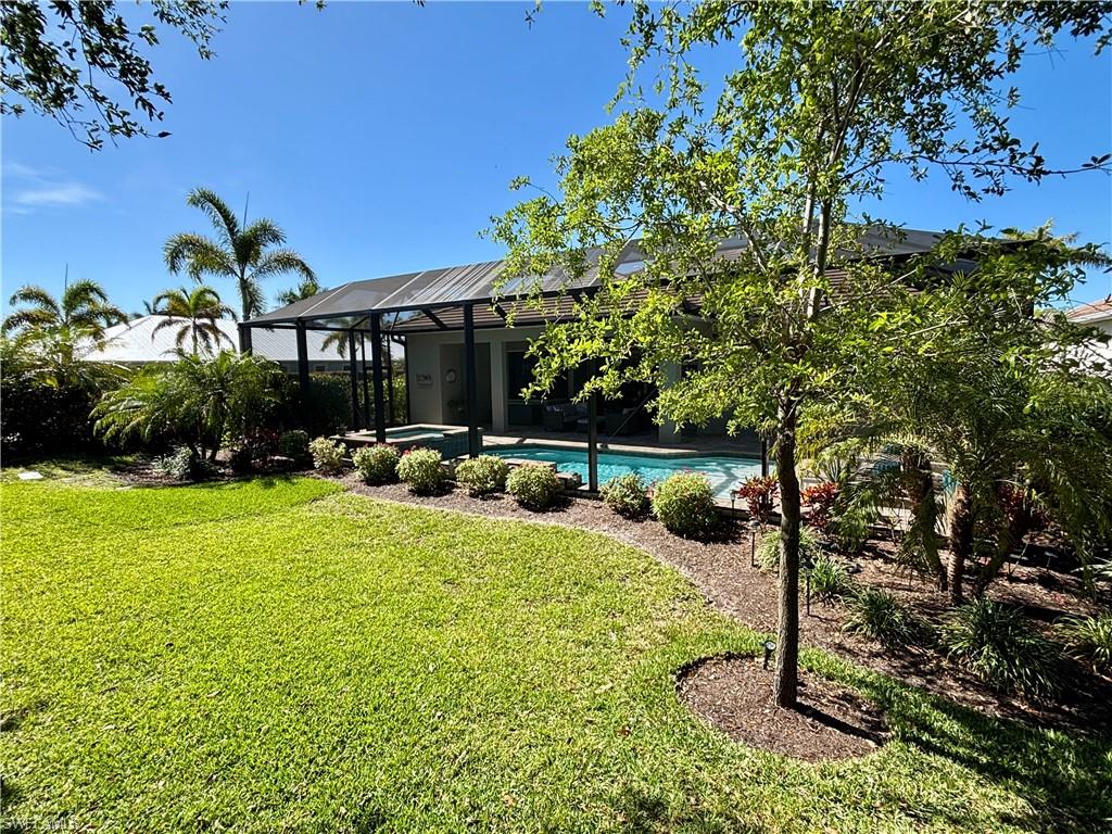 In Naples Reserve, this coastal-style ranch residence offers 3,368 square feet of thoughtfully designed living space on an oversized corner homesite. Built in 2018 and lightly used as a vacation home, the residence provides exceptional privacy and expanded views of beautifully maintained landscaping. The open-concept floor plan includes three bedrooms plus a den, two full baths, and one half bath. The spacious primary suite features direct access to the lanai, dual walk-in closets, and an en-suite bath. The island kitchen is outfitted with white cabinetry, stone countertops, a walk-in pantry and an adjacent dining area ideal for entertaining. Tile flooring extends through all main living areas. The living room opens to a screened lanai with sliding glass doors that frame the custom outdoor retreat, complete with a pool, spa with spillover, built-in outdoor kitchen, bar seating, and dedicated lounge and dining spaces. Electric roll-down storm screens provide convenience and added protection. Additional highlights include a three-car garage, ample storage and hurricane-rated construction. The home is positioned in proximity to the Island Club, the centerpiece of the community’s amenities. Naples Reserve is a gated, amenity-rich community featuring a large lakefront clubhouse, beach-entry resort pool, state-of-the-art fitness center, tiki bar and grill, tennis and pickleball courts, bocce and on-water recreation. Miles of sidewalks and outdoor fitness stations encourage an active lifestyle. Lawn care and landscaping are included in the community’s low association fees. Between downtown Naples and Marco Island, this residence provides convenient access to top-tier shopping, fine dining, white sand beaches and cultural attractions.